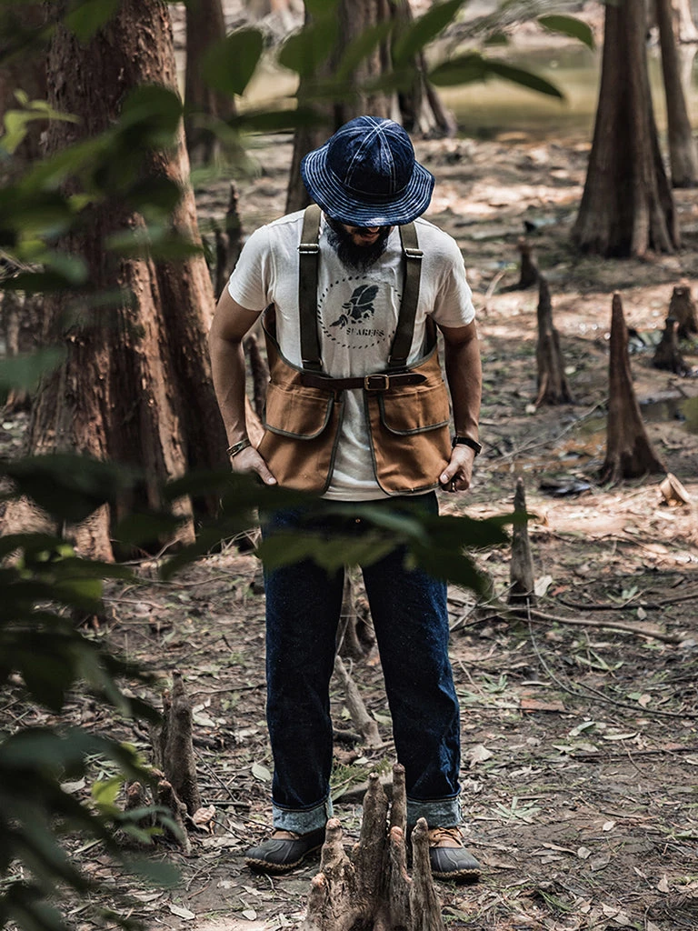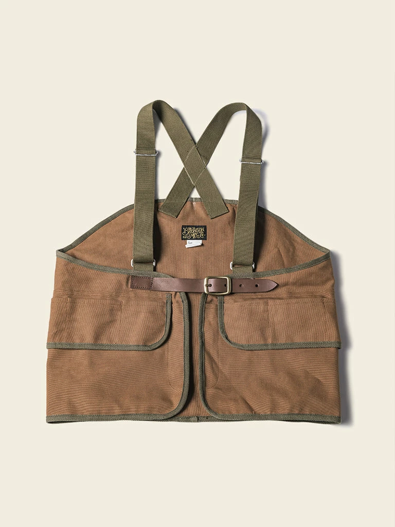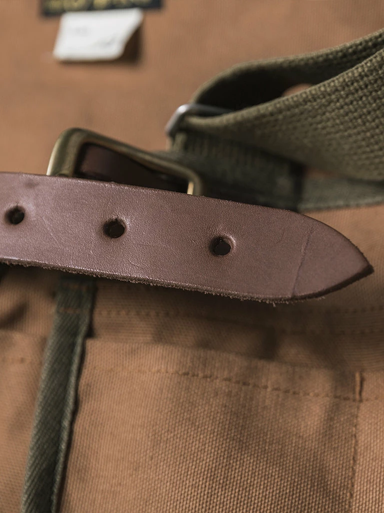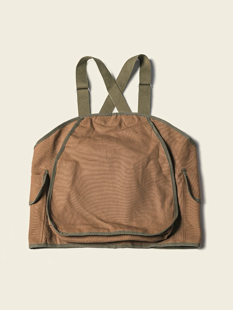 Our canvas hunting vest is also based on products in this period. The main part is made of yellow heavyweight canvas. The edges are covered with military green knitted fabric, matching the shoulder straps that can be adjusted in length to meet different outdoor needs.