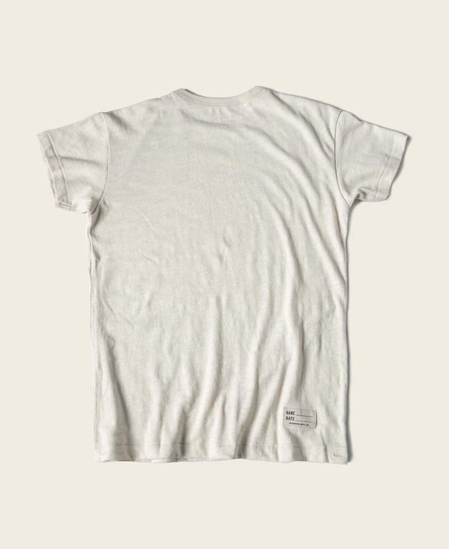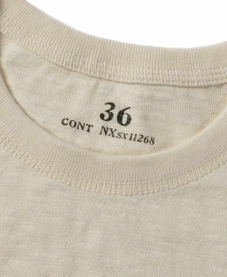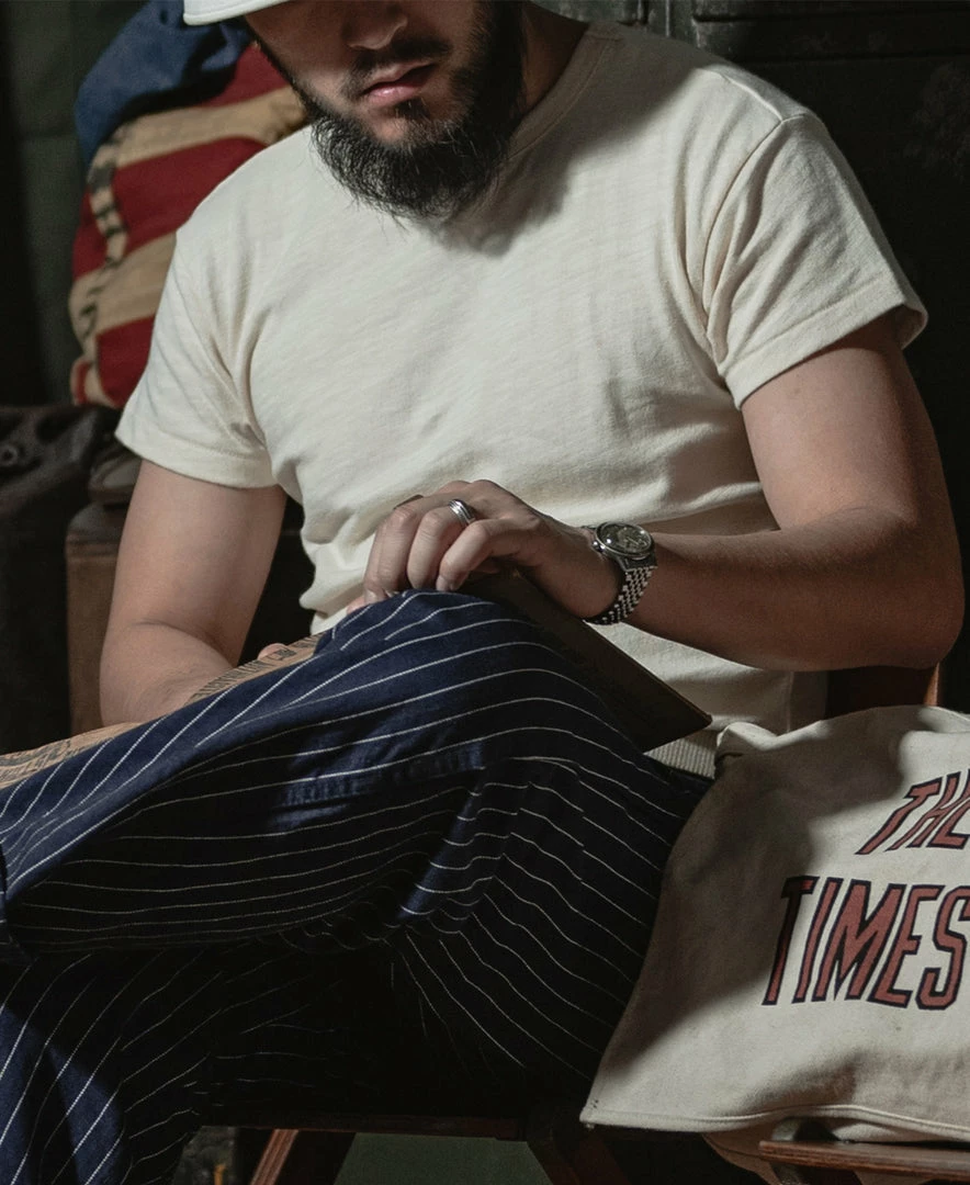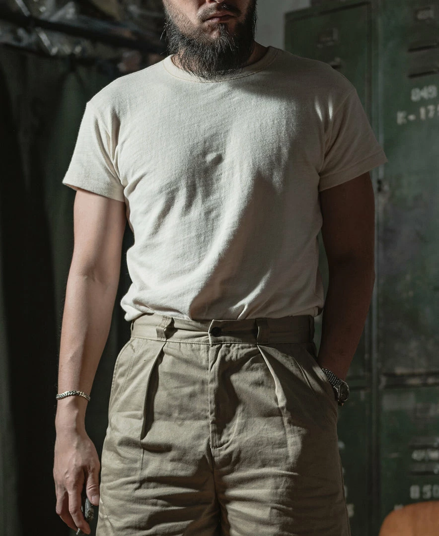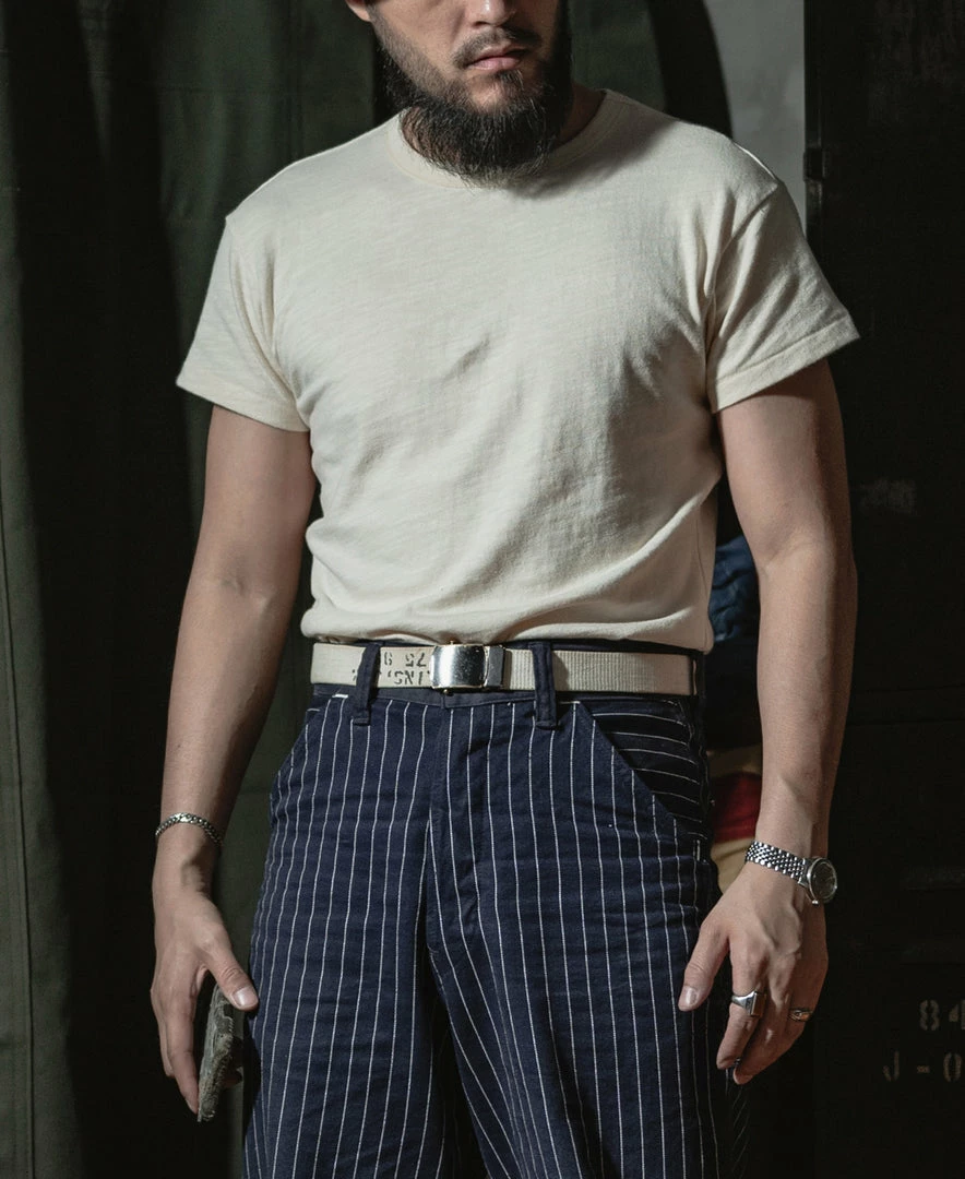 The T-shirt is based on the USN training undershirt from the 1940s and has been optimized for the shape. It is made of custom 8 oz. cotton bamboo slub fabric, which has a strong texture and works well in moisture absorption and sweat. It is available in “Seabees” print and basic versions. This T-shirt is a plain version.