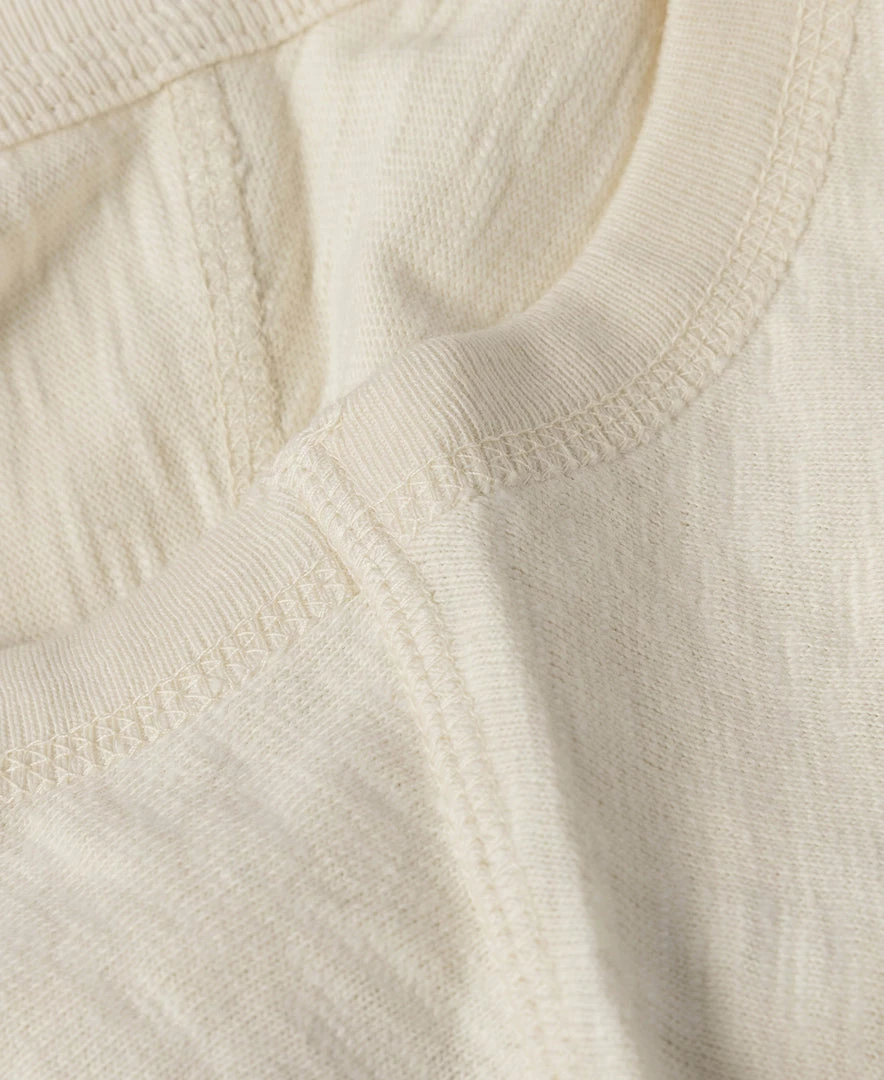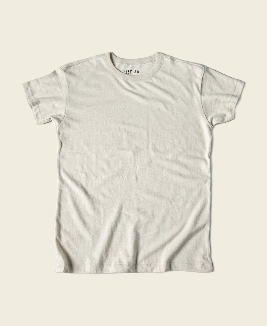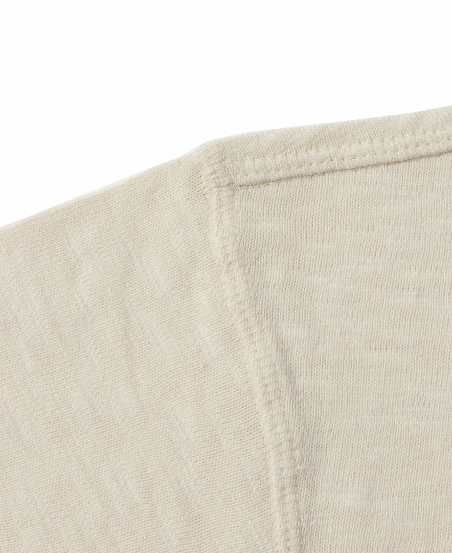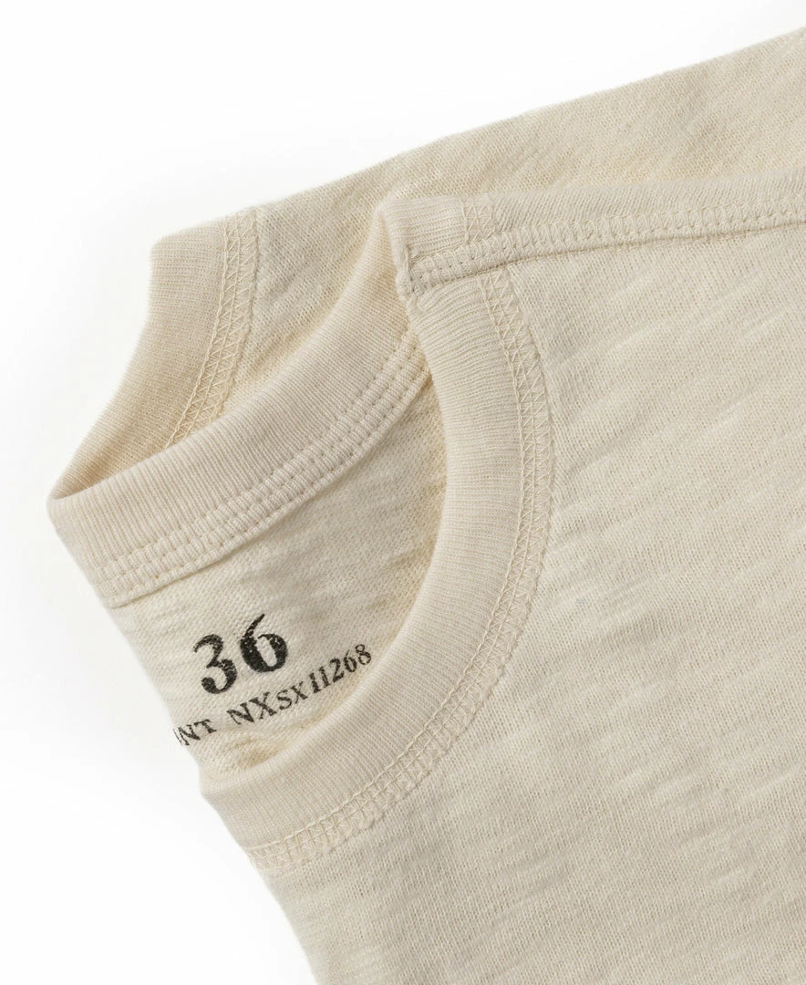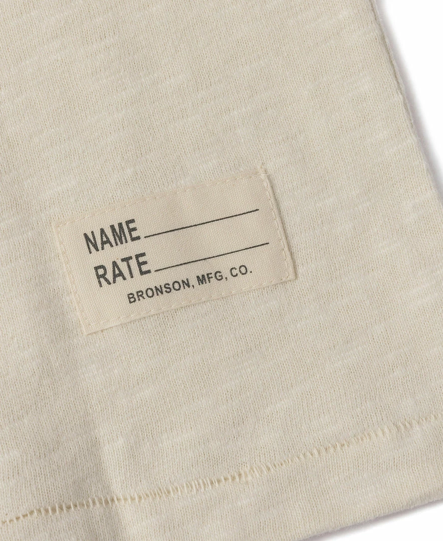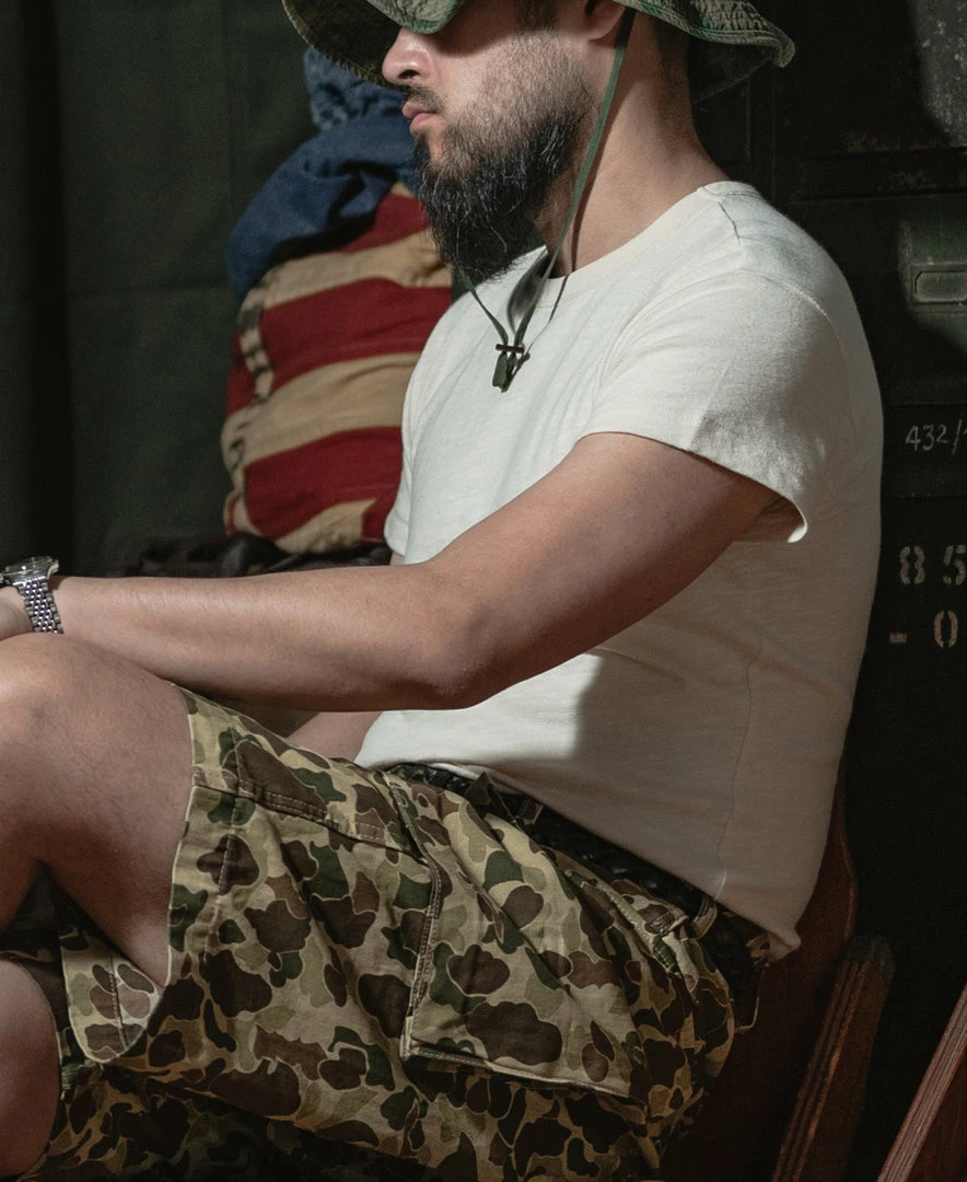 The T-shirt is based on the USN training undershirt from the 1940s and has been optimized for the shape. It is made of custom 8 oz. cotton bamboo slub fabric, which has a strong texture and works well in moisture absorption and sweat. It is available in “Seabees” print and basic versions. This T-shirt is a plain version.