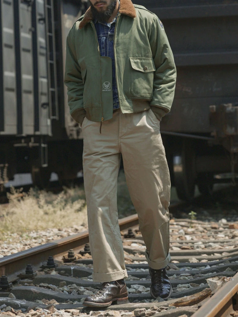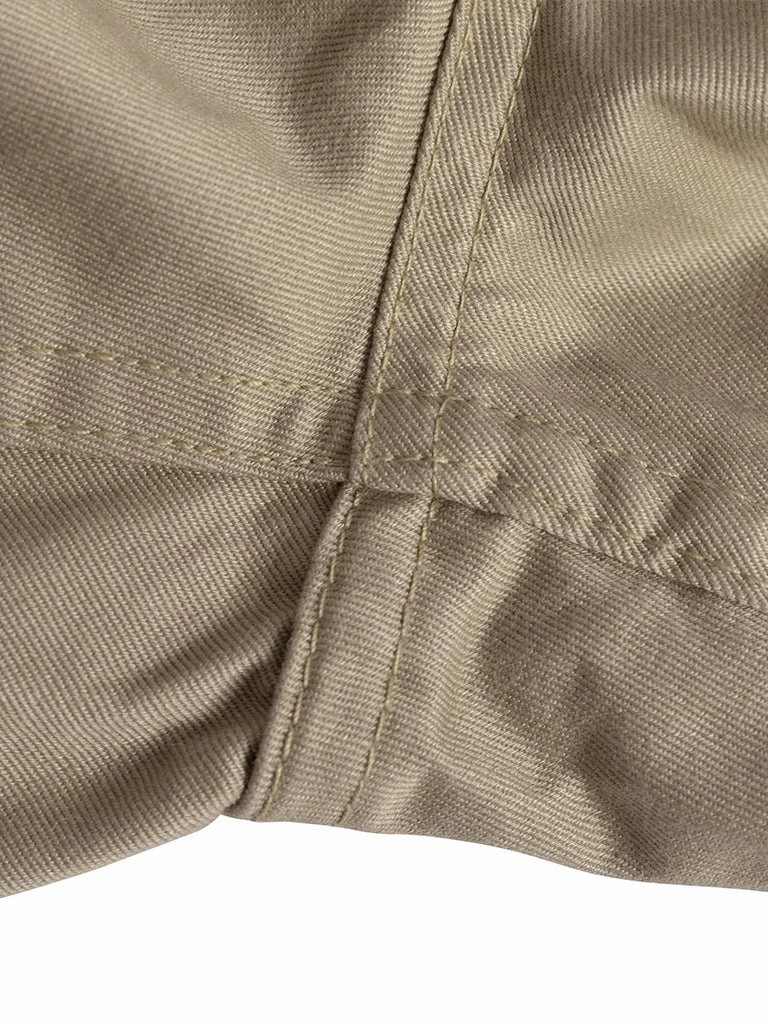This is a reproduction of the 1942 version, and it features are double welted pockets, and twin-needle chain stitch craft. It comes in 11.5 oz of high-density single-yarn drill fabric, which is very close to the texture of the original.