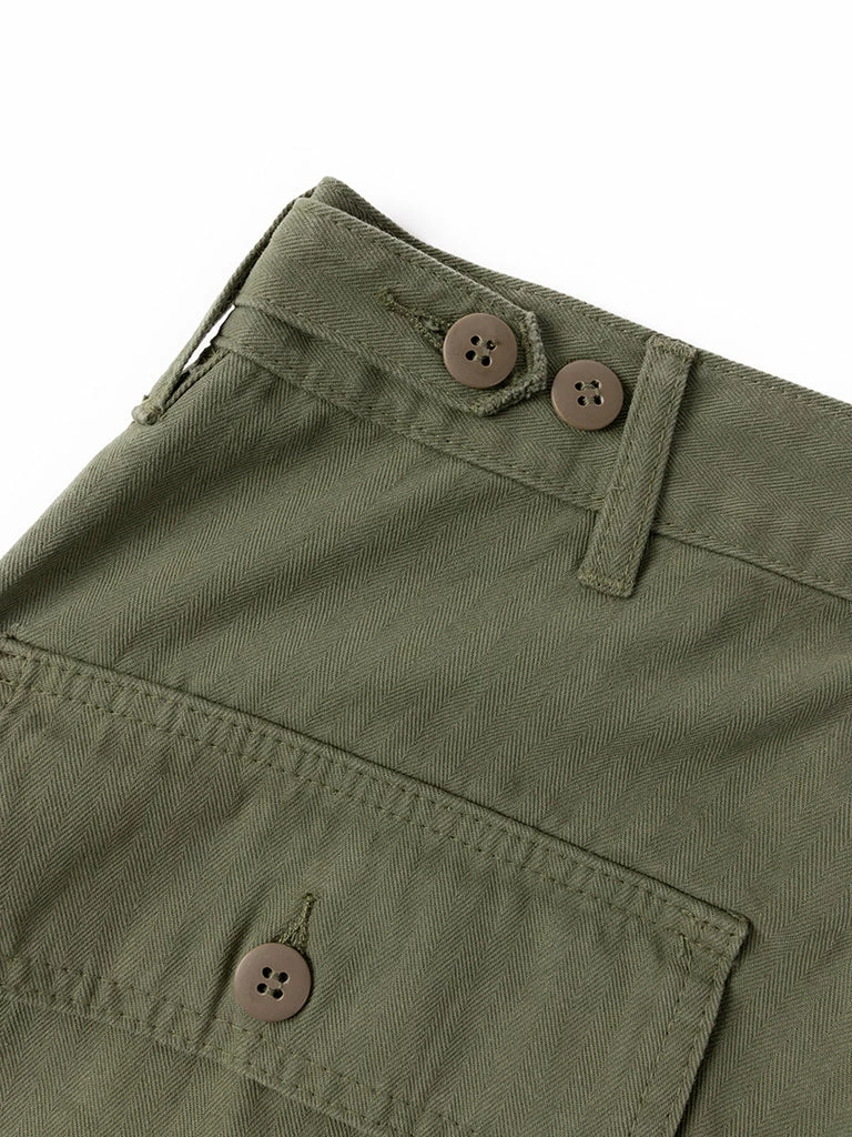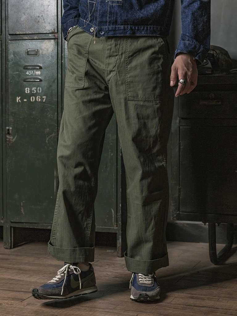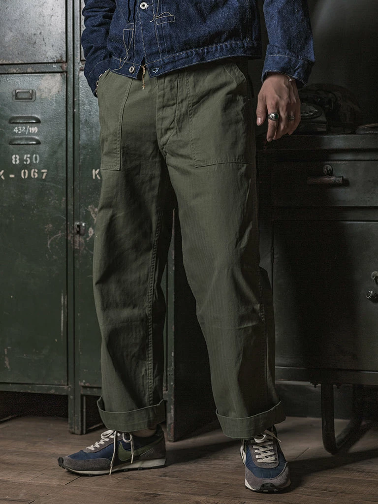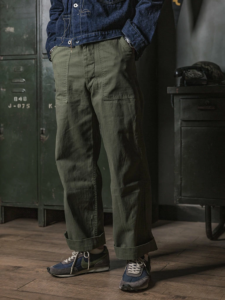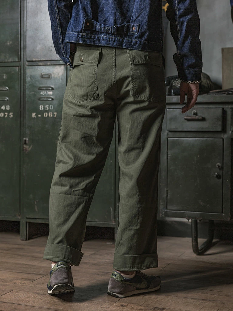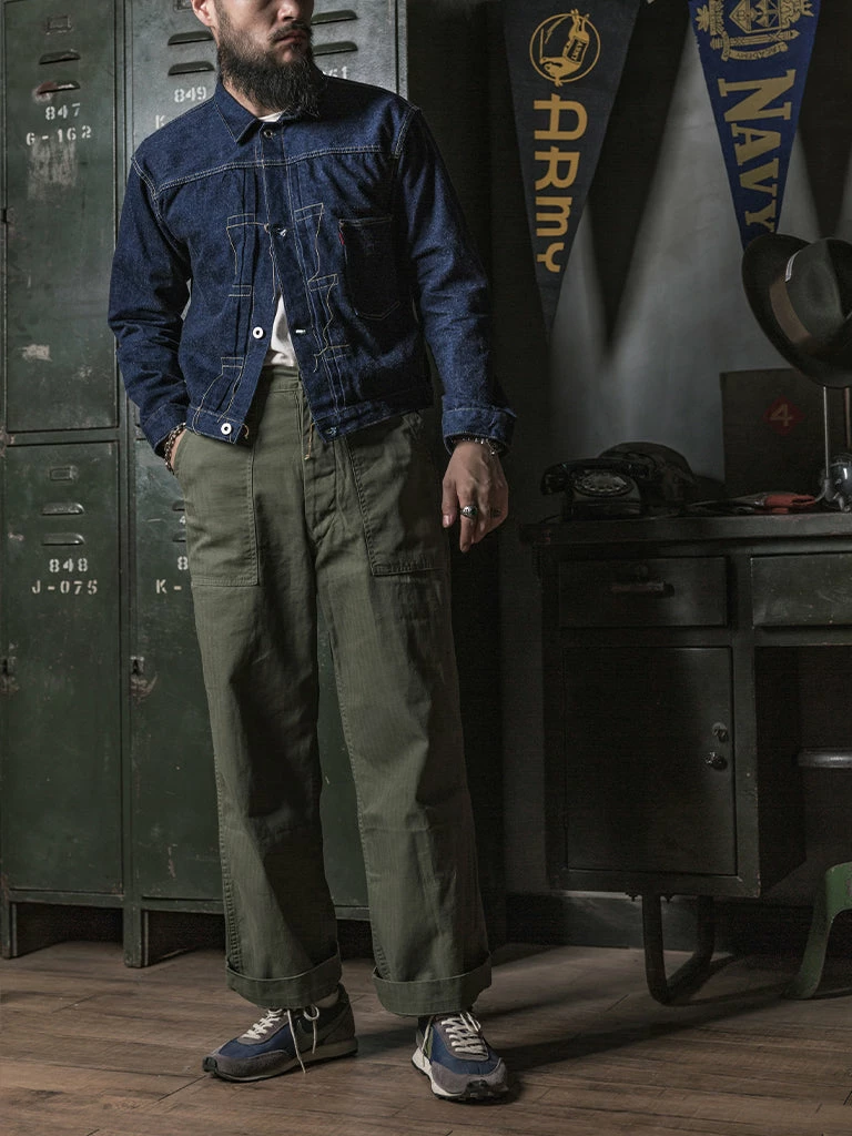 The 838A Fatigue Utility Pants were issued in 1947, its color number is OD7, used Herringbone twill (HBT) fabric widely used during world war II, with brown urea buttons or 13 stars buttons. The 838A Fatigue Utility Pants are the OG107 Fatigue Utility Pants prototypes, and their design is precisely the same except for differences between fabric and color. At the same time, there is an HBT jacket (shirt) and 838 pants to match with, and This jacket is the prototype of the OG107 long-sleeved jacket.