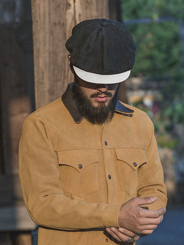 Sports locomotive hat derived from newsboy hat, same dome, flat cap. The brim of this hat is stiff, and it’s cool to wear. Because the fabric is stiff, you need to push the material forward after wearing it to look smoother. Combination of front and brim with snap closure, If you open this button and pull back the hat body, you can also make a shape similar to Brando’s “police hat.”