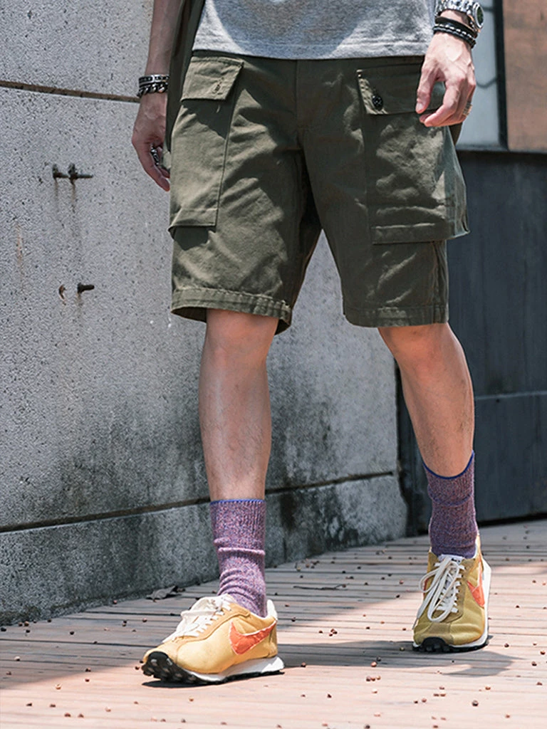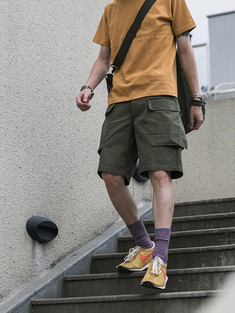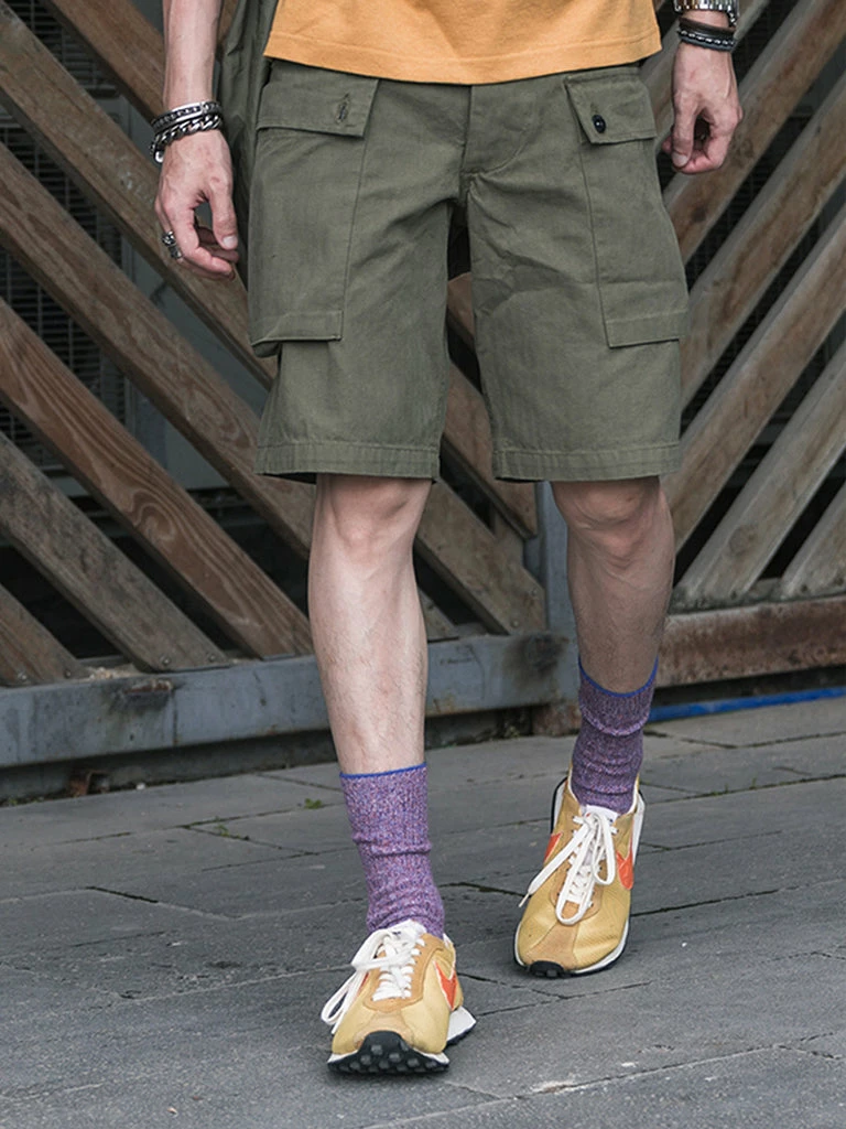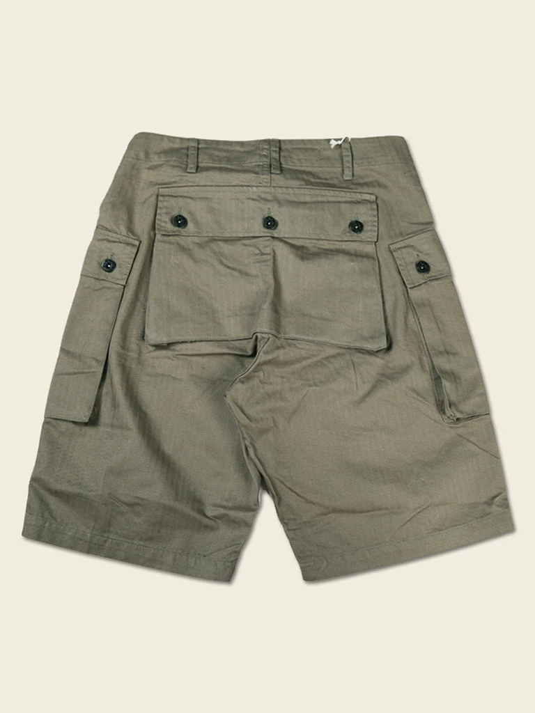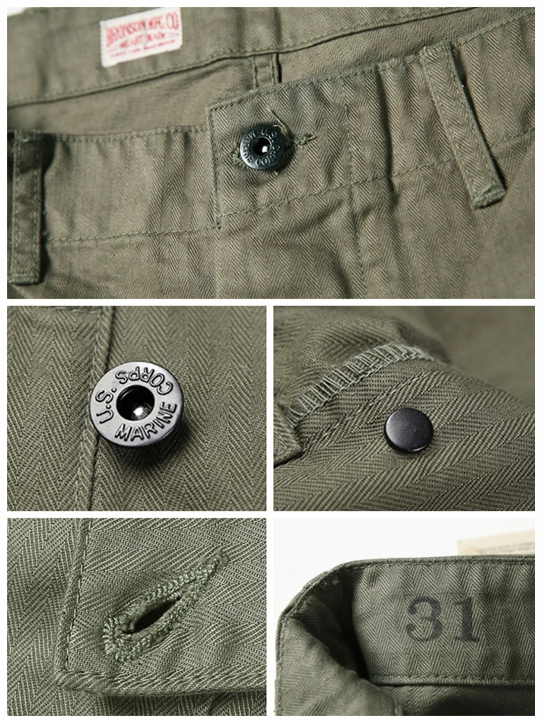 In 1944, USMC (US Marine Corps) started using the P-44 pants, also known as the “Monkey Pants.” They are the most well-known and distinctive trousers within the USMC. It significantly differs from the previous P-41 model with large cargo pockets on both the back and sides. The pockets on the sides were made large to fit k-ration boxes (military food rationing box), and the back pocket was to pack a camouflage poncho. With multiple pockets allowing a large amount of storage, reinforced holes were placed on the belt band to fit P-1941 suspenders to avoid the weight pulling marines trousers down.