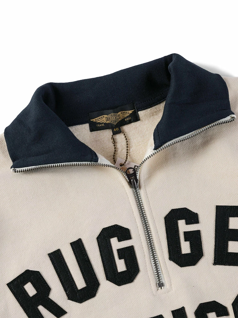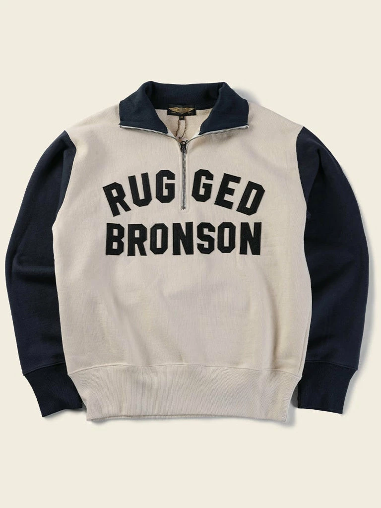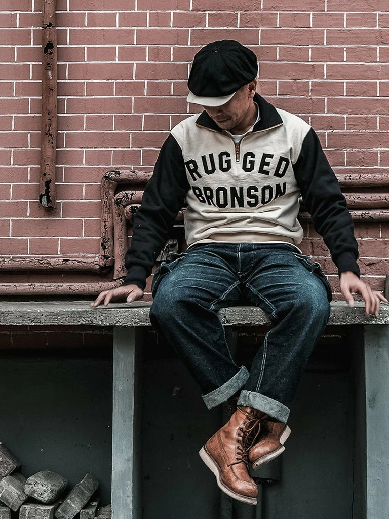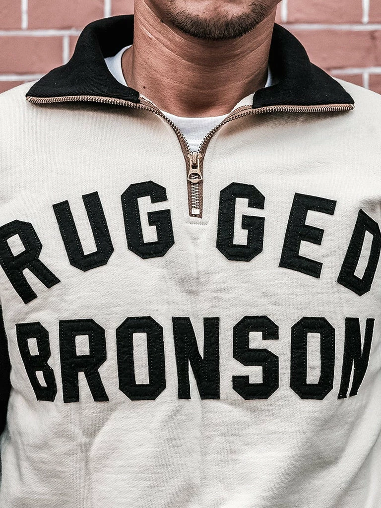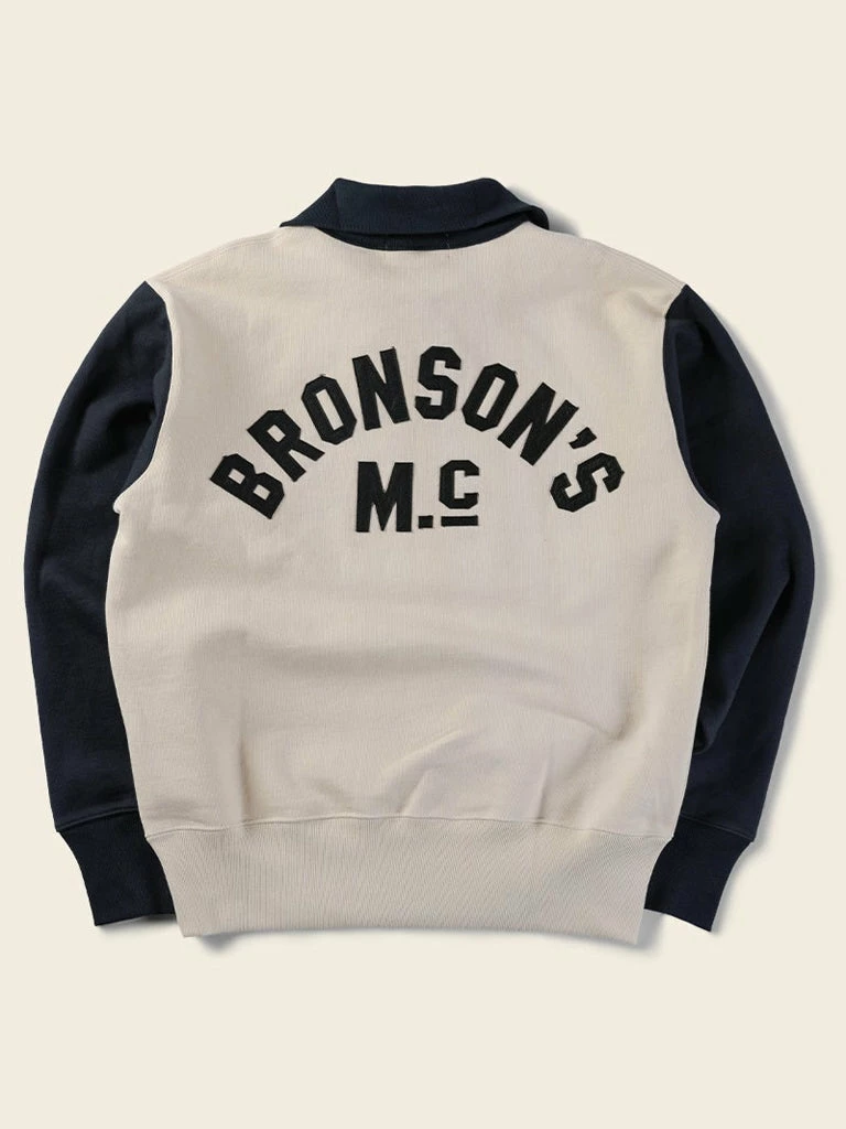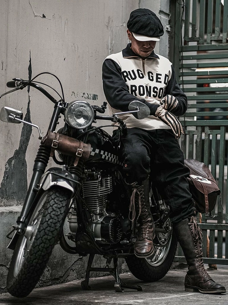 1920-40s Motorcycle Club Racer Jersey. the Two-tone hit color setting was the dominant hue of the time, and the old Harley Davidson riders were typical of this style. The front side posted cloth letters for “Rugged Bronson”, backside affixed to the letter “Bronson MC”.
