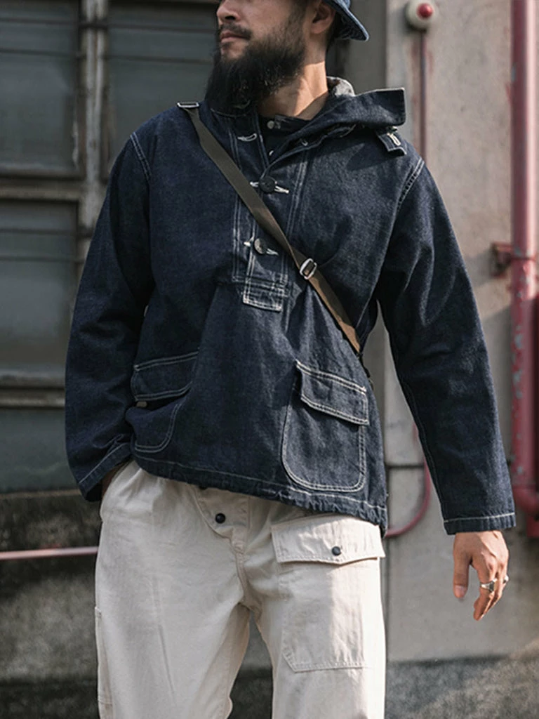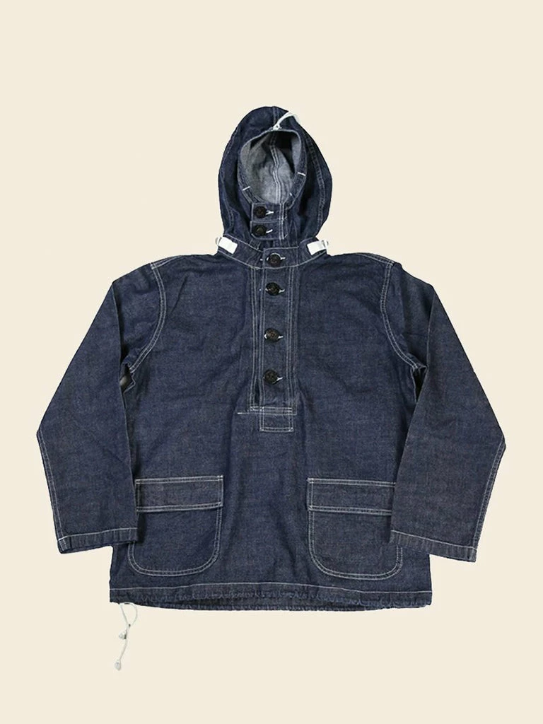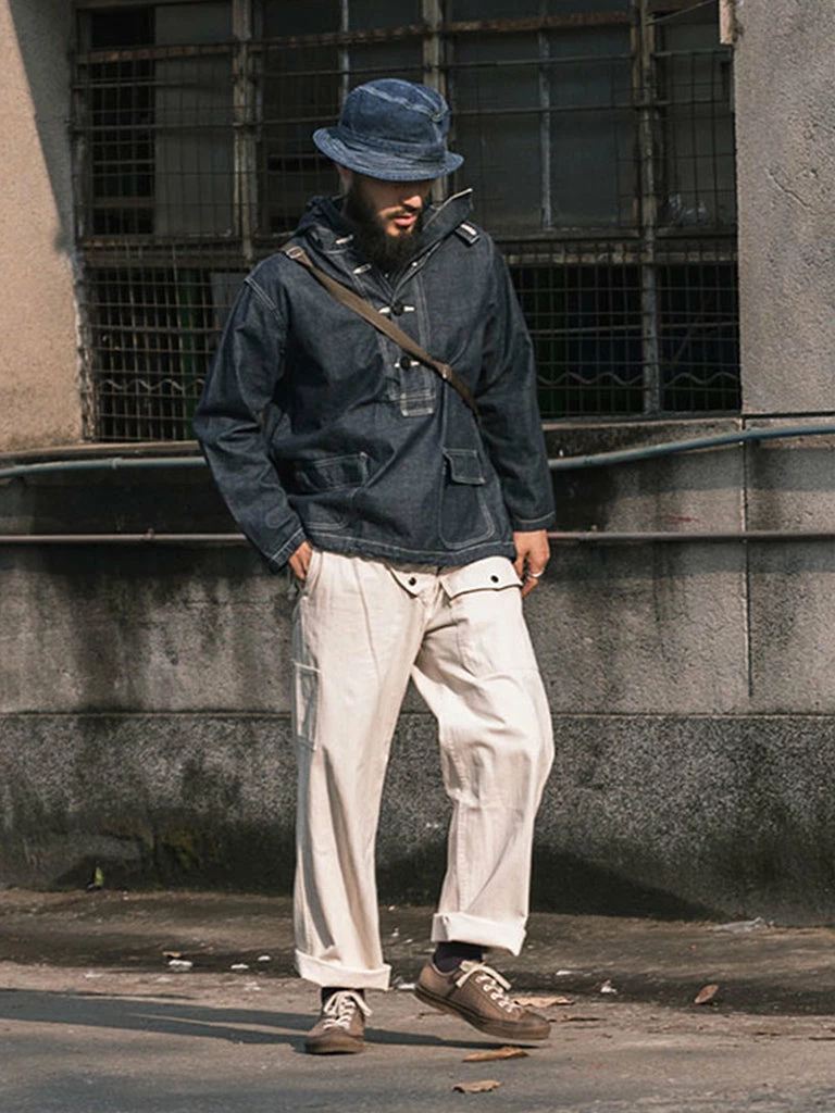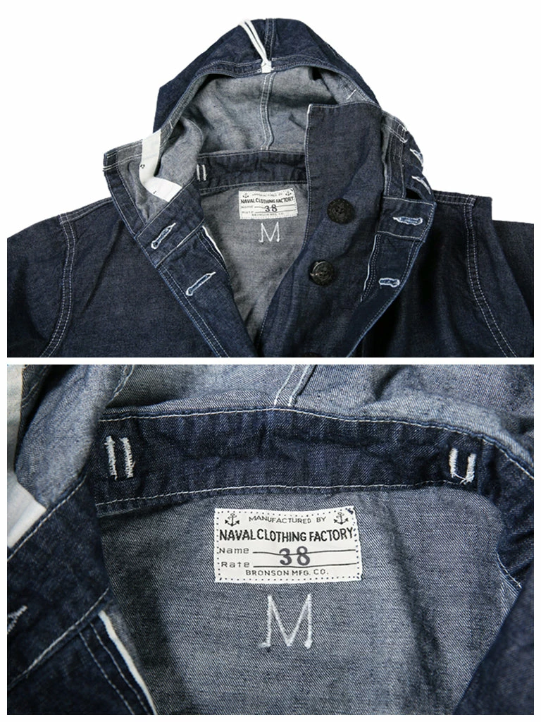 During World War II, US Navy used this Gunner Smock. It is made of plain weave selvedge denim production, and a double front placket keeps the dust from getting inside clothes because it had to wrap the protective helmet, there was a big hat and tightened adjusting buttons on both sides of the cap. There are two patch pockets on the front to place small objects.