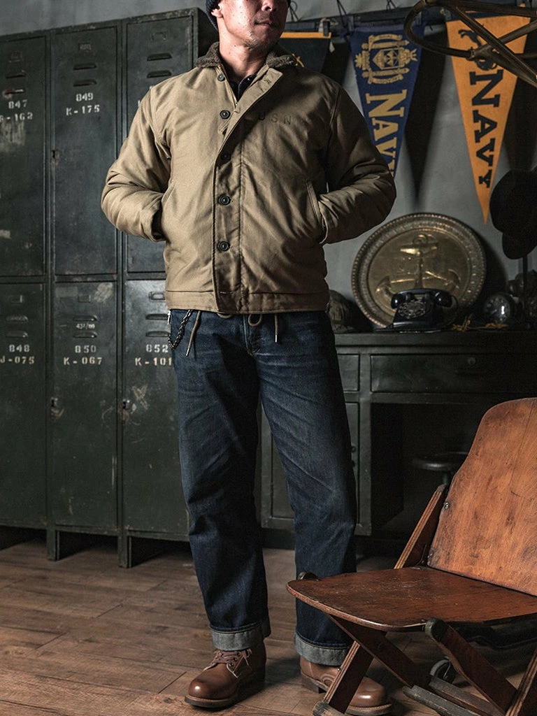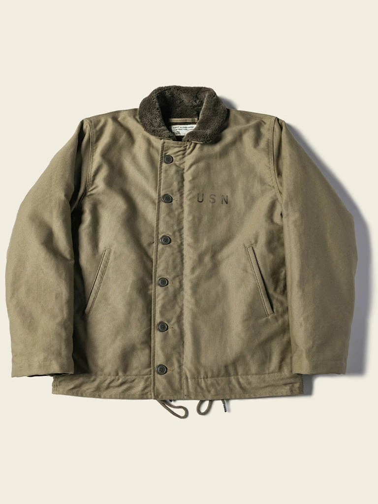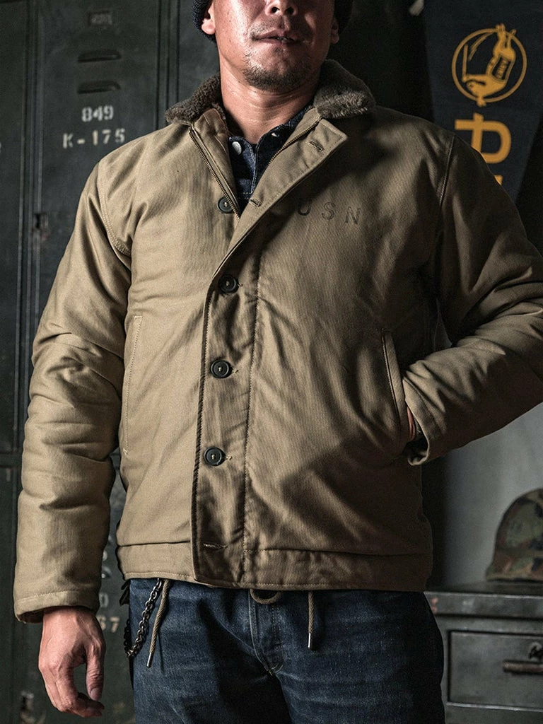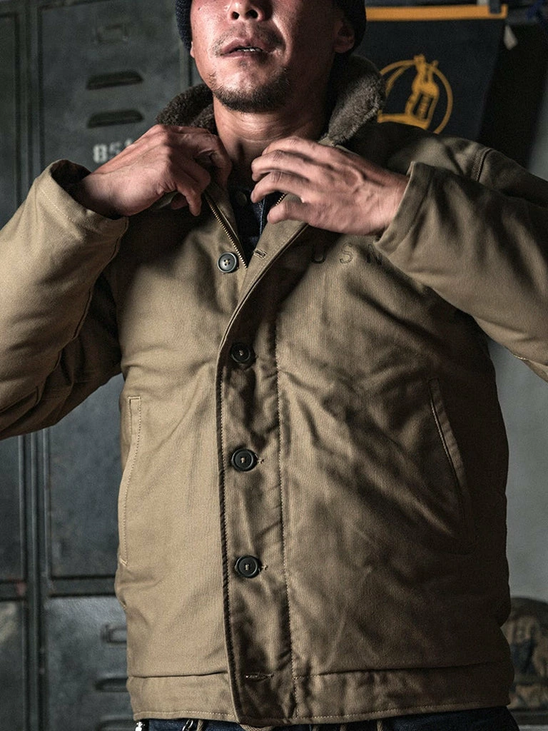 The aircraft carrier deck crew wore N-1 deck jackets during World War II and the Korean War. The thick cotton shell and alpaca or wool lining gave the deck crew the needed warmth and protection from the elements during extreme cold weather conditions. U.S. Navy produced the initial series in Navy blue to symbolize the Navy before changing to Khaki.
