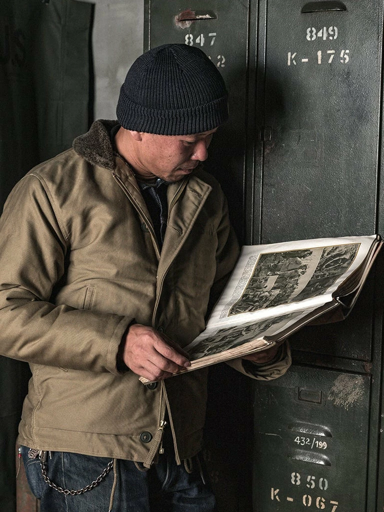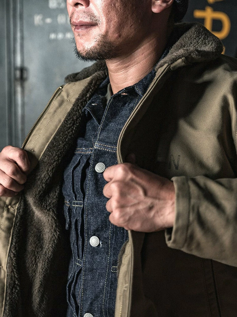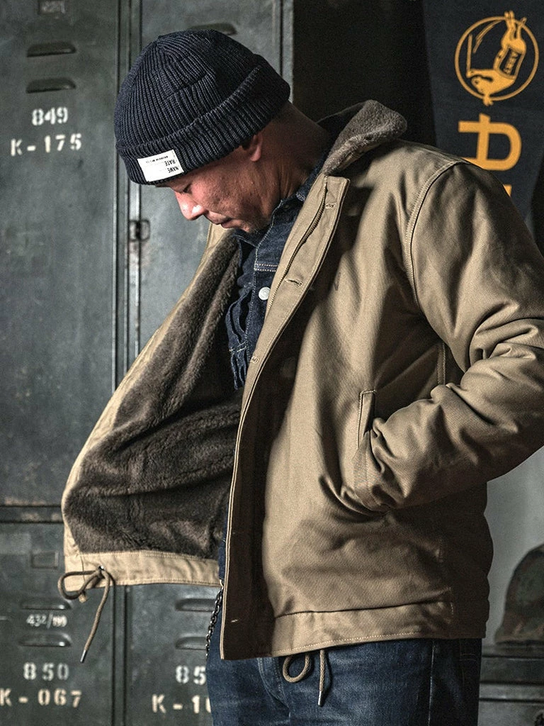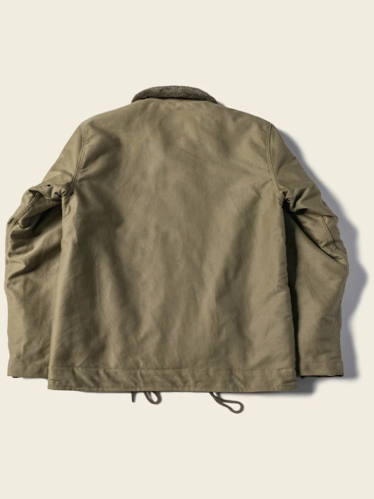 The aircraft carrier deck crew wore N-1 deck jackets during World War II and the Korean War. The thick cotton shell and alpaca or wool lining gave the deck crew the needed warmth and protection from the elements during extreme cold weather conditions. U.S. Navy produced the initial series in Navy blue to symbolize the Navy before changing to Khaki.