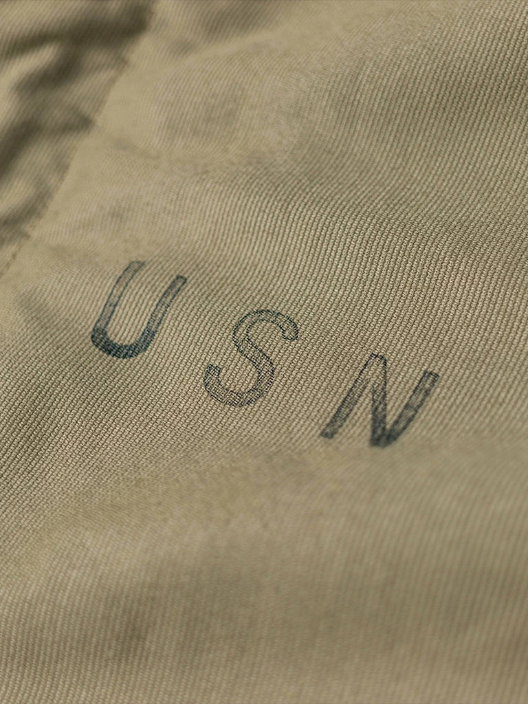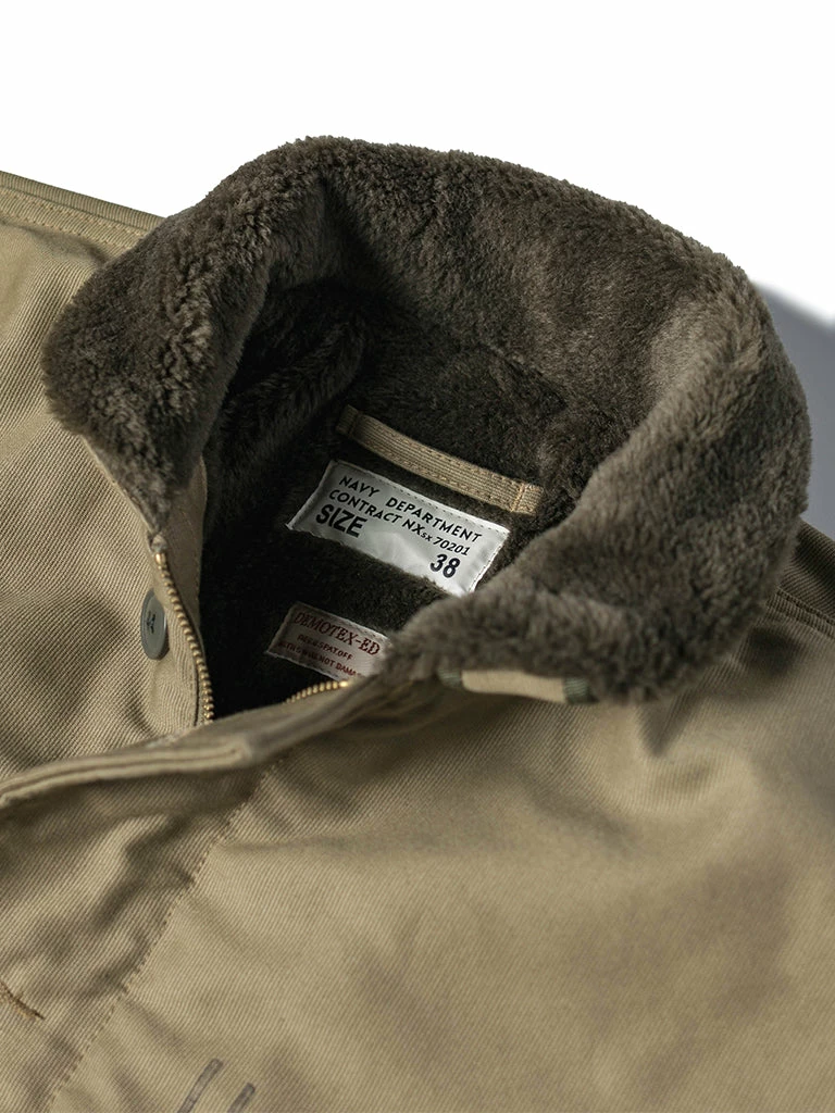 This is a reproduction of the 1940s U.S. Navy 3rd Type N-1 Deck Jacket. This version has no wool on the cuffs, no gun belt under the arm, contract number NXSX 70201.