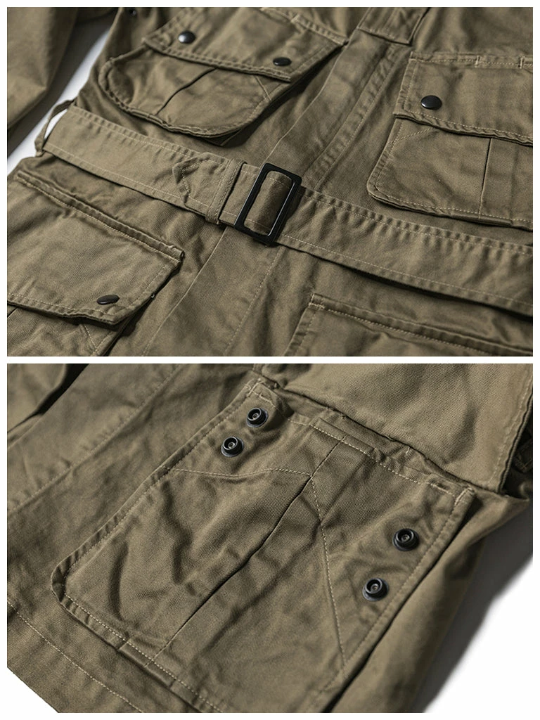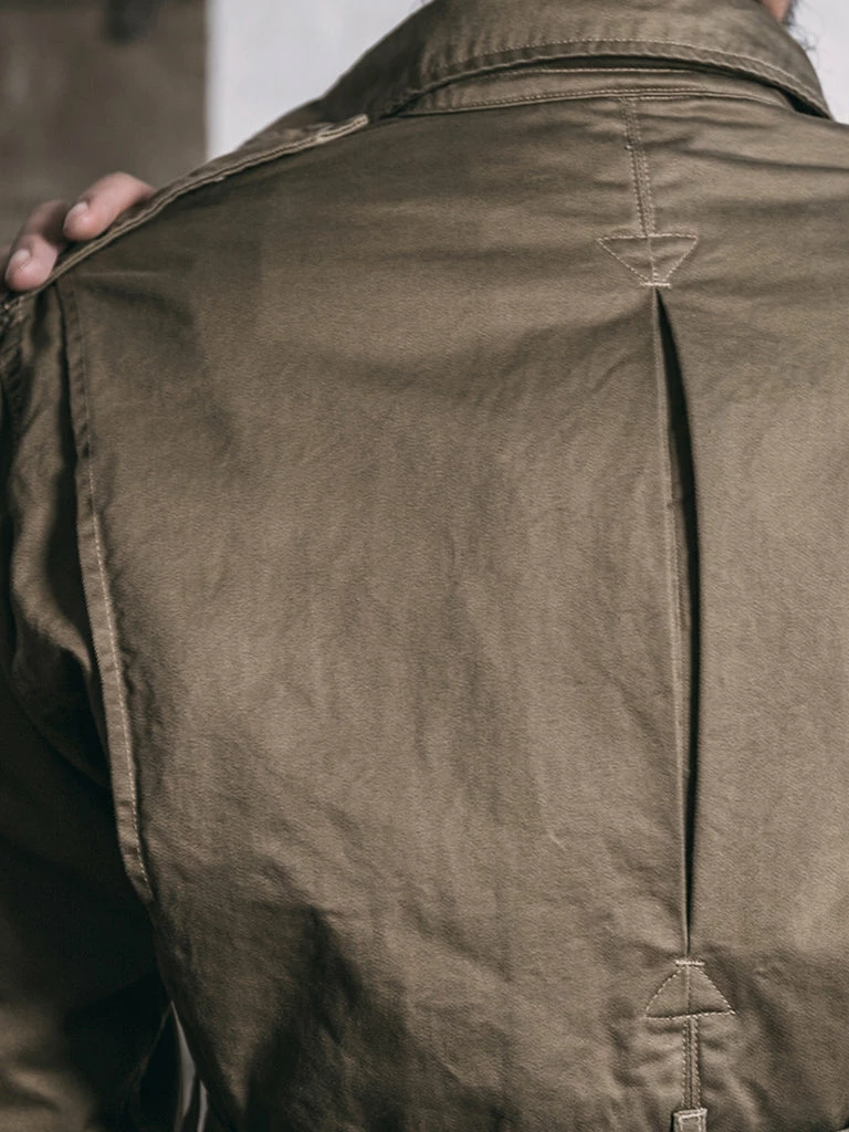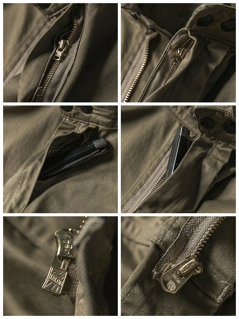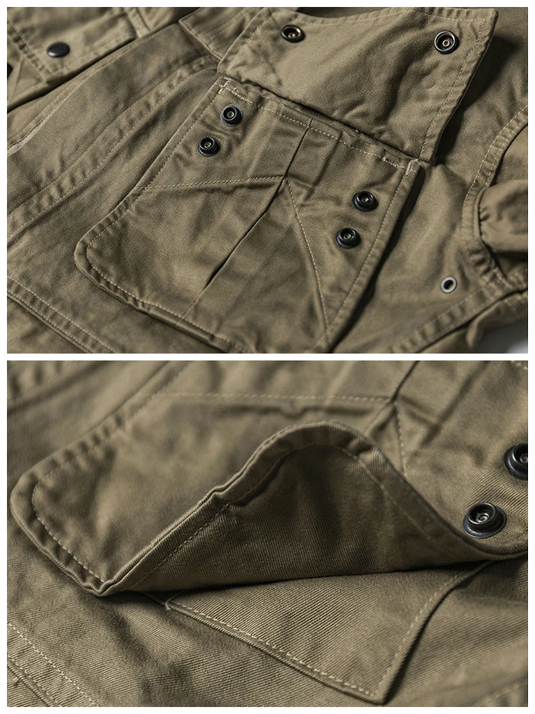 The M-42 field jacket color was Olive Drab #3. The coat consisted of four front patch pockets with two button snaps on each, along with a unique dual-zippered knife pocket located on the upper lapel which was designed to contain a switchblade pocketknife.