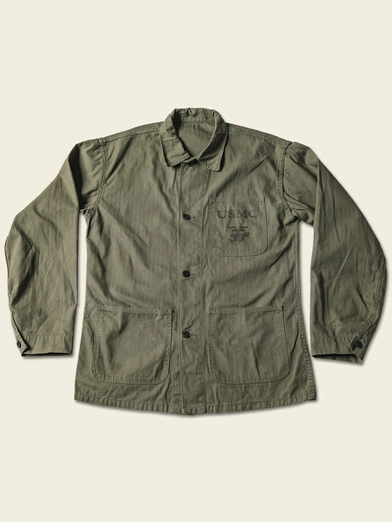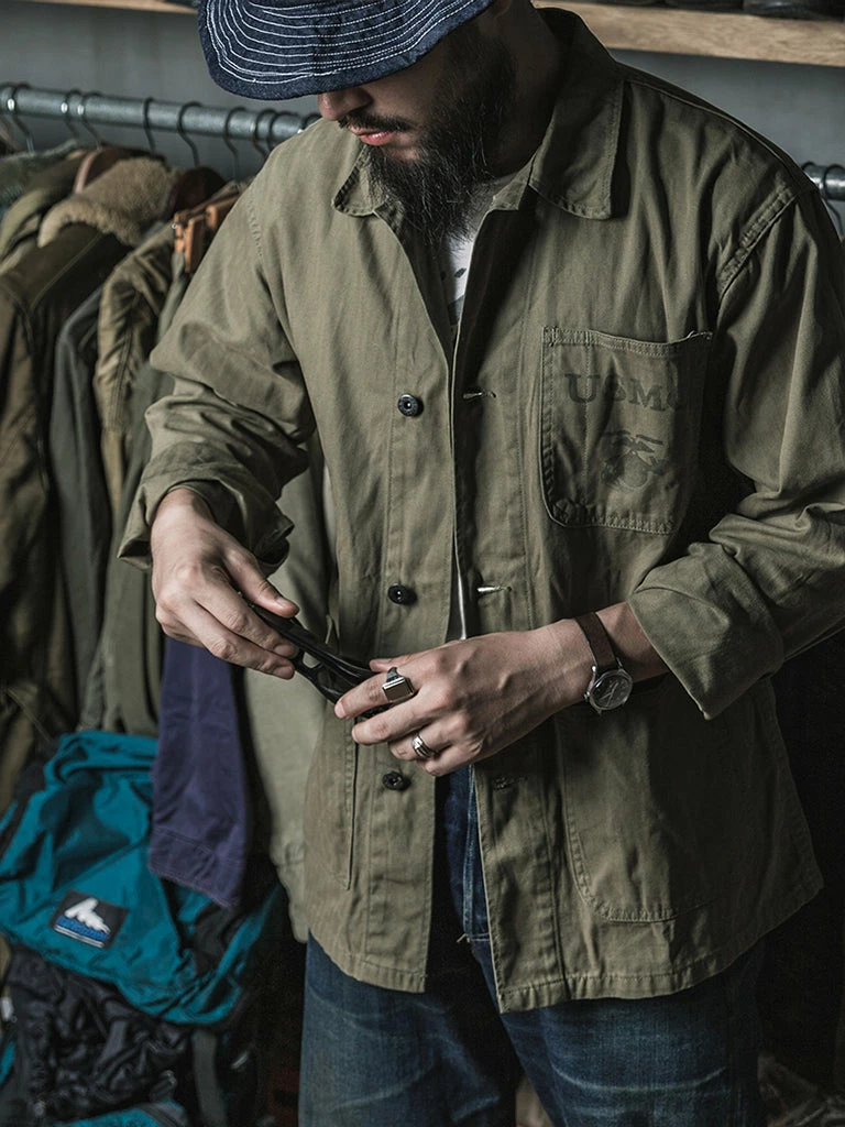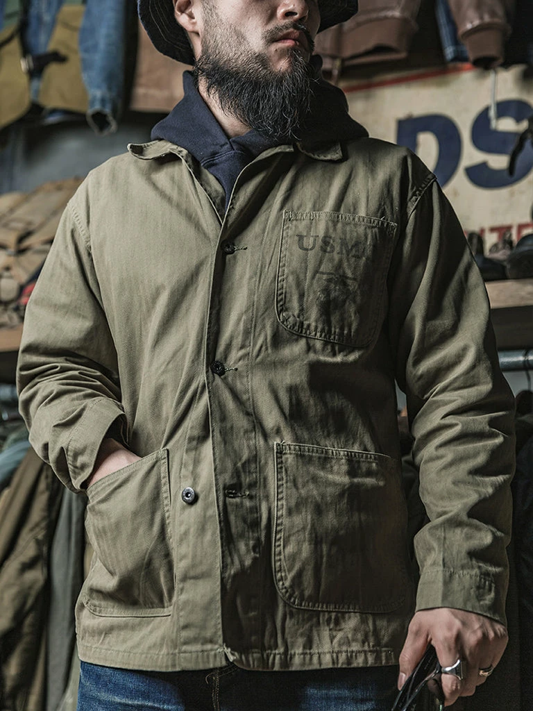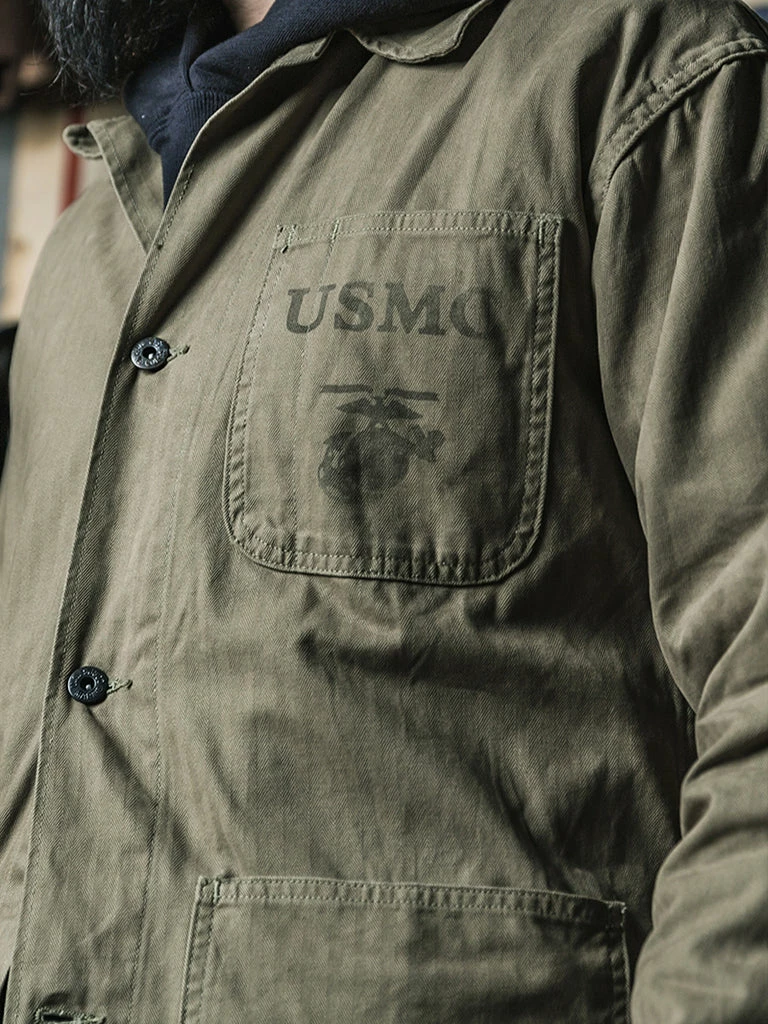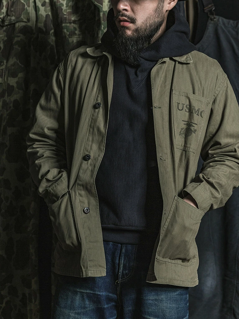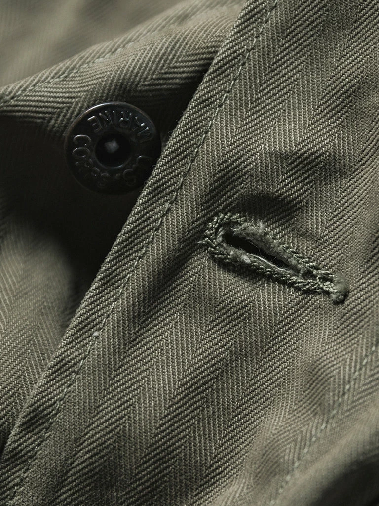 The P-41 uniform consists of one jacket and pants. The P-41 jacket has one pocket on each side of the waist, no pleats on the back, and the Marine Corps badge and the USMC are printed on the jacket’s left breast. It has four copper-plated metal buttons on its front placket that has the initials of the USMC. Its cuff has two metal buttons and a buttonhole that can be used to adjust the size of the cuff. The design is straightforward and bright.
