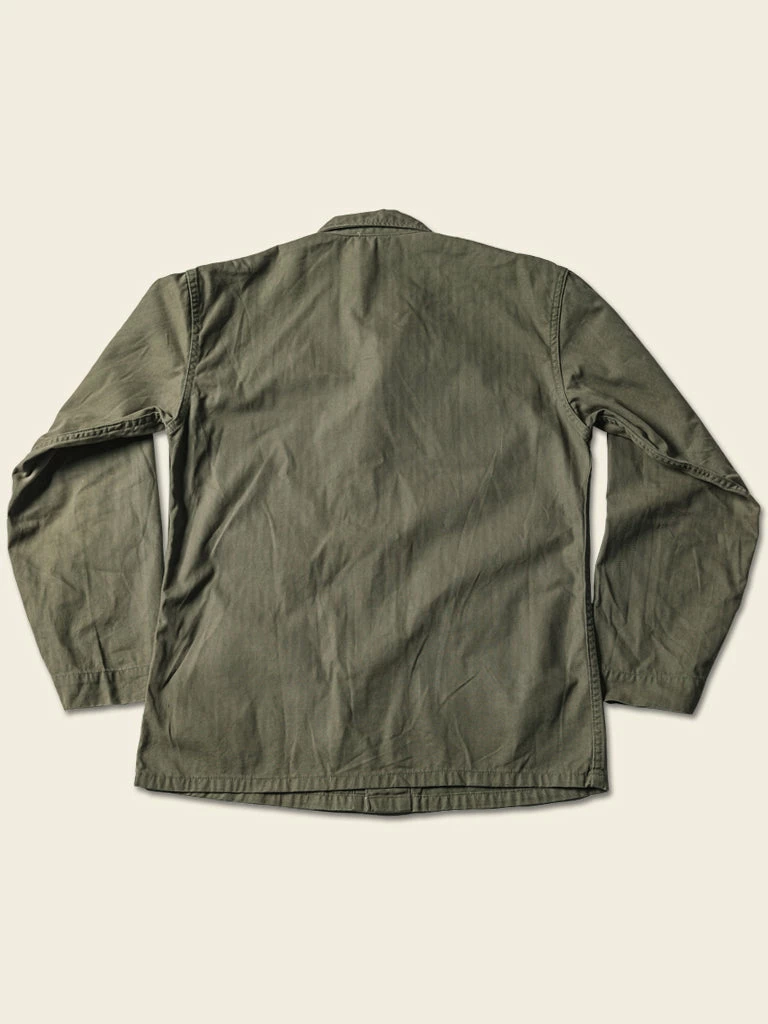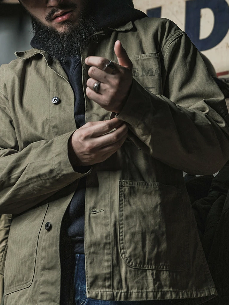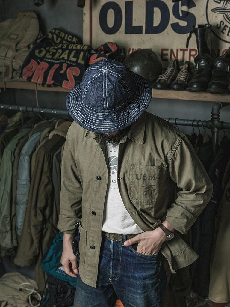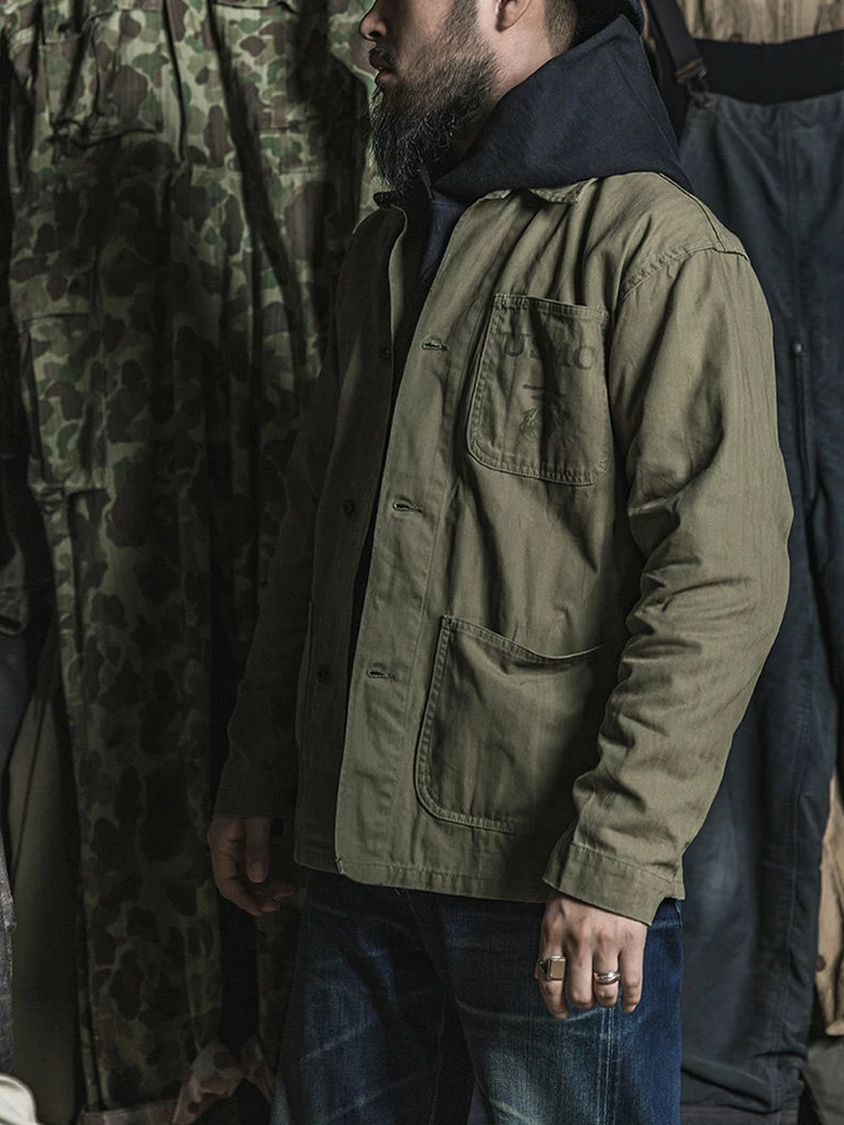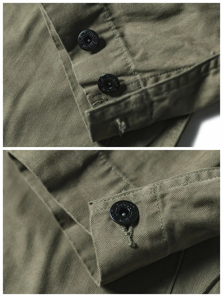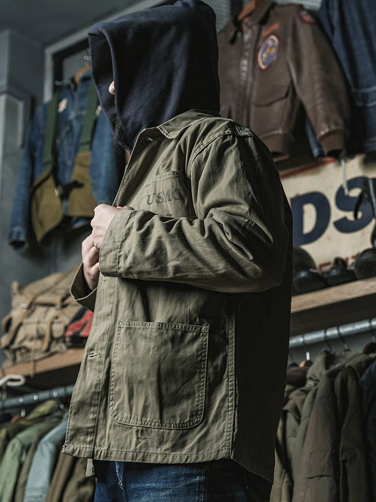 The P-41 uniform consists of one jacket and pants. The P-41 jacket has one pocket on each side of the waist, no pleats on the back, and the Marine Corps badge and the USMC are printed on the jacket’s left breast. It has four copper-plated metal buttons on its front placket that has the initials of the USMC. Its cuff has two metal buttons and a buttonhole that can be used to adjust the size of the cuff. The design is straightforward and bright.