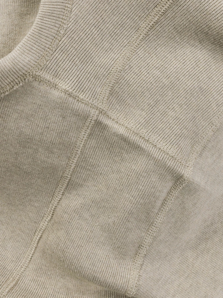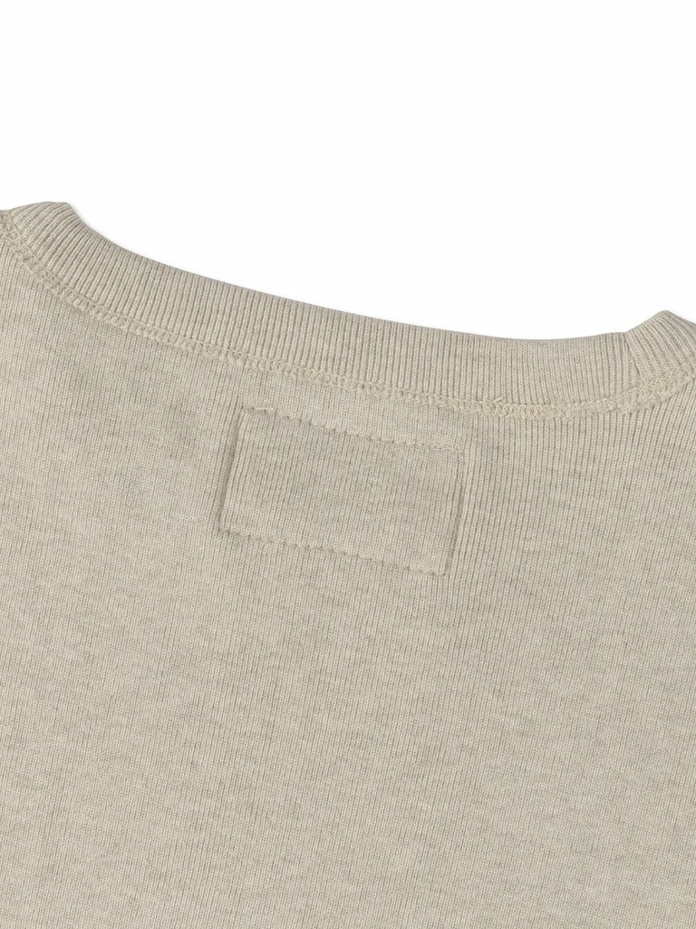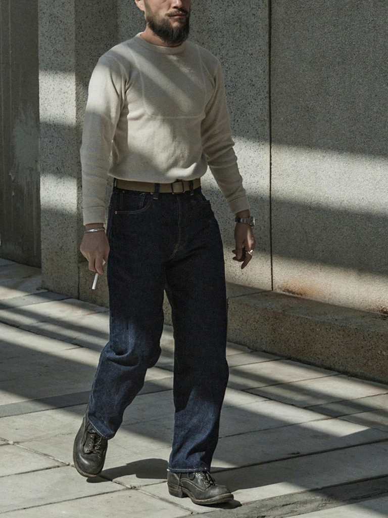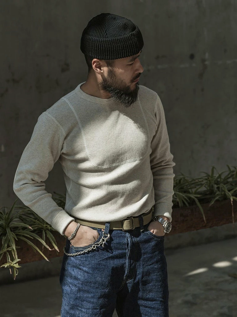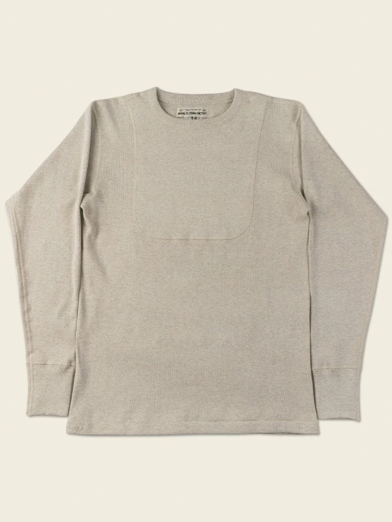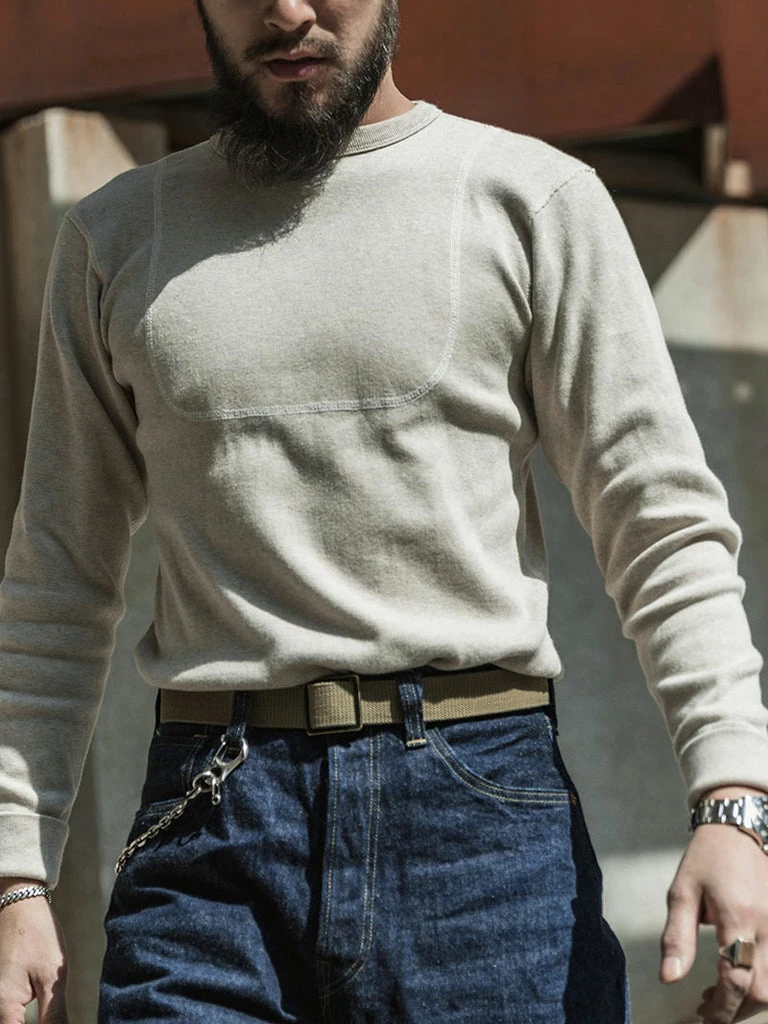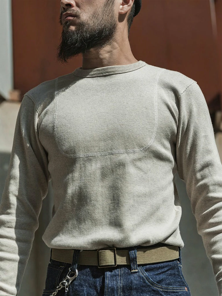 This is a replication of a 1950s USN N-1 undershirt. Originally used for training wear within the US Navy in the 1950s, the thick bib-like patch over the chest and back constructed with 4 needle stitching is to improve the durability of the garment. It was made of a heavy-duty fabric blended with wool and cotton. Its advantage is that it is very warm, but the disadvantage is obvious, it is terrible to wear skin feeling.