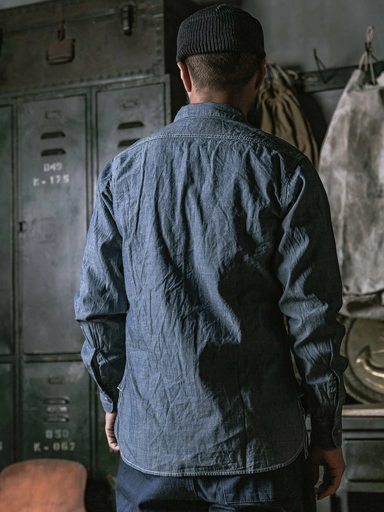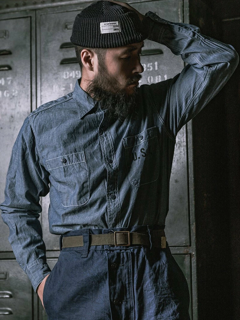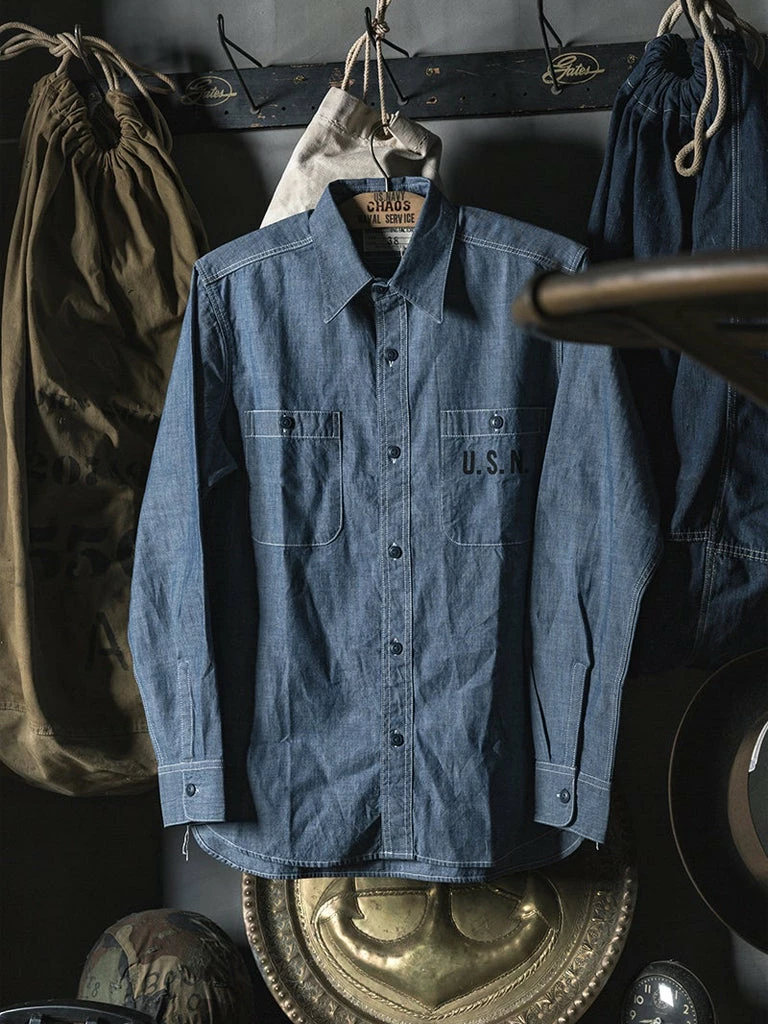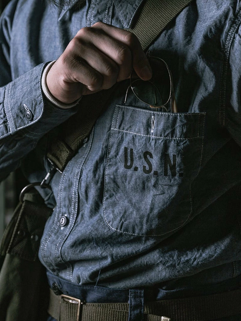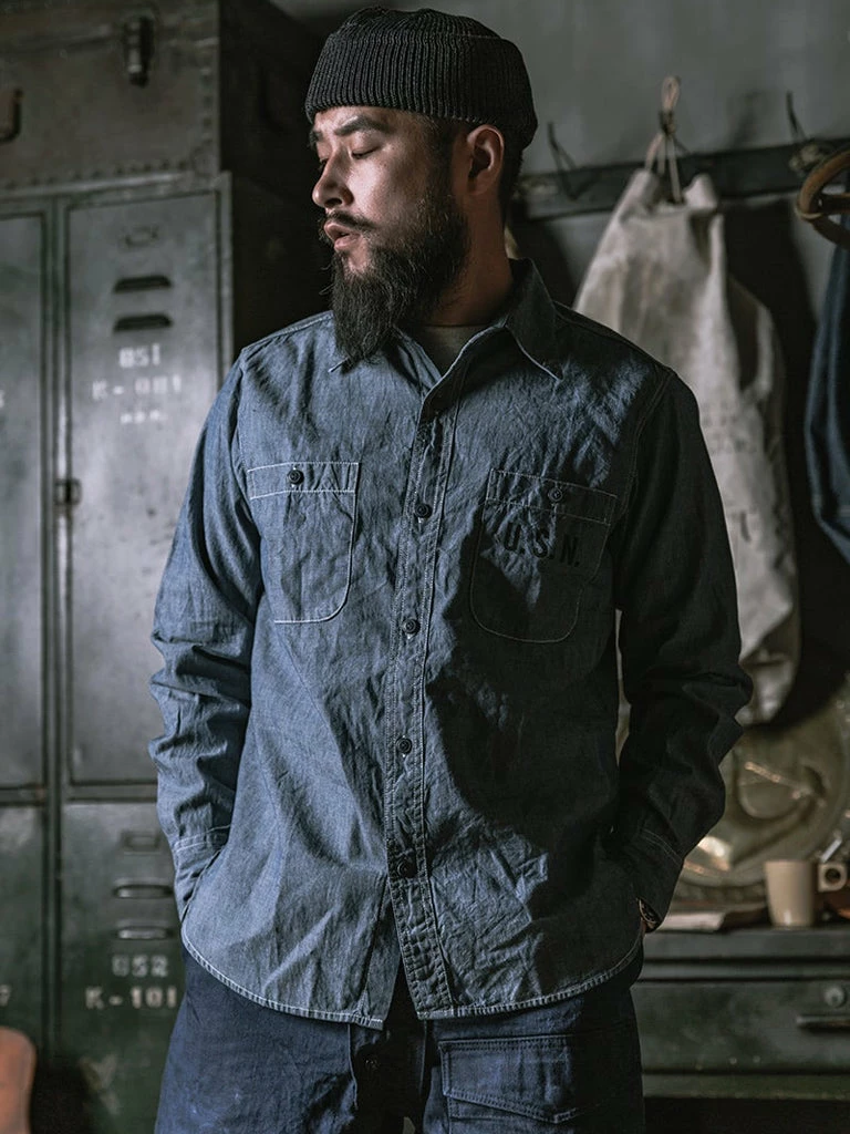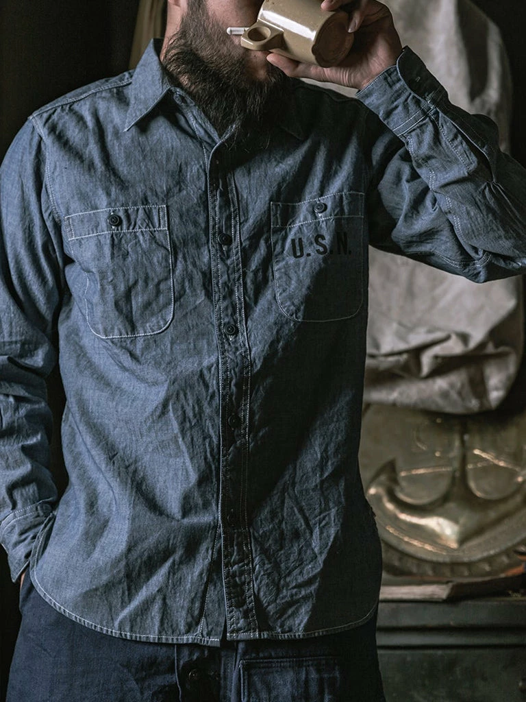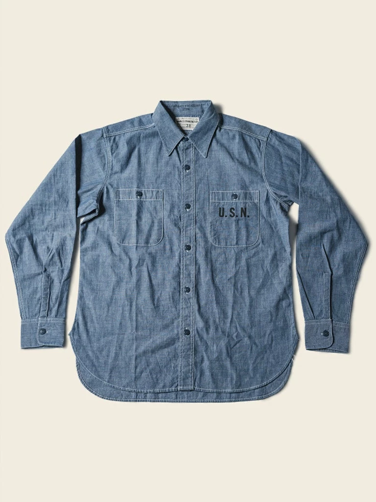Based on a U.S. Navy work shirt. This U.S.N. Chambray Shirt is made of 8oz. selvedge chambray fabric, 100% cotton, and the symmetrical double patch pockets and navy urea buttons.