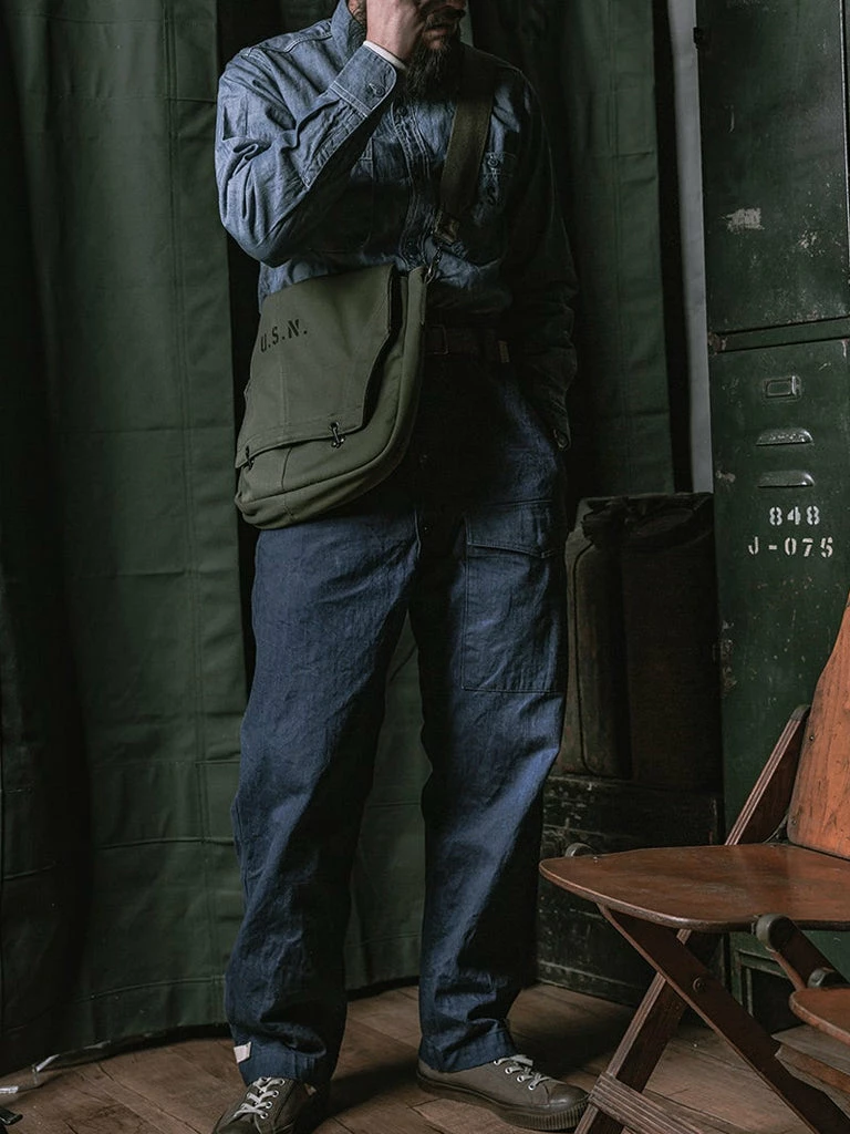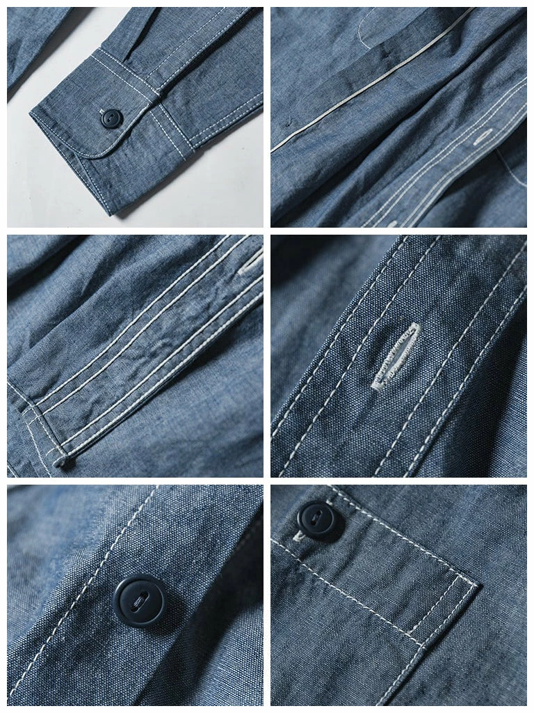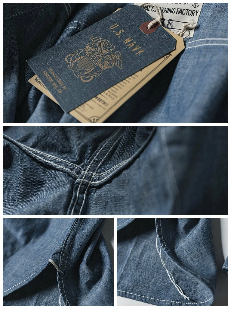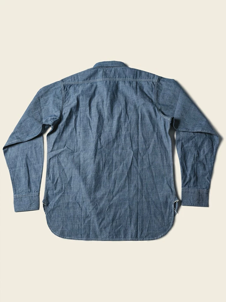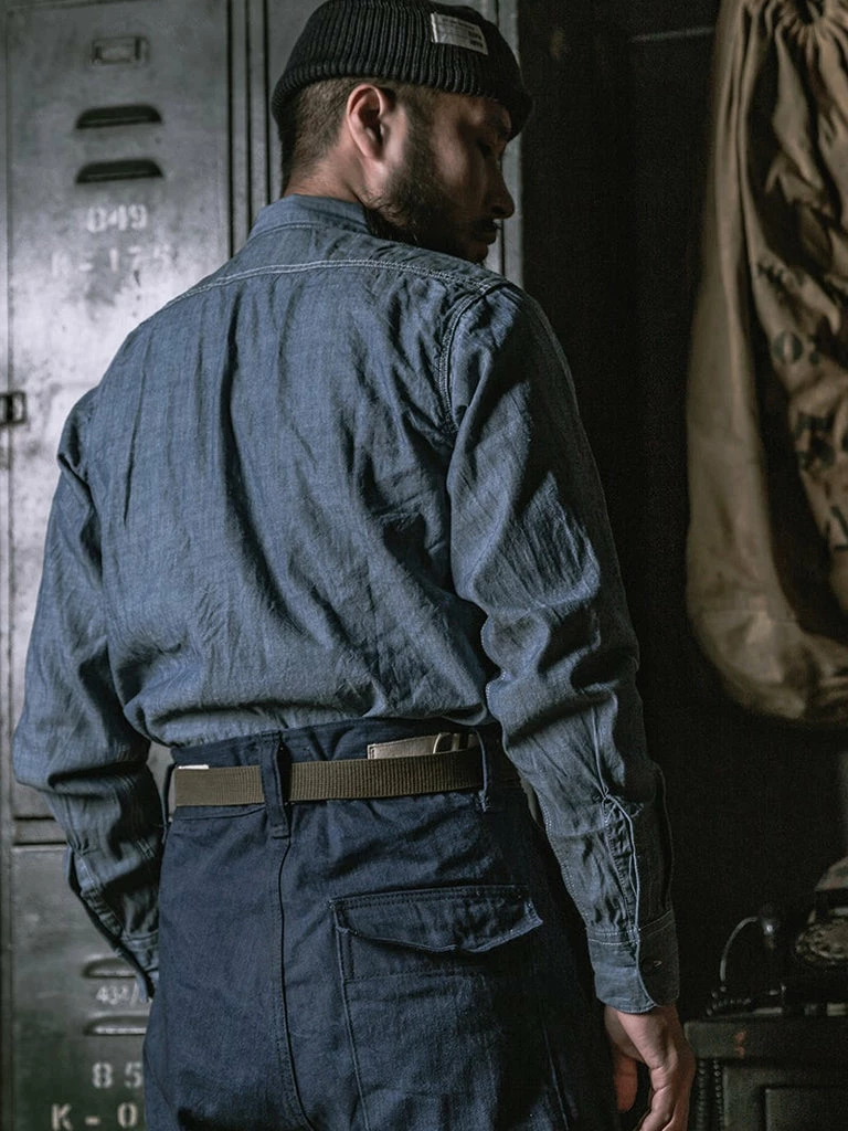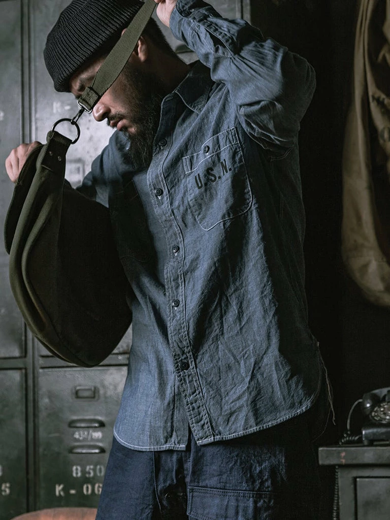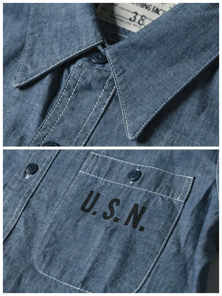 Based on a U.S. Navy work shirt. This U.S.N. Chambray Shirt is made of 8oz. selvedge chambray fabric, 100% cotton, and the symmetrical double patch pockets and navy urea buttons.