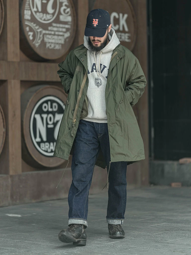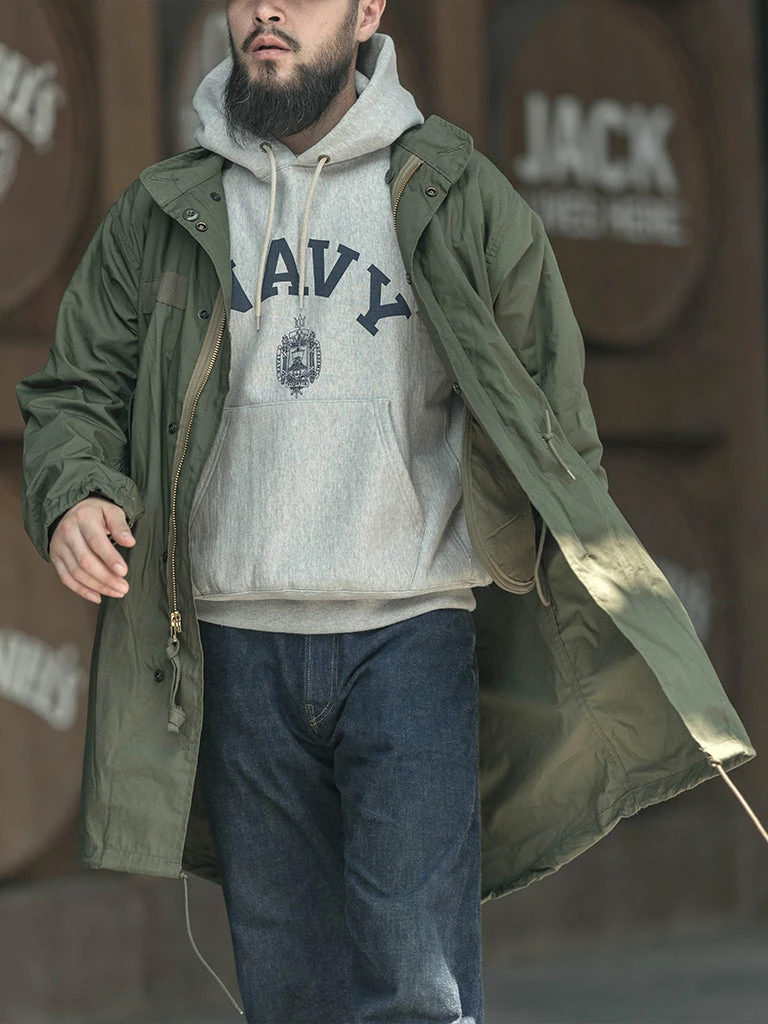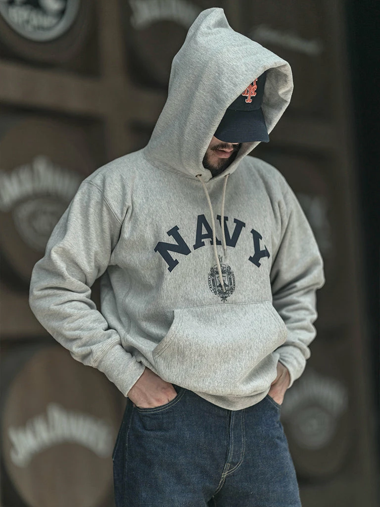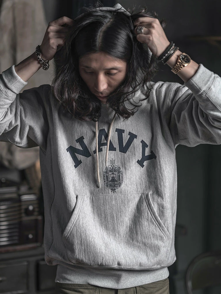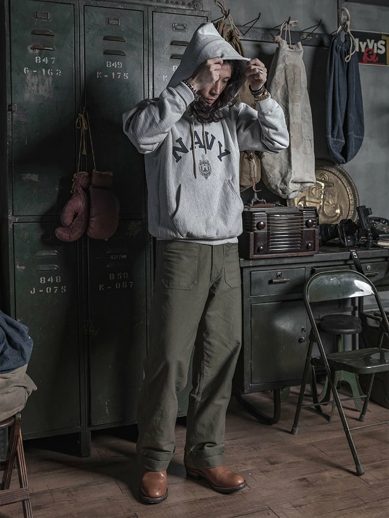 It is based on the US Navy Naval Academy training sweatshirt. The cut is an inverted triangle, and It makes you look tough. This sweatshirt is made of heavyweight 20 oz Terry cloth, after washing, reaches 21 oz The thick fabric gives a sense of security. The retro classic sewing process is adopted and adopts the Four needle six lines sewing process at the stitching thread of sleeve body and side body to restore the style of the original version.