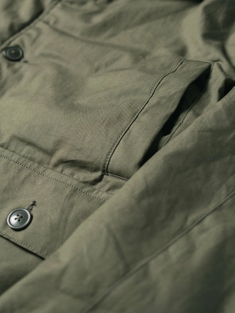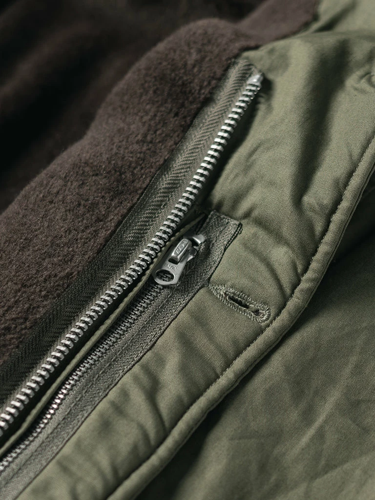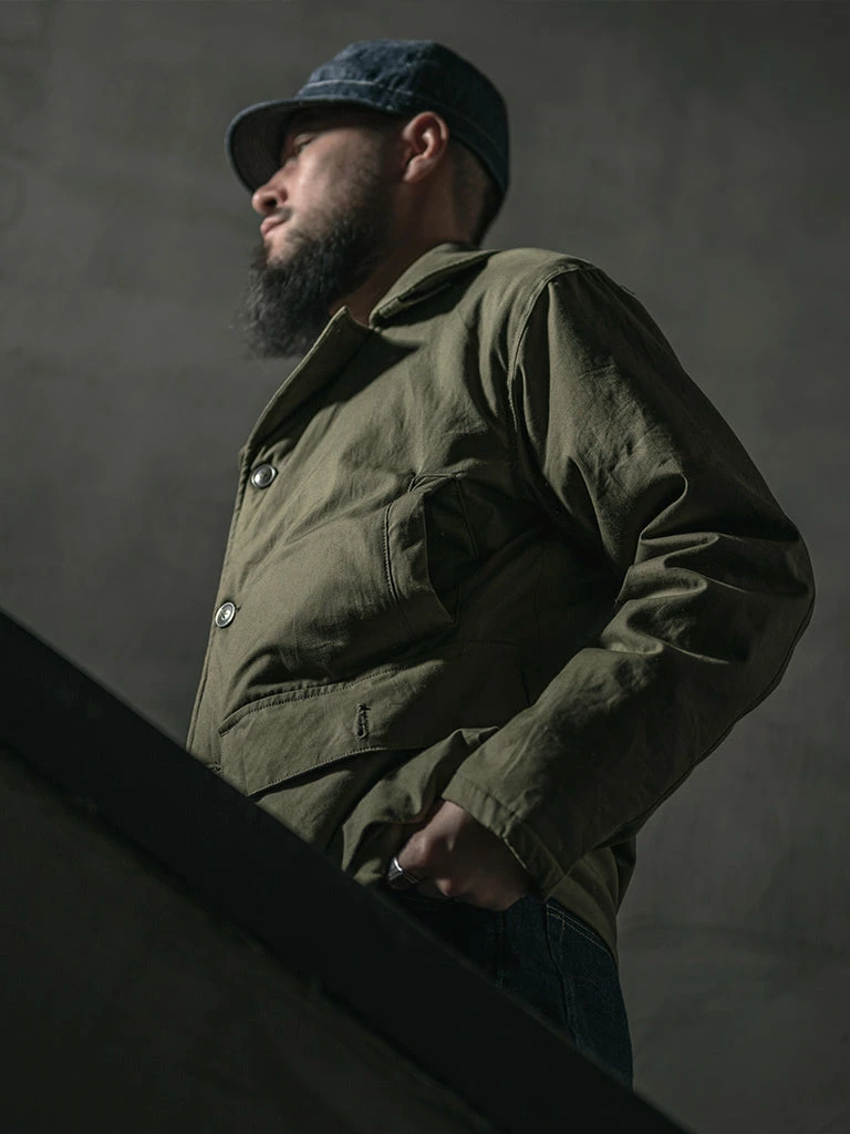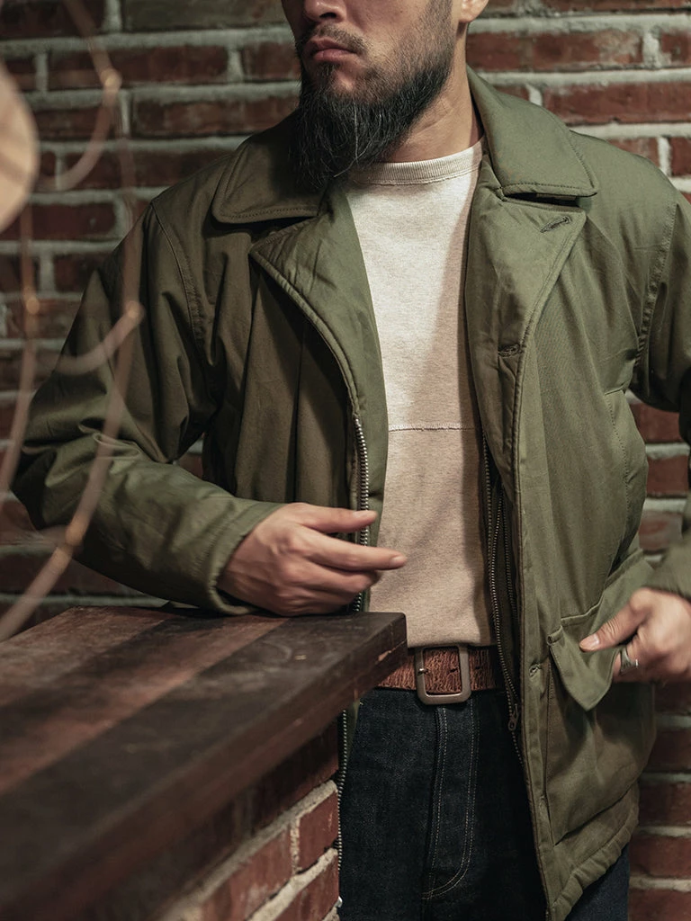 The AL-1 (55J13) is a mid-length jacket with a field jacket-like lapel appearance. The jacket is closed by a zipper and had the button-type front fly provides good warmth. The body is made of flocking wool, the sleeve is made of wool, there are hand pockets on both sides of the chest, and there are wool threaded cuffs to strengthen warmth, there are two large three-dimensional storage bags at the hem. Inside the jacket, there is a pocket on each side, one side is zipped closed, the other side is button closed.