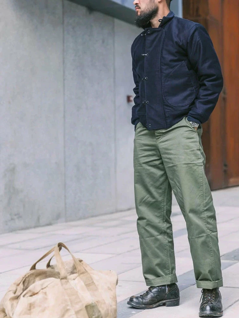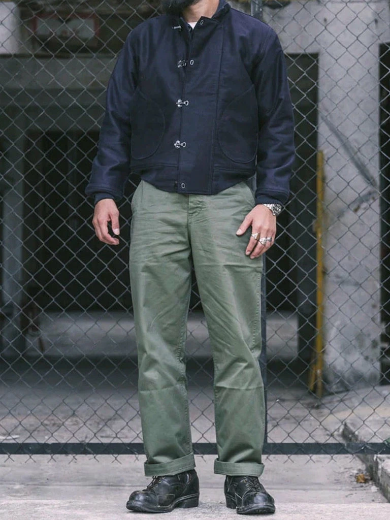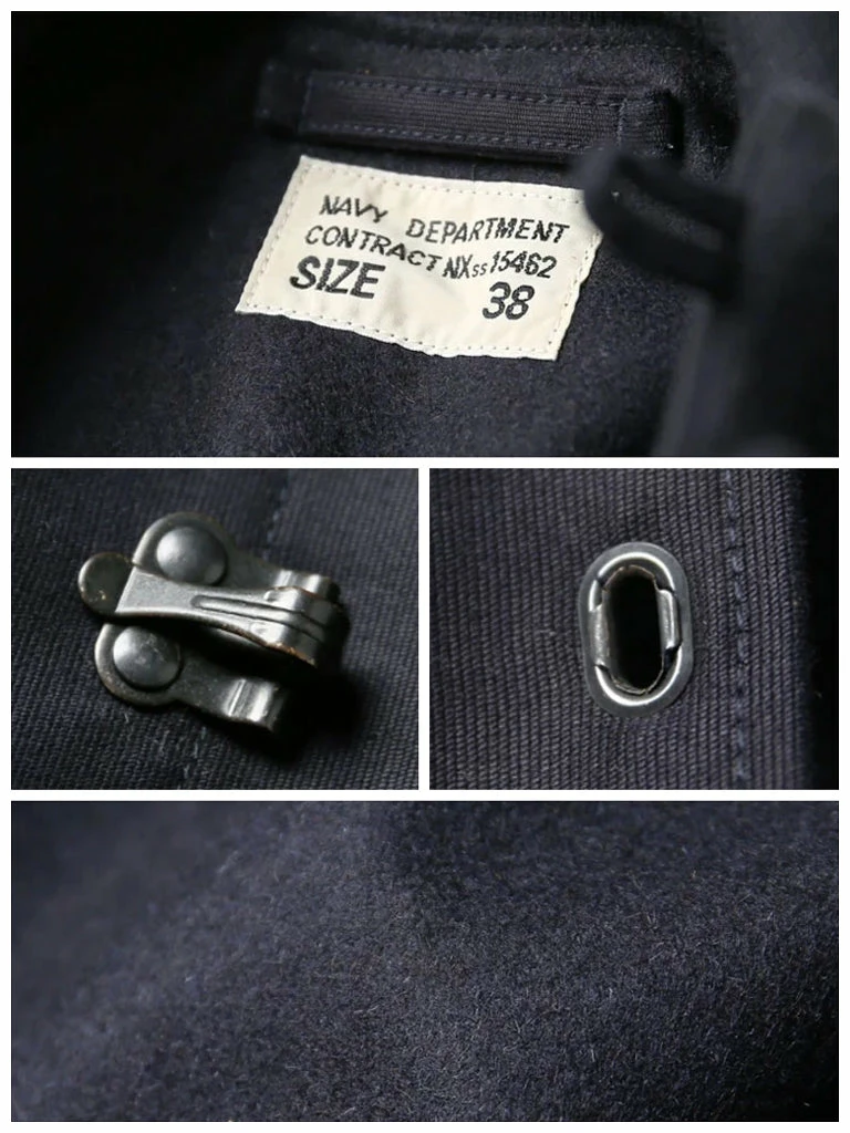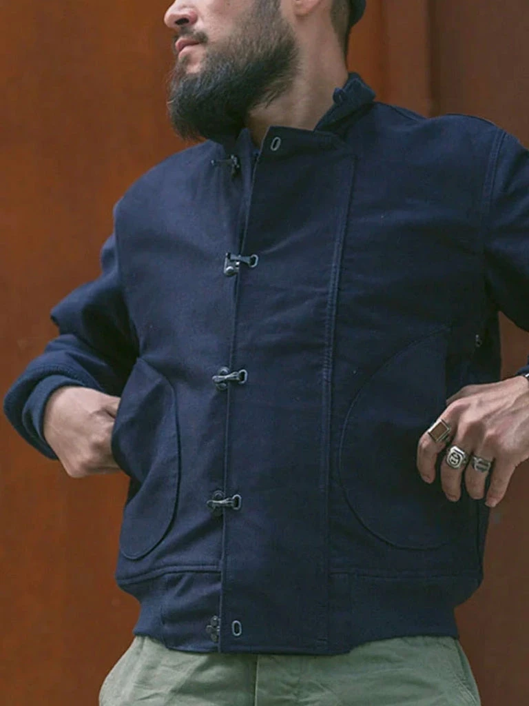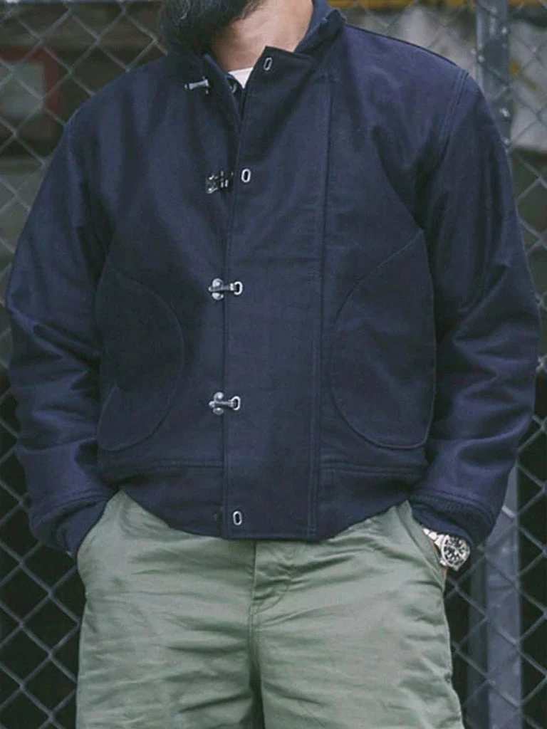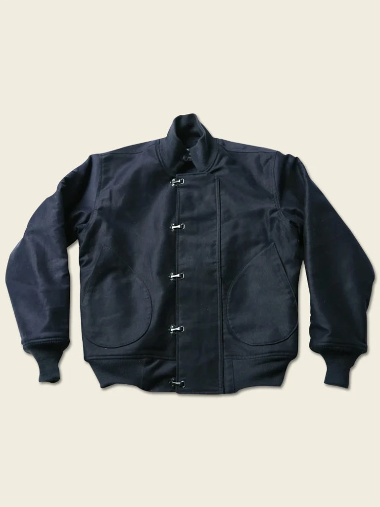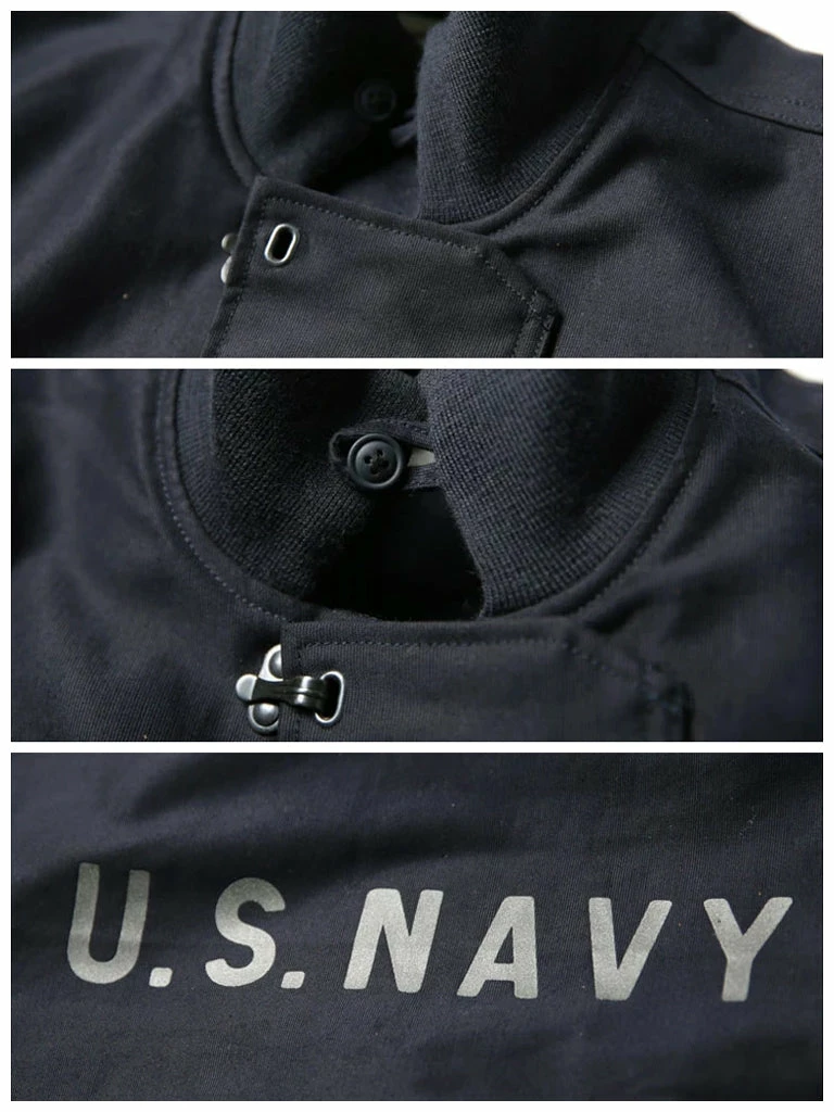 Deck hook similar in appearance to the army tank jacket, silver-grey US Navy printed on the back, using metal hook closed.