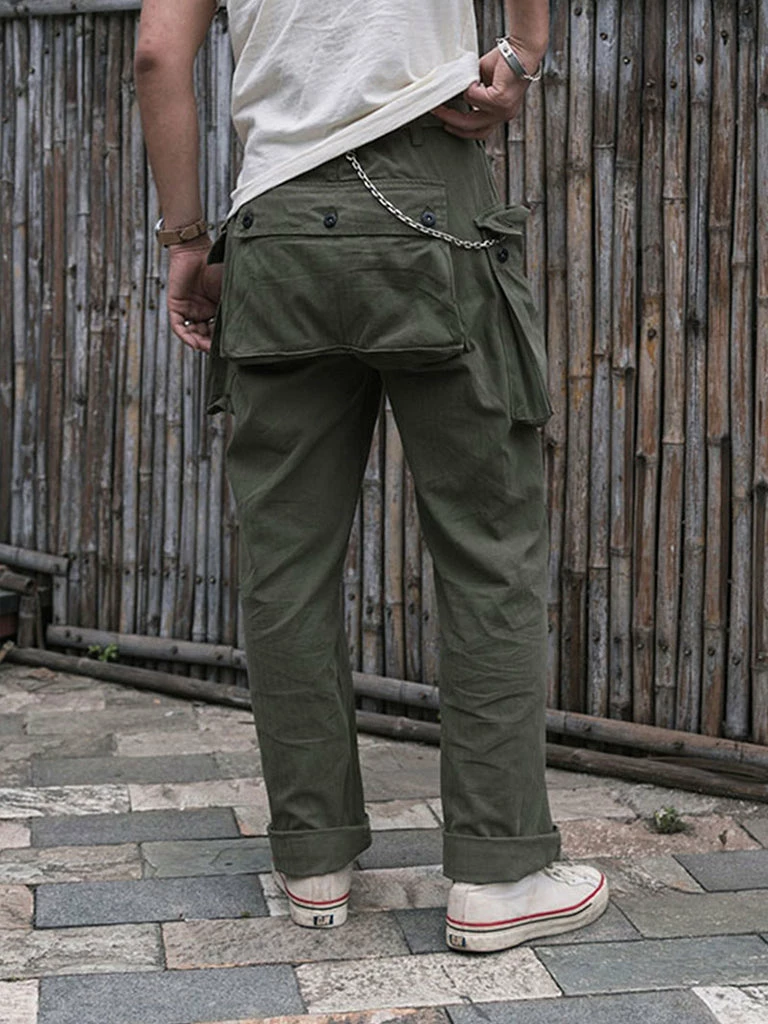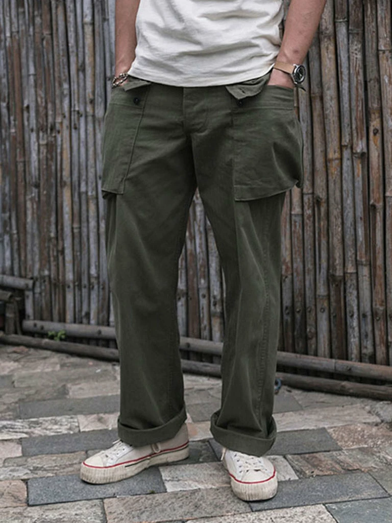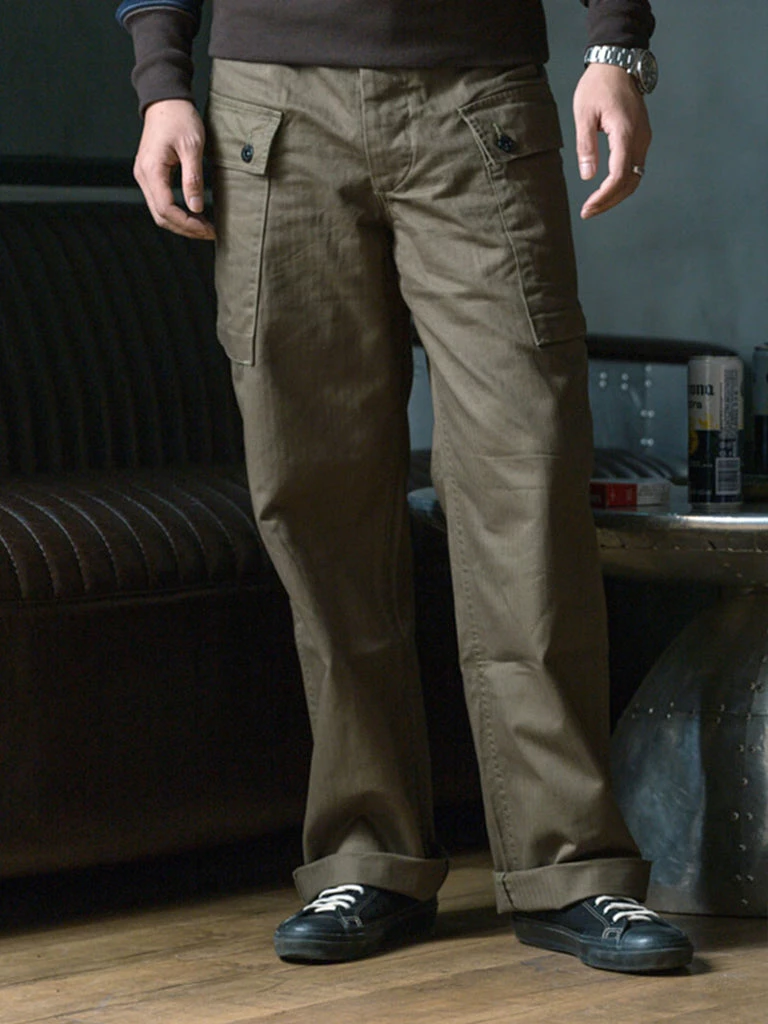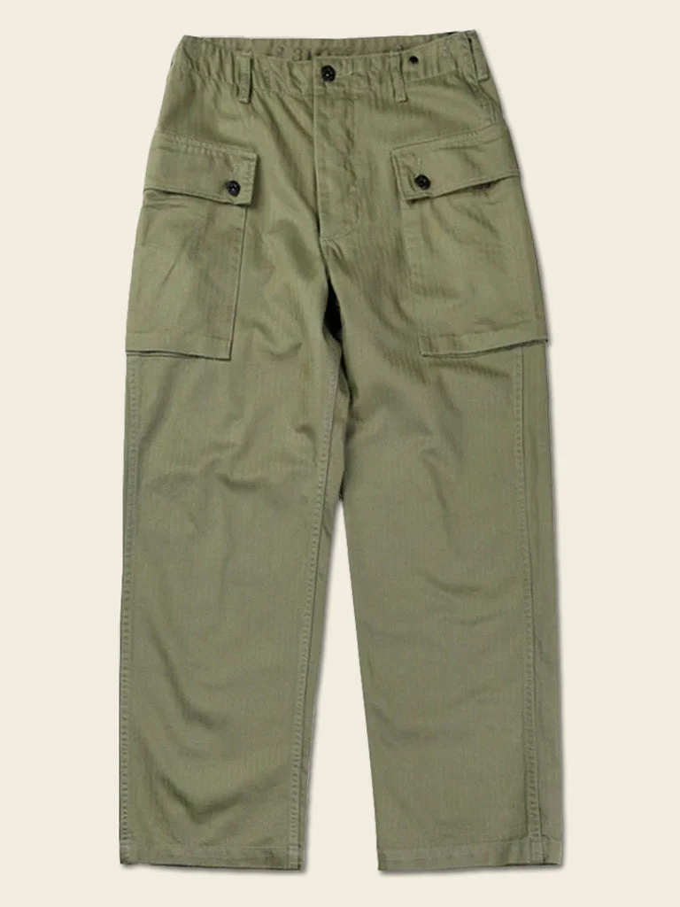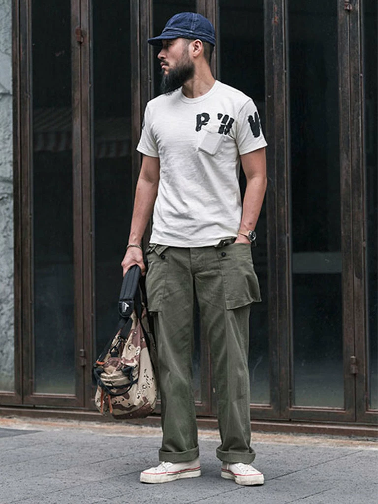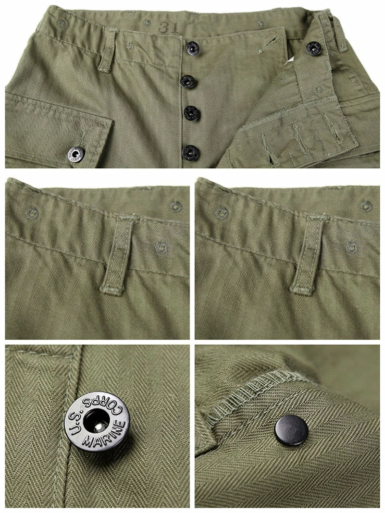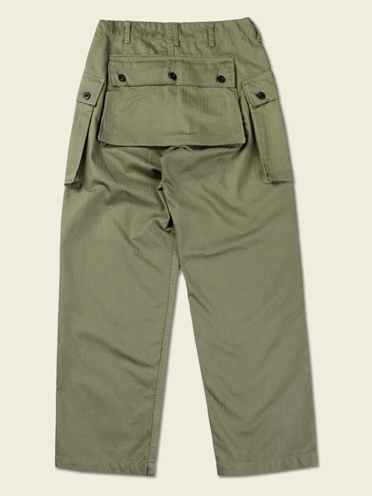 In 1944, USMC (US Marine Corps) started using the P-44 pants, also known as the ‘Monkey Pants’. They are the most well-known and distinctive trousers within the USMC. It significantly differs from the previous P-41 model with large cargo pockets on both the back and sides. The pockets on the sides were made large to fit k-ration boxes (military food rationing box), and the back pocket was to pack a camouflage poncho. With multiple pockets allowing a large amount of storage, reinforced holes were placed on the belt band to fit P1941 suspenders to avoid the weight pulling marines trousers down.