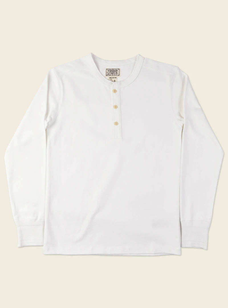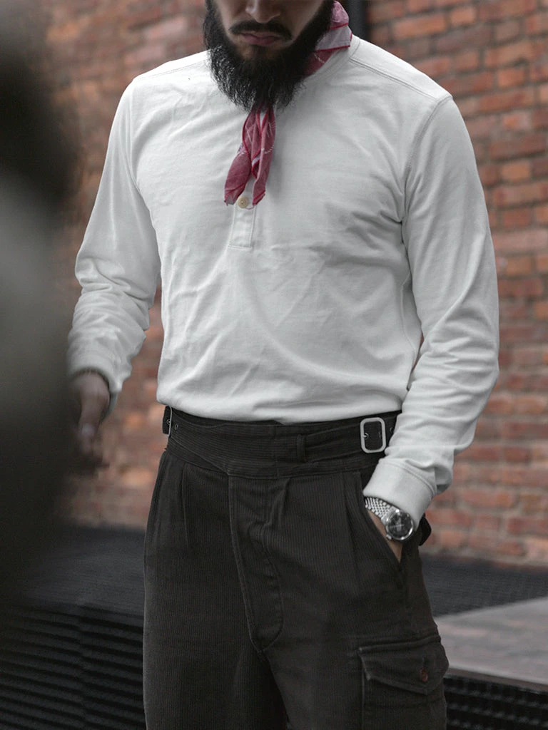 The Henley T-Shirt was designed as a rowing shirt two hundred years ago before hitting its stride in combat. This Henley is 3 buttons style, made of heavyweight 9.7 oz cotton fabric, standard fit, not too tight, not too loose, easy throughout the body, has a great texture, is comfortable to wear, and will look more retro after long wear and multiple washes.