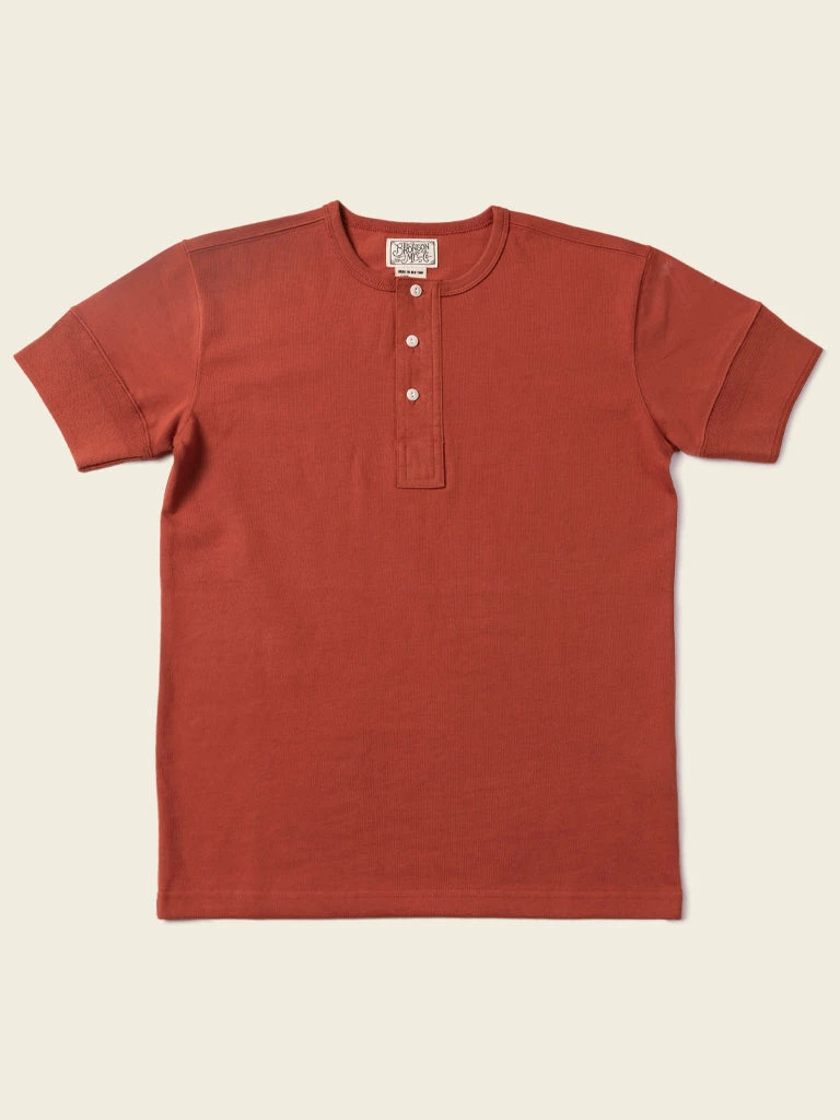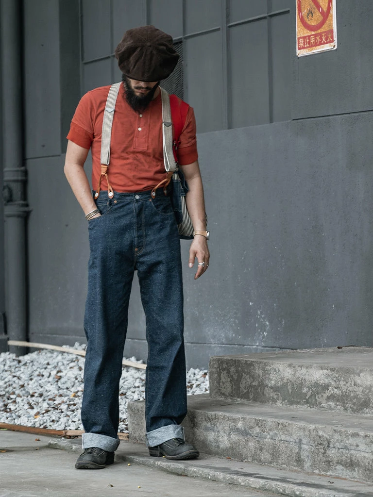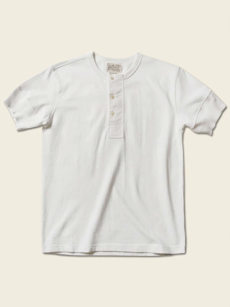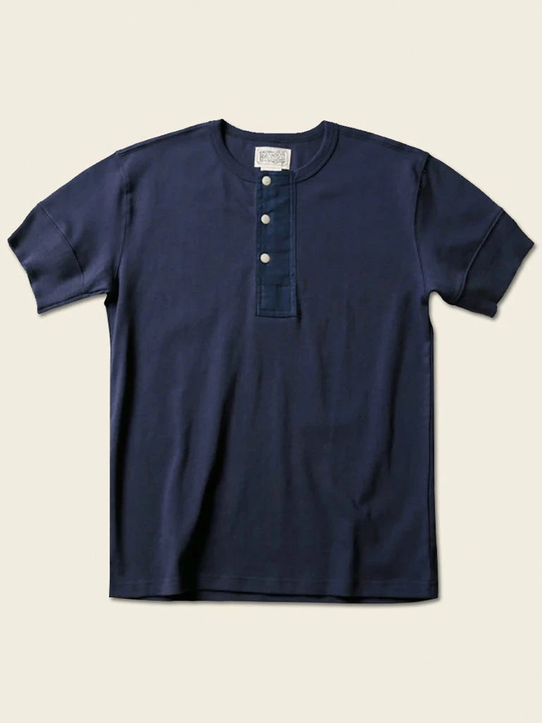 This henley t-shirt is based on a vintage henley t-shirt from the 1880-1920s, which features a wide front placket and threaded cuffs. It is made of heavyweight 12.3 oz cotton fabric, which has a great texture, is comfortable to wear, and will look more retro after long wear and multiple washes.