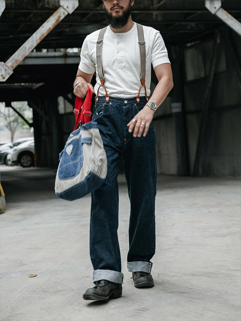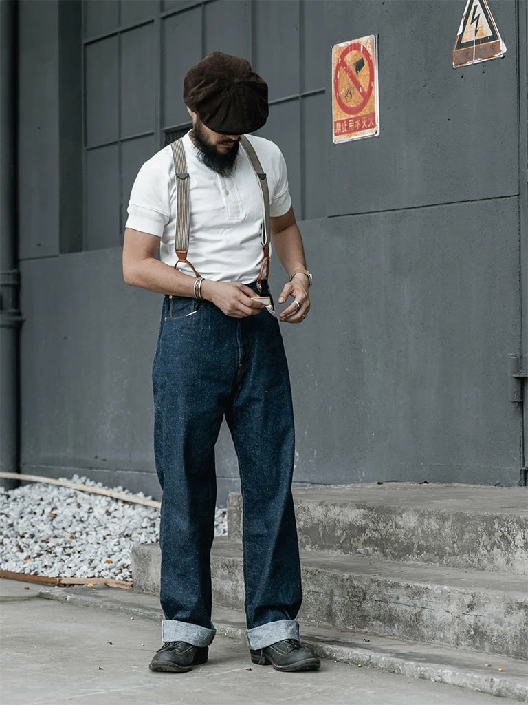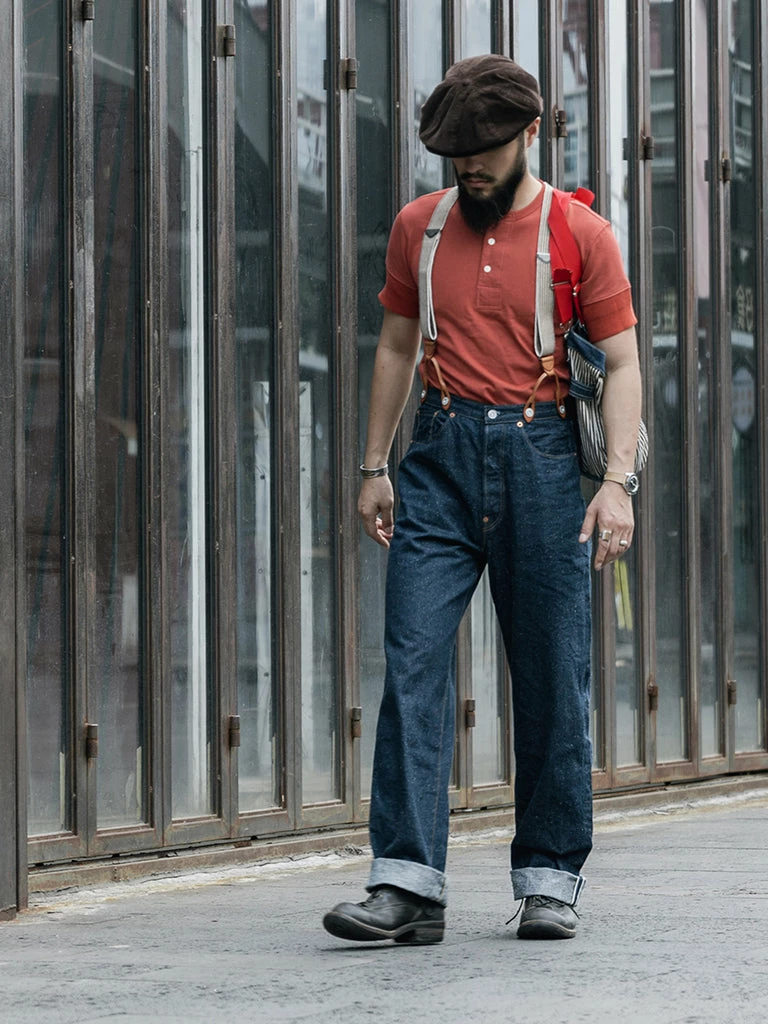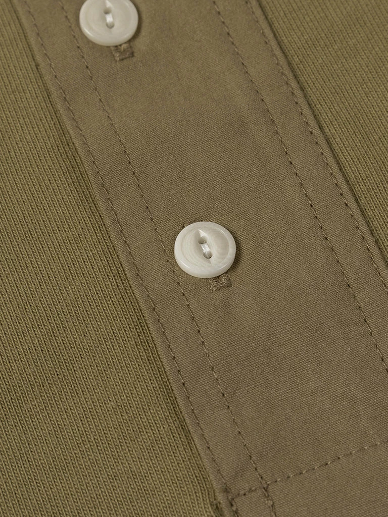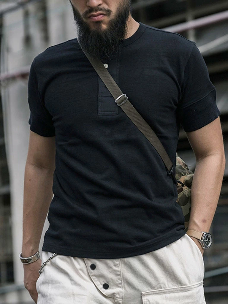 This henley t-shirt is based on a vintage henley t-shirt from the 1880-1920s, which features a wide front placket and threaded cuffs. It is made of heavyweight 12.3 oz cotton fabric, which has a great texture, is comfortable to wear, and will look more retro after long wear and multiple washes.