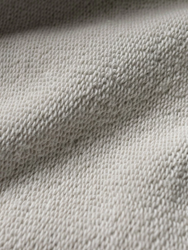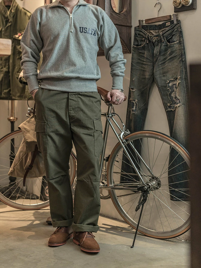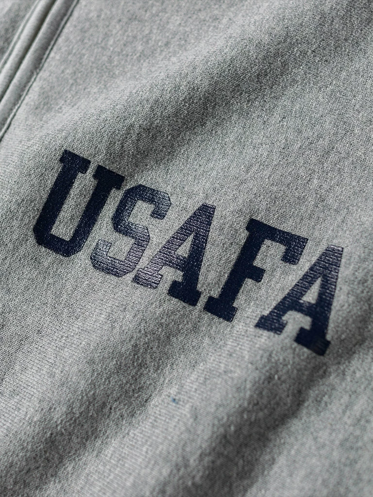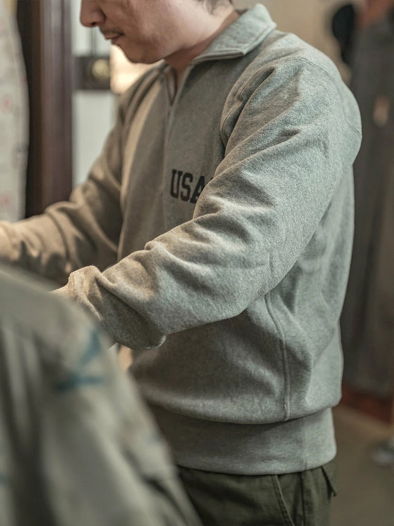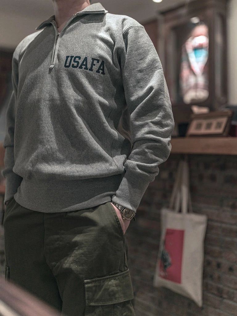 Based on the 1950s US AIR Force Academy training sweatshirt, it has a slightly looser sport cut, made of 17.63 oz of 100% cotton terry cloth with a half-zipper at the neck.