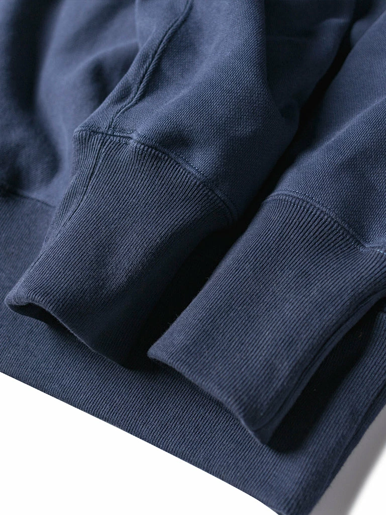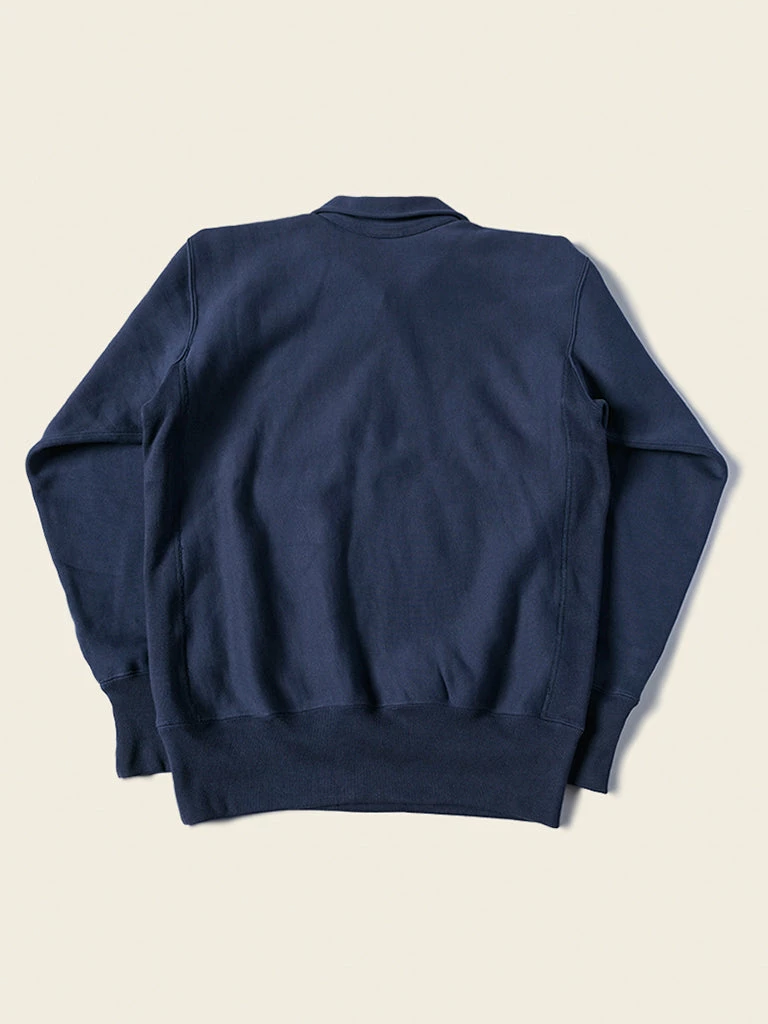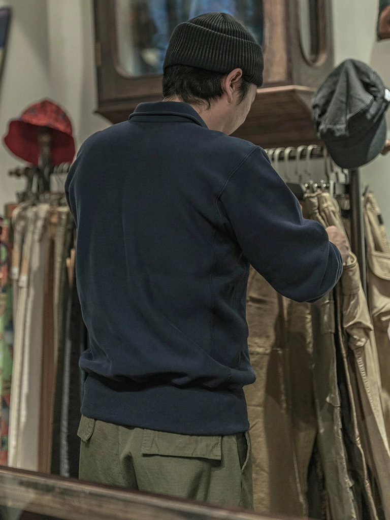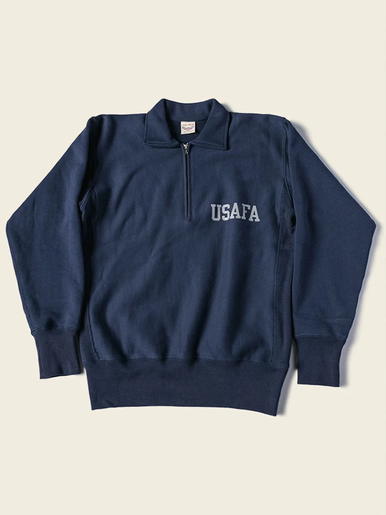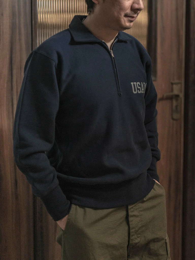 Based on the 1950s US AIR Force Academy training sweatshirt, it has a slightly looser sport cut, made of 17.63 oz of 100% cotton terry cloth with a half-zipper at the neck.
