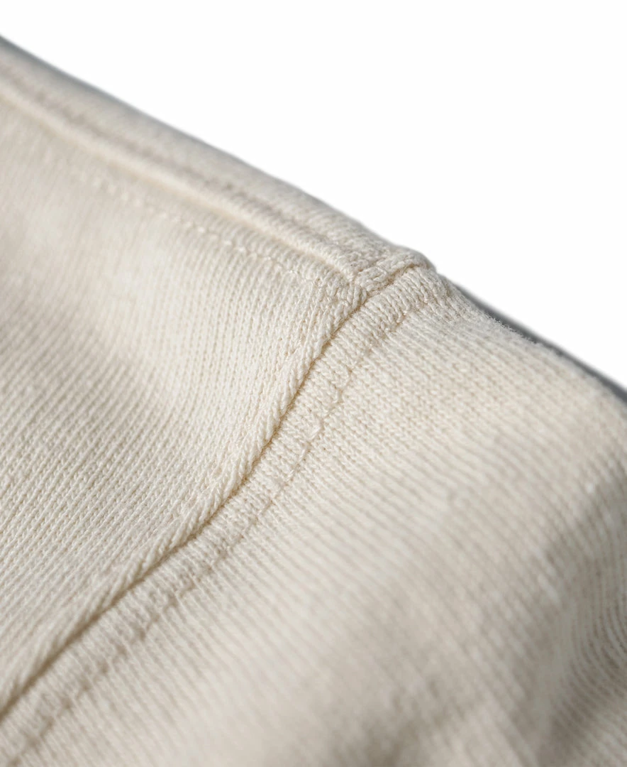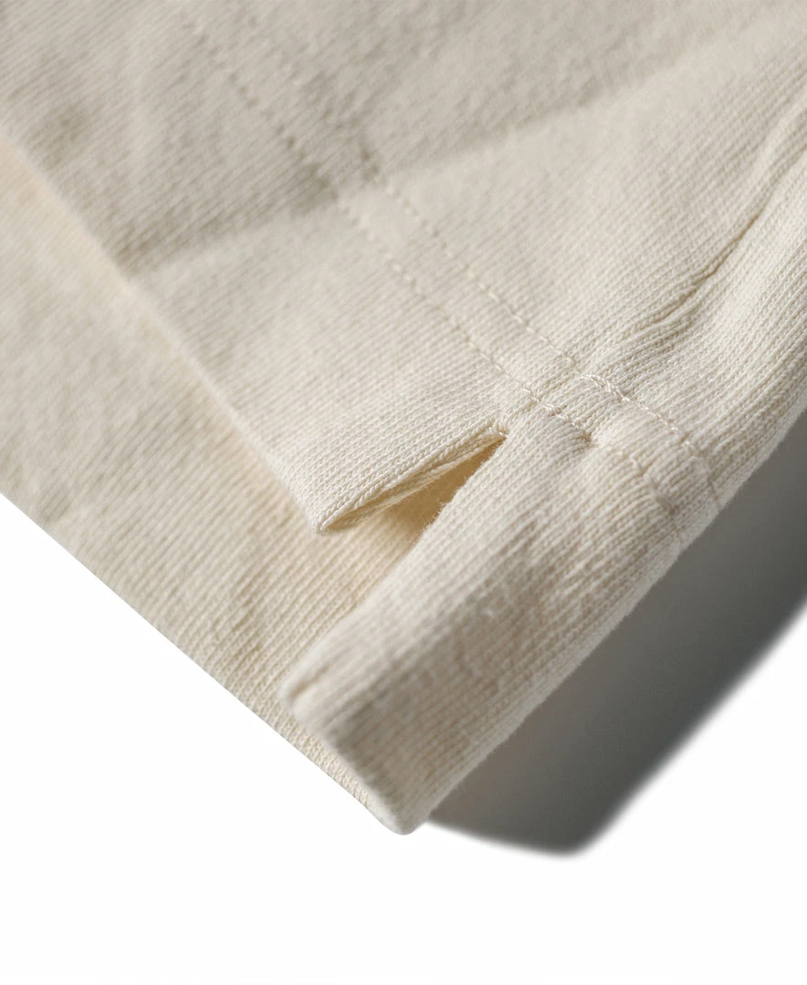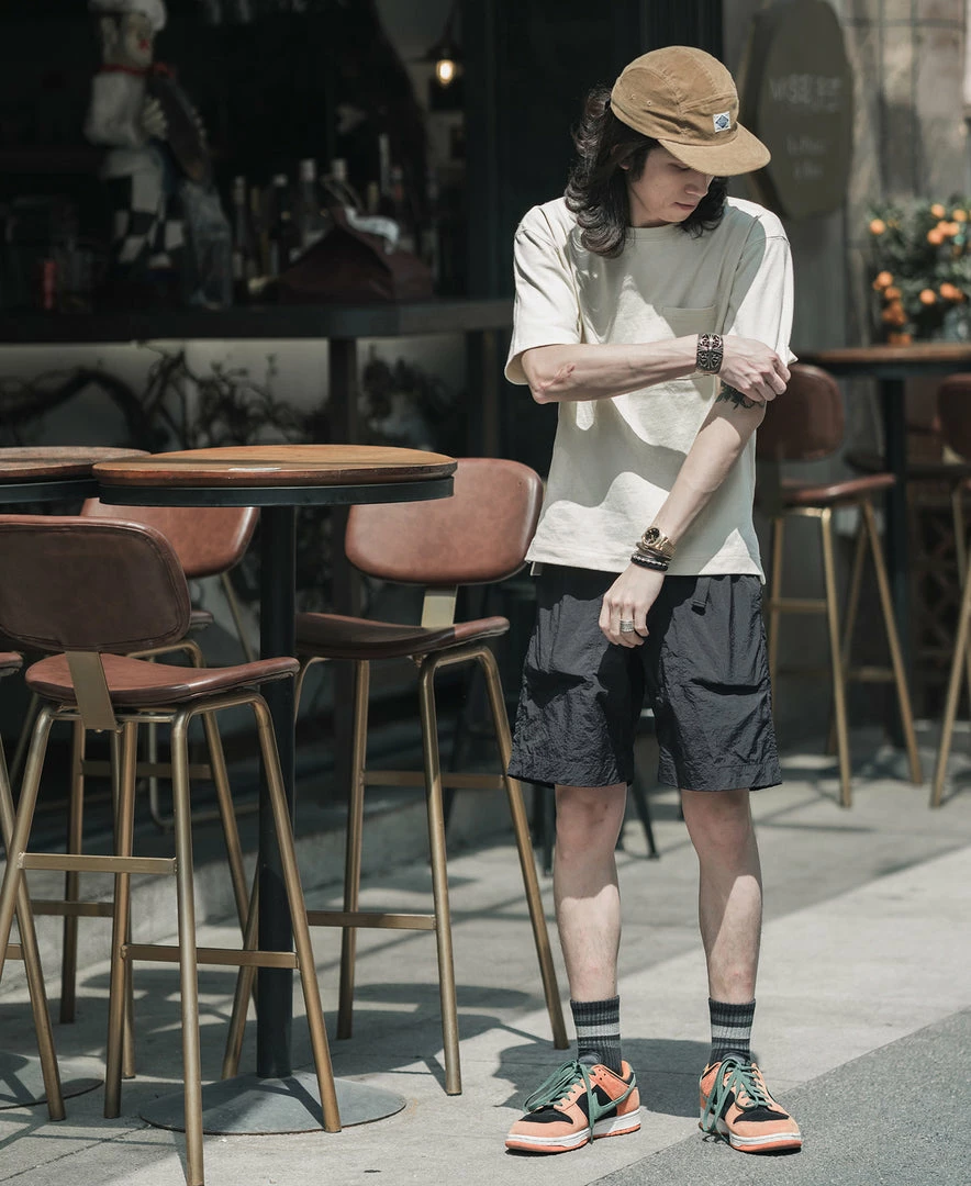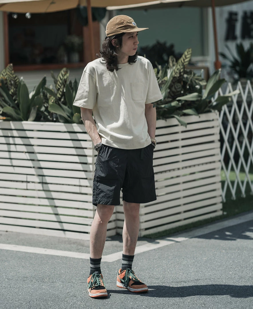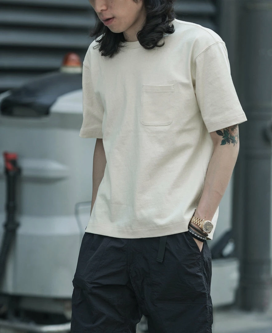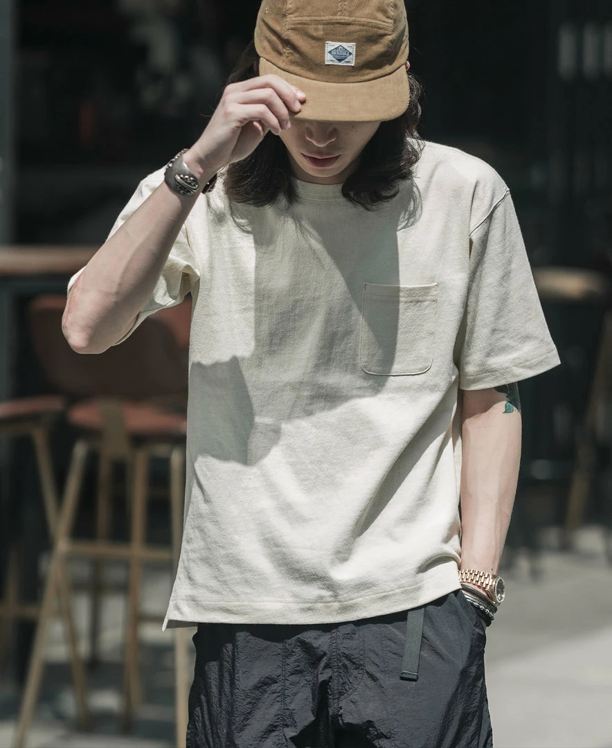 With a vintage-inspired loose fit, dropped shoulders, a U-shaped chest pocket and a split hem, this is the kind of T-shirt that’ll never go out of style. Made of roving cotton fabric, the fabric has a strong texture and a rough touch, just like blending flax into the fabric.
