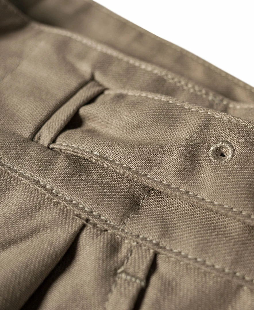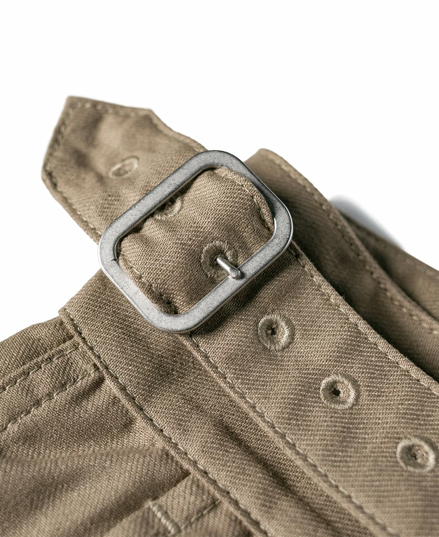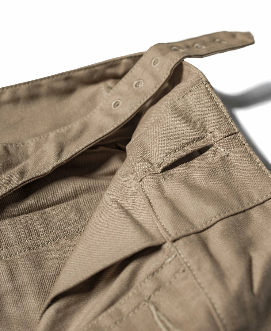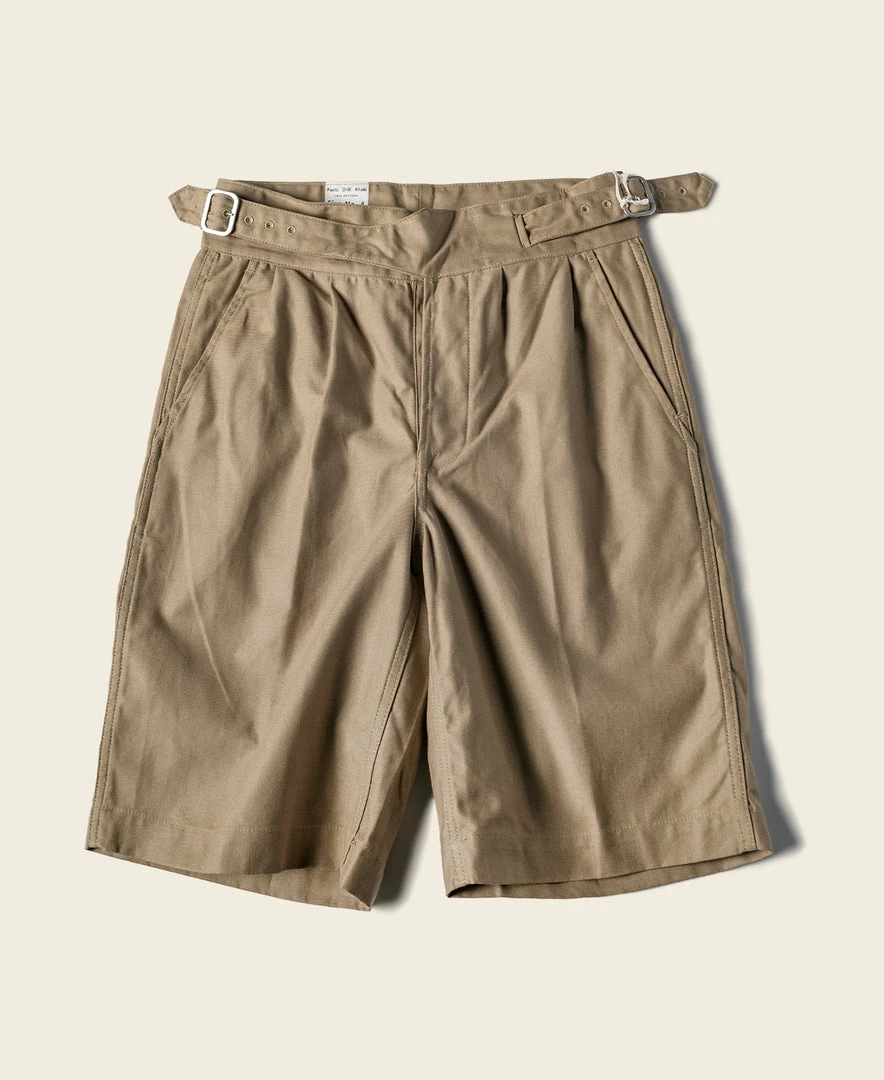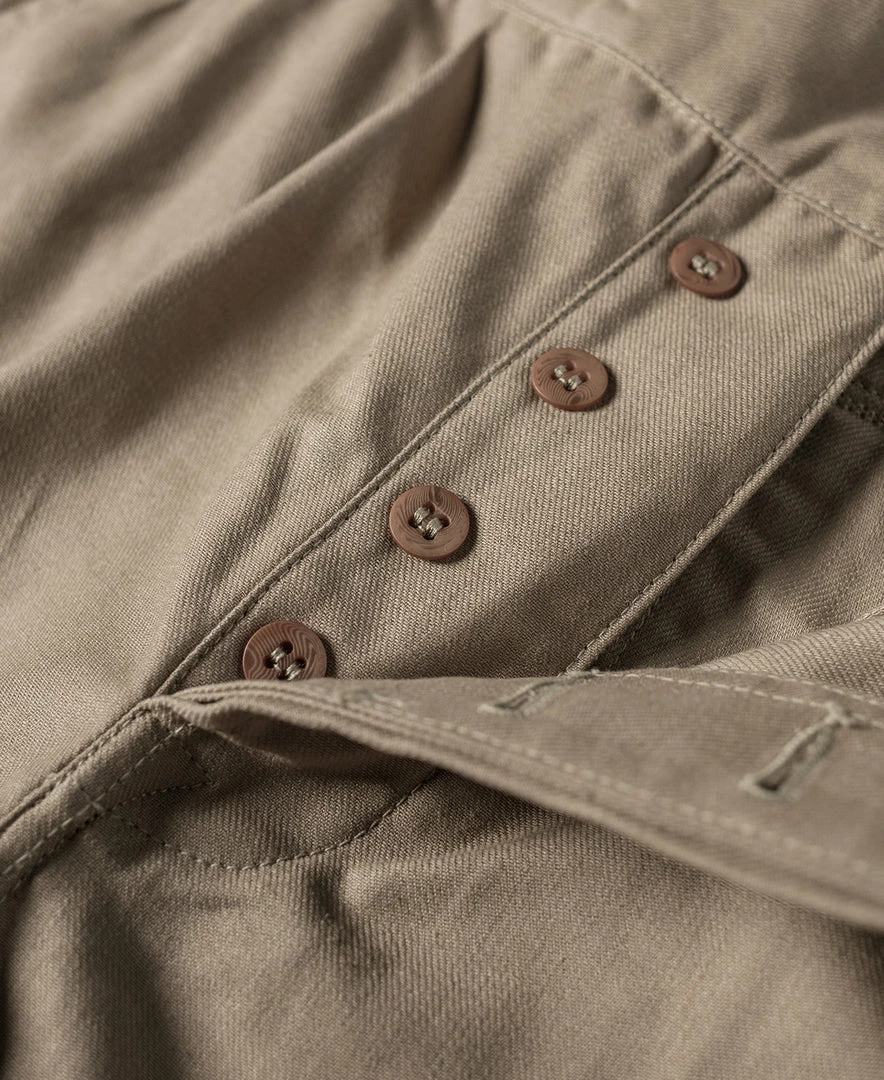 The Gurkha trouser was borne out of this alliance as well – rooted in British military tradition but explicitly modified for use by the Nepalese. The pant is defined by its double-pleated front and high, cummerbund-style waistband with buckle fastenings.