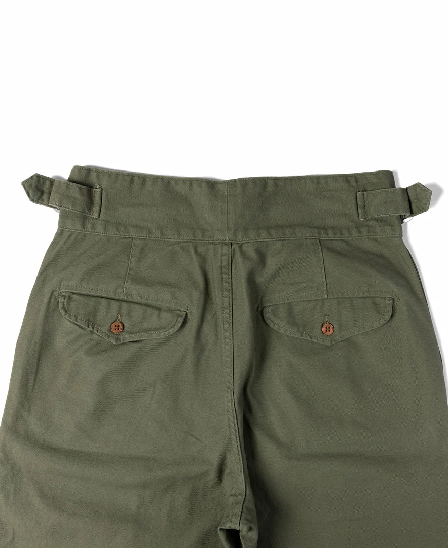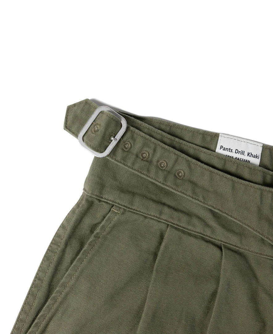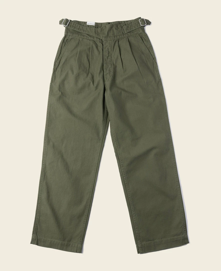 The Gurkha trouser was borne out of this alliance as well – rooted in British military tradition but explicitly modified for use by the Nepalese. The pant is defined by its double-pleated front and high, cummerbund-style waistband with buckle fastenings.
