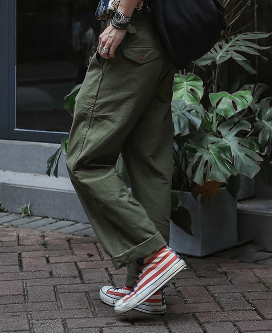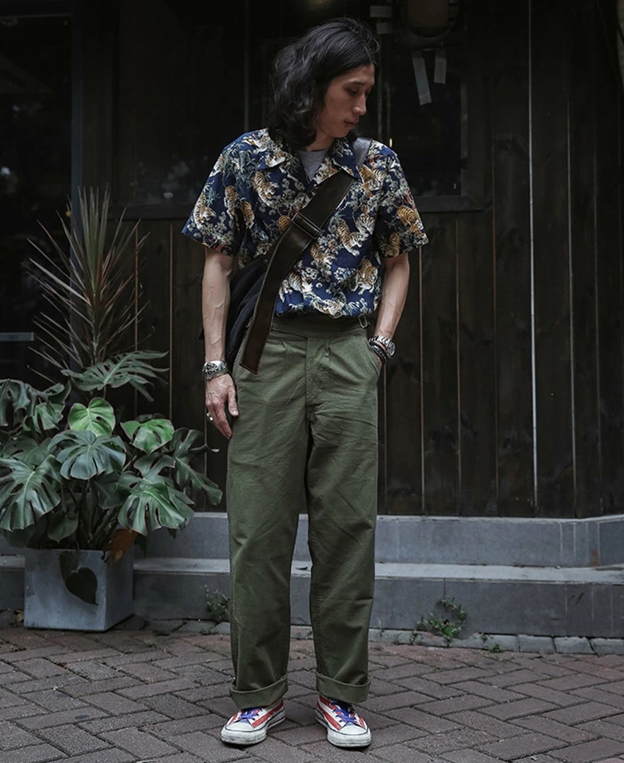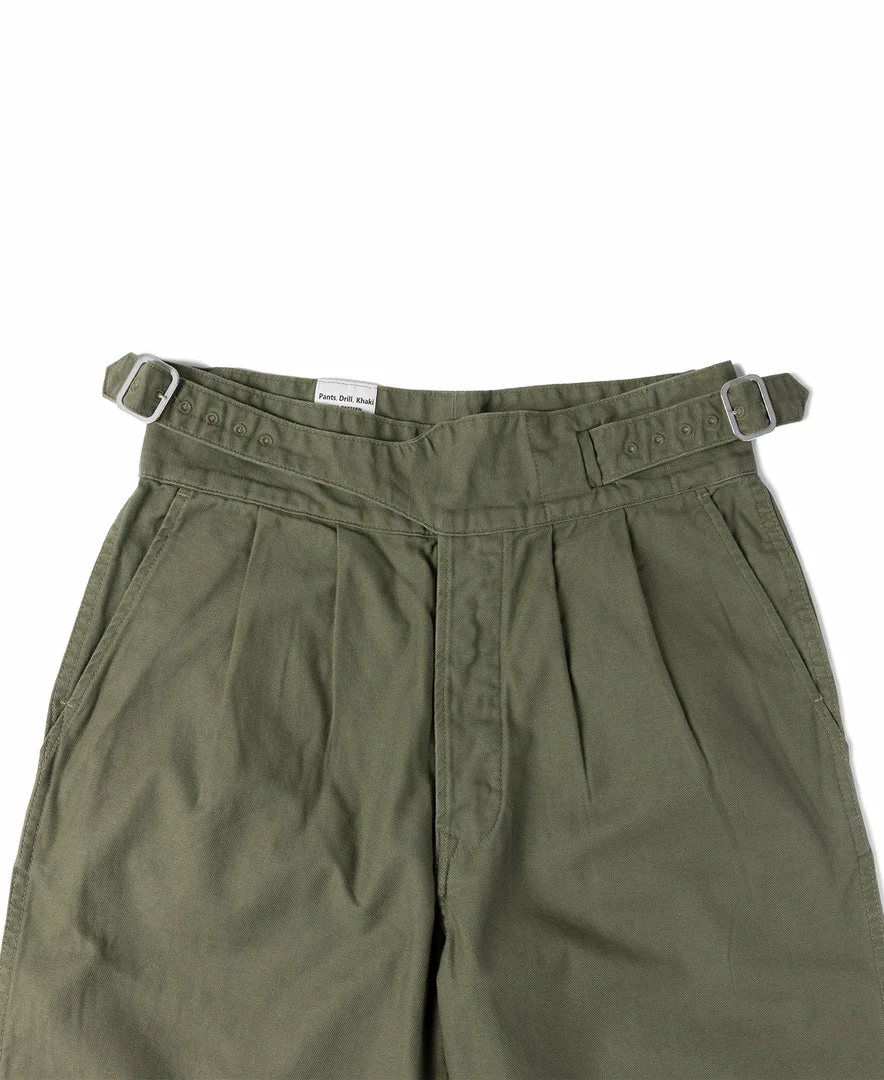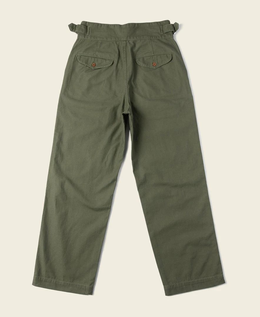 The Gurkha trouser was borne out of this alliance as well – rooted in British military tradition but explicitly modified for use by the Nepalese. The pant is defined by its double-pleated front and high, cummerbund-style waistband with buckle fastenings.