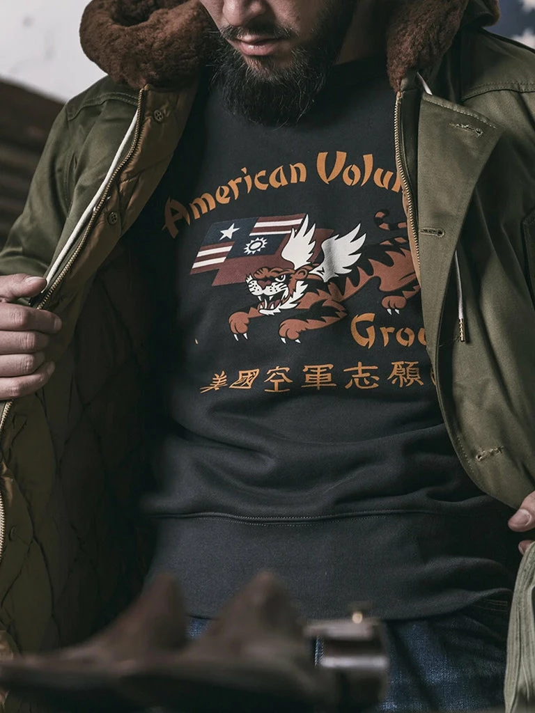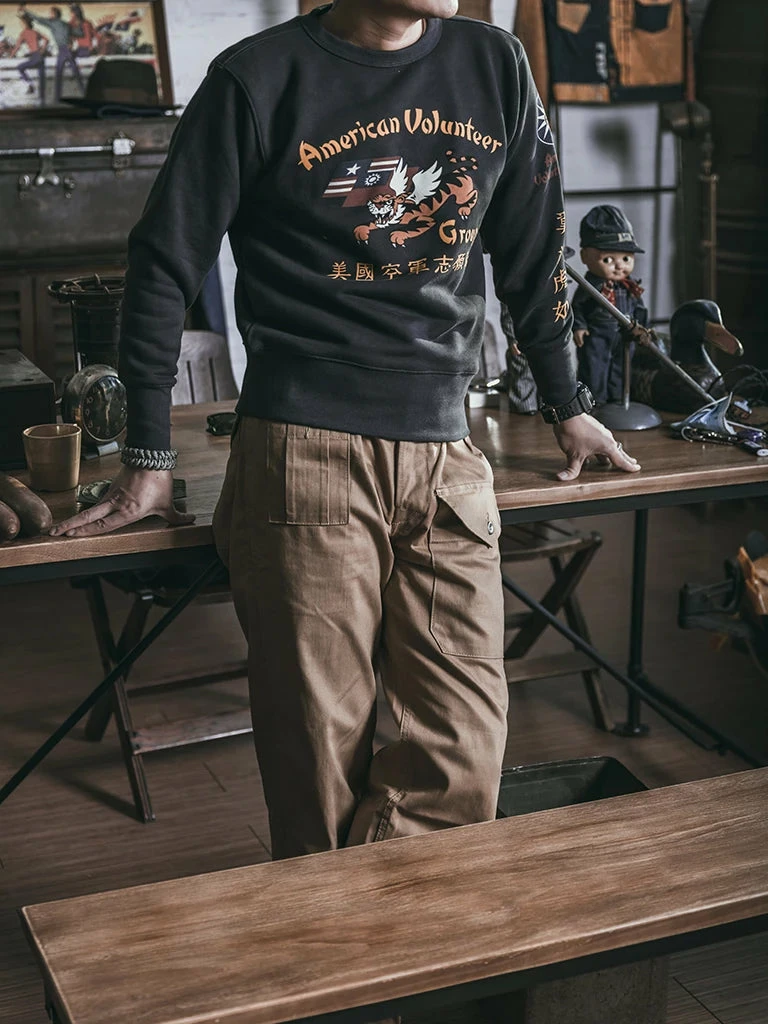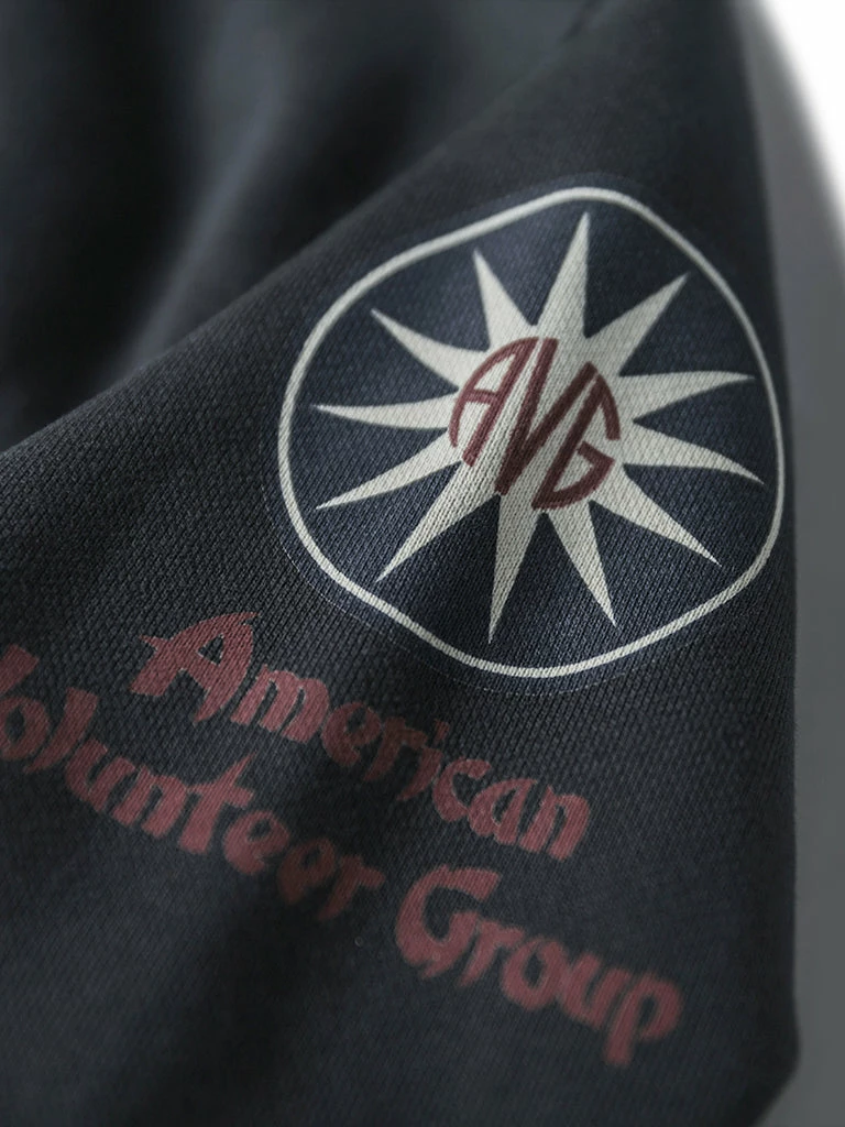 This sweatshirt is made of 17.5 oz terry cloth with a “Flying Tigers” pattern printed on the chest. It’s soft, has no static electricity, can be worn close to the skin, and has good elasticity. The sewing technology adopts the classical sewing process: overlocking and then interlocking. Compared with an ordinary single overlock, it’s stronger and more beautiful.
