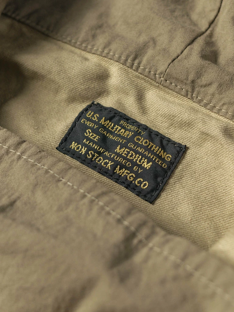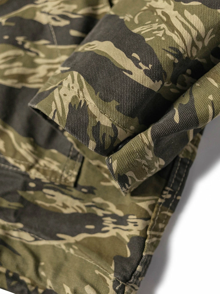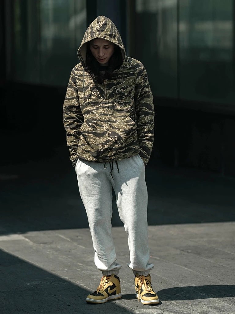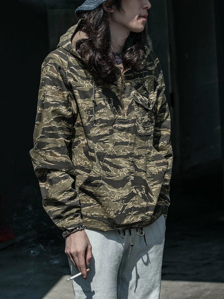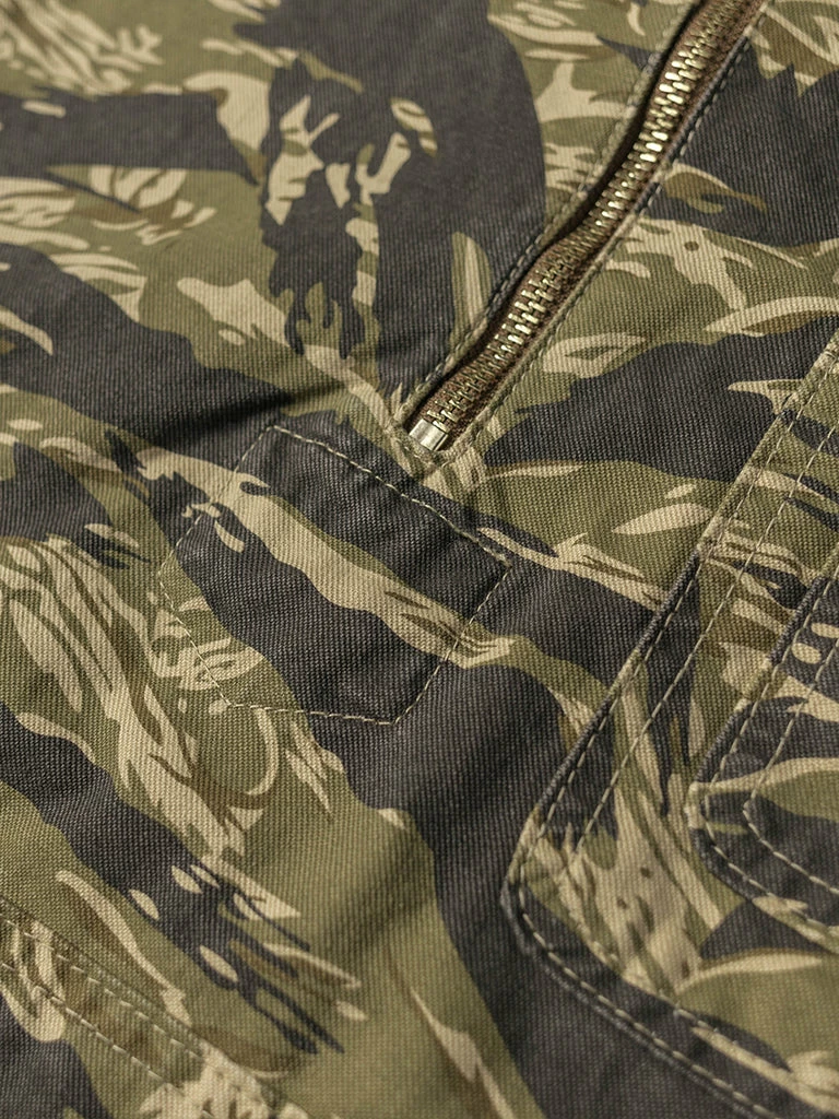 Based on jungle raincoat smock. This smock has a loose silhouette, a huge hood, a small chest pocket for important items, a large pocket at the waist (Through the type), and a drawstring to tighten the hem. This smock adopts the famous golden tiger stripe in the Vietnam War’s tiger camouflage, adopts cotton twill fabric and multiple color printing process, and has a retro charm after long washing and fading.