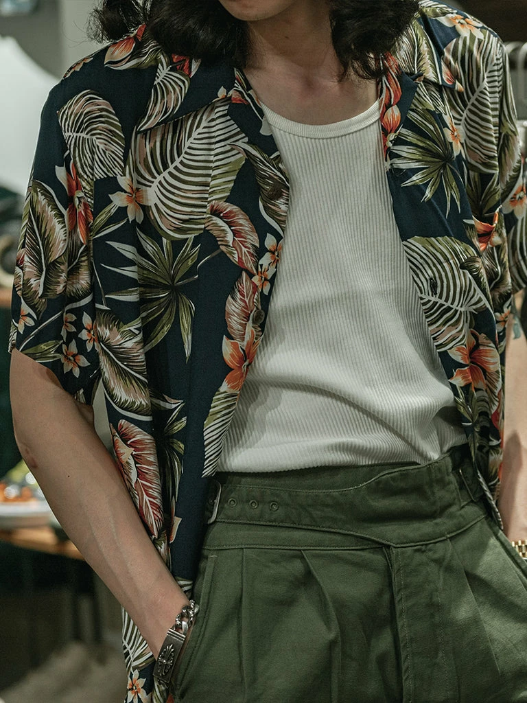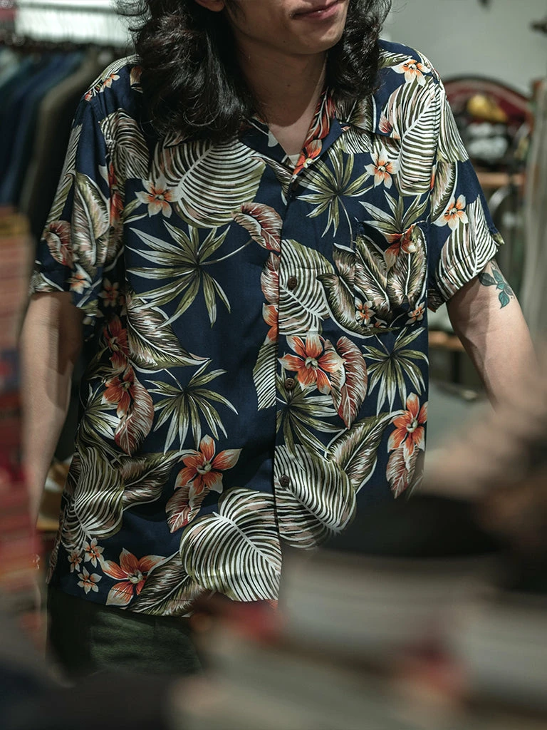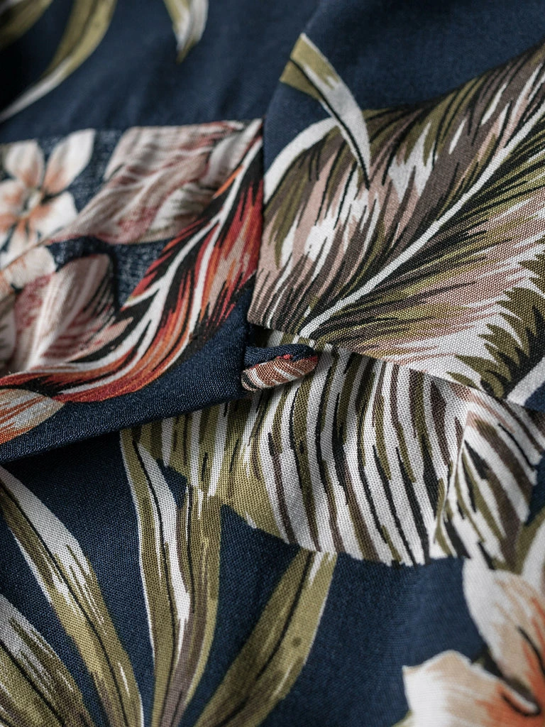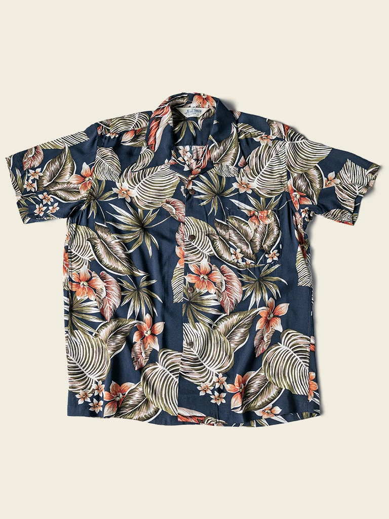The shirt’s design retains the authenticity and quality of Hawaiian shirts from the golden era of the style. It is made from rayon which has a tactile quality and liveliness to it like no other fabric, and with plants and flowers pattern. There’s a single chest pocket, a great place to put sunglasses or a similarly sized object. It can be worn alone or open over a tee.