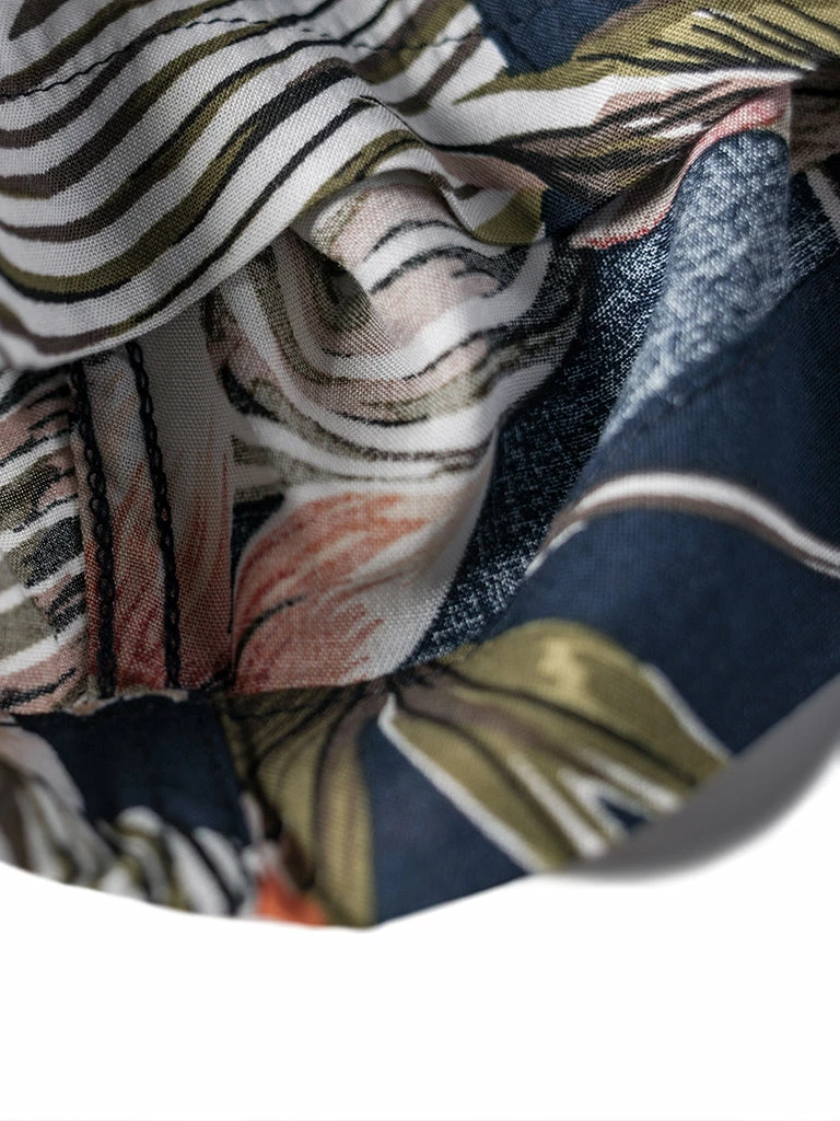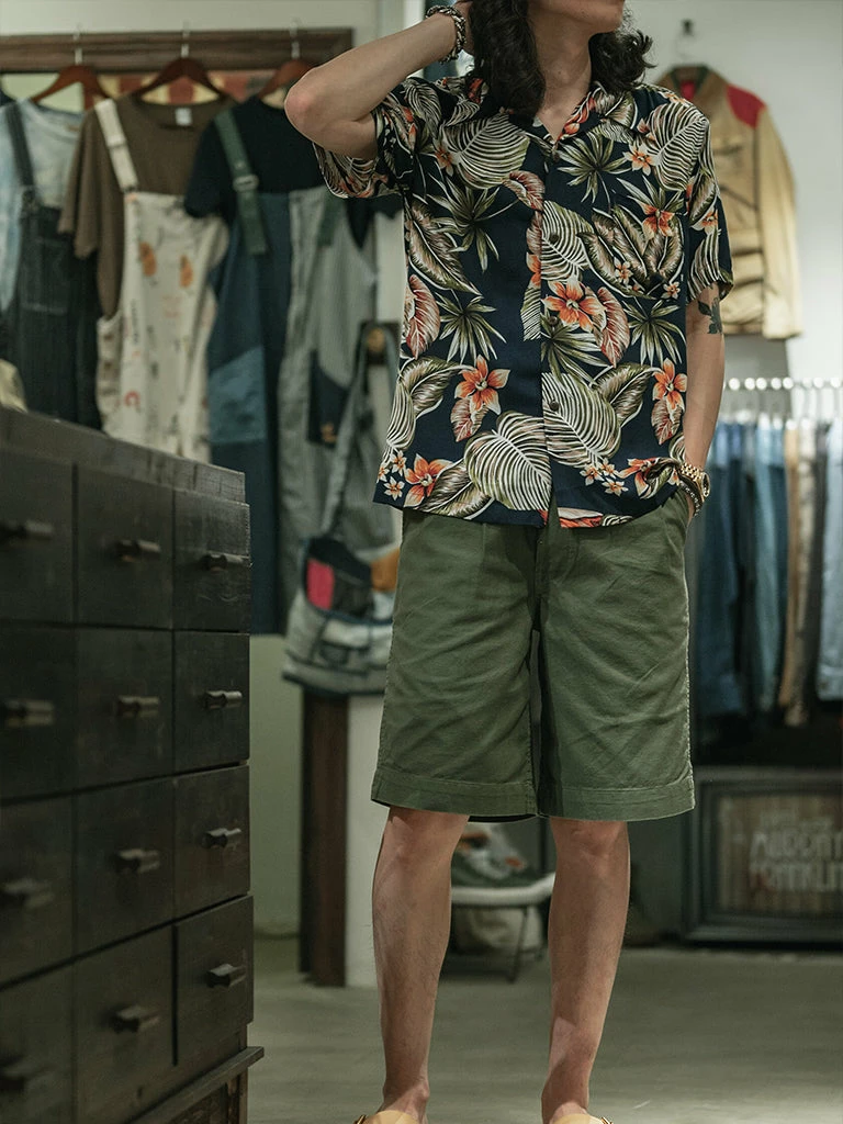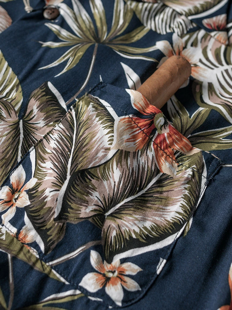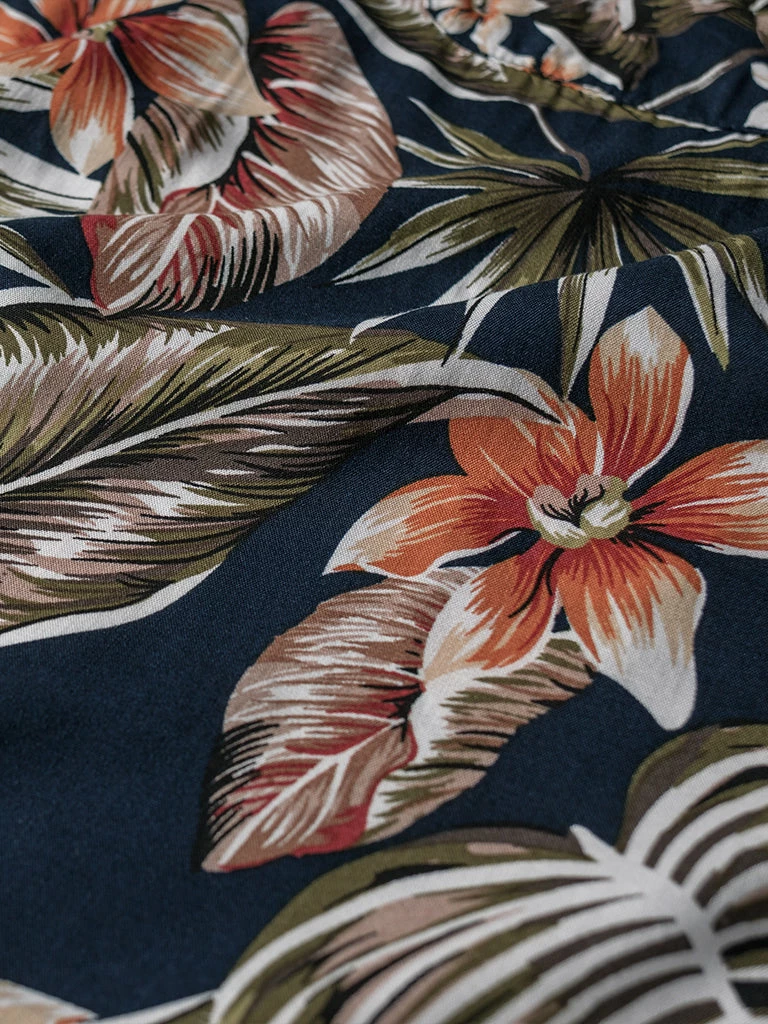 The shirt’s design retains the authenticity and quality of Hawaiian shirts from the golden era of the style. It is made from rayon which has a tactile quality and liveliness to it like no other fabric, and with plants and flowers pattern. There’s a single chest pocket, a great place to put sunglasses or a similarly sized object. It can be worn alone or open over a tee.
