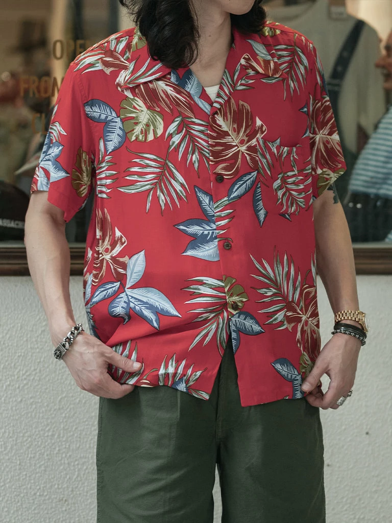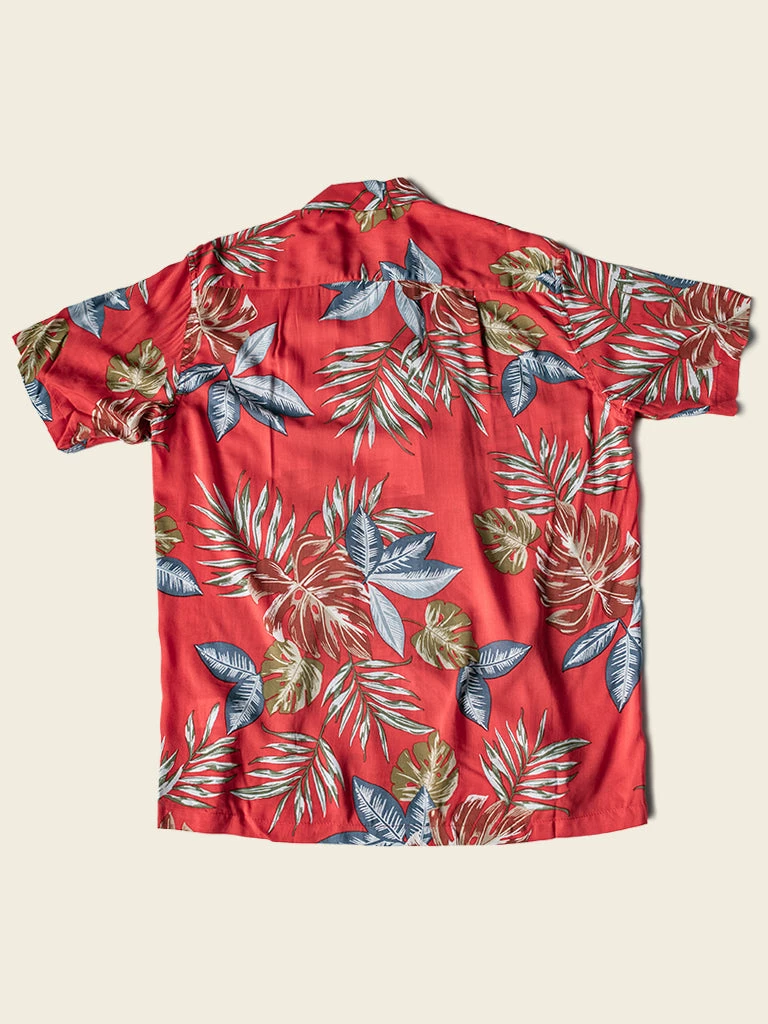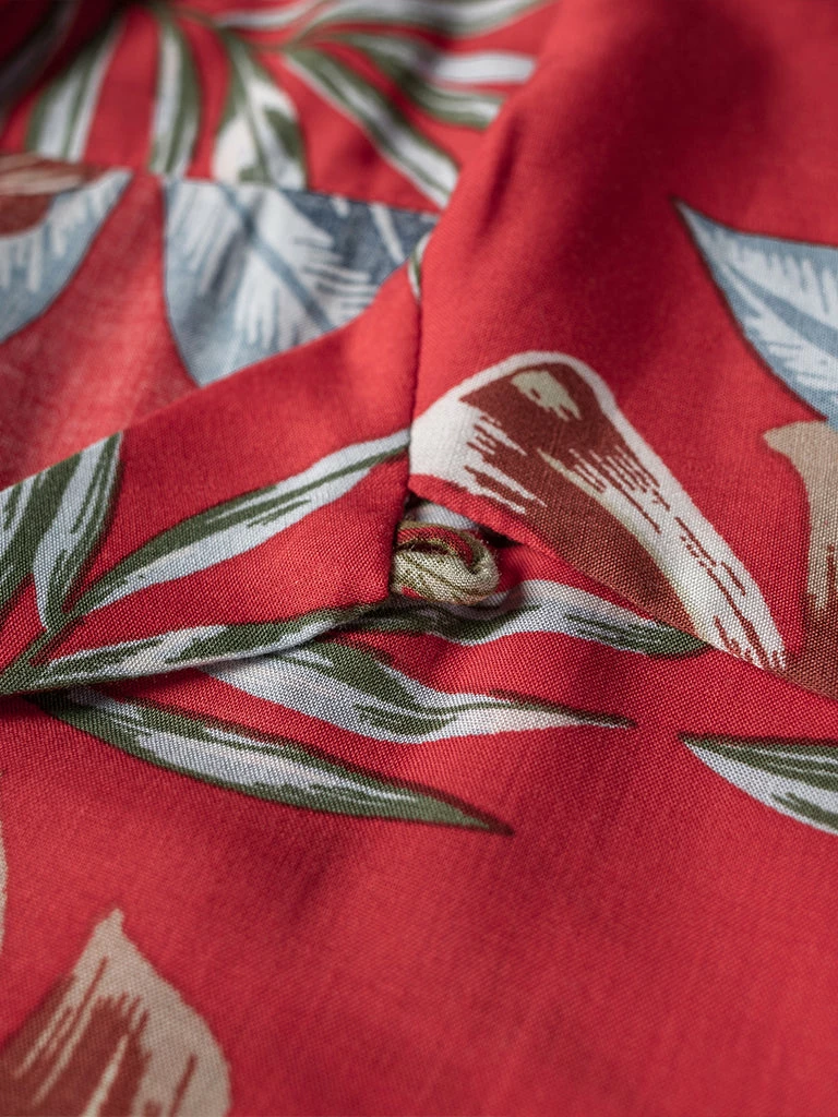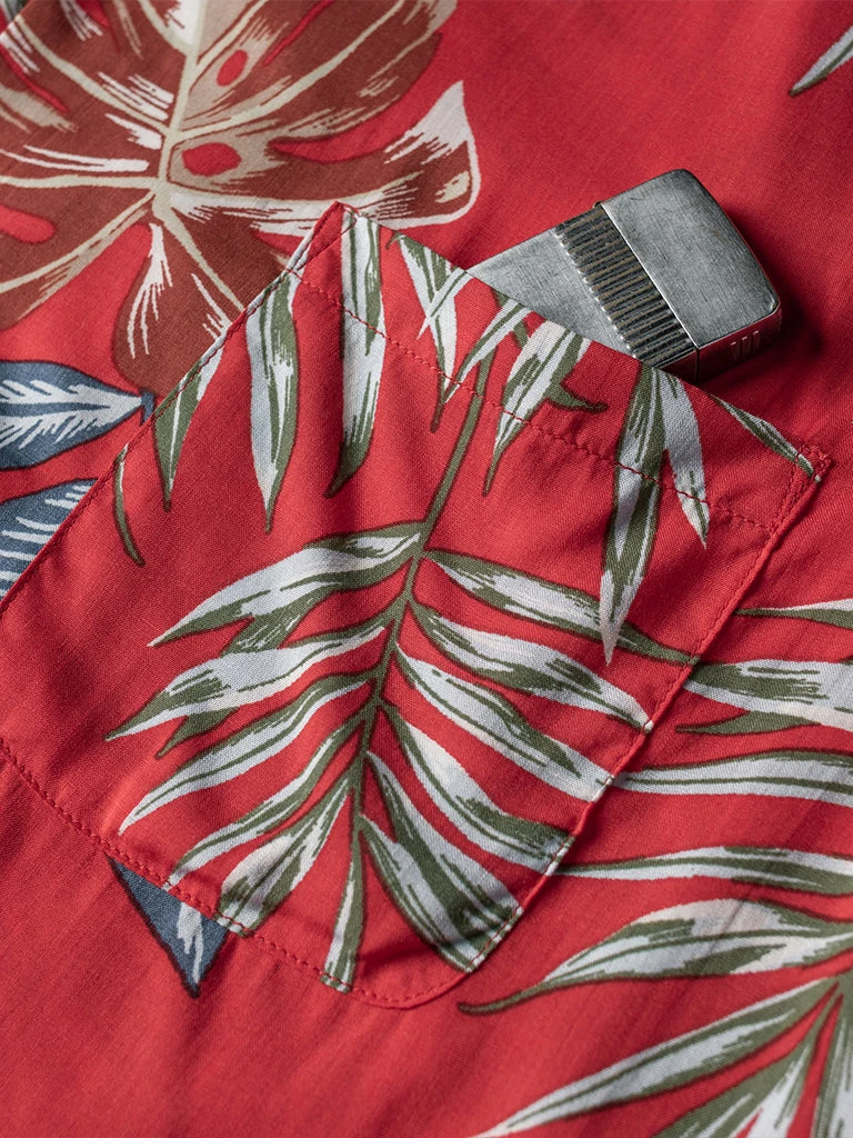 The shirt’s design retains the authenticity and quality of Hawaiian shirts from the golden era of the style. It is made from rayon which has a tactile quality and liveliness to it like no other fabric, and with plants and flowers pattern. There’s a single chest pocket, a great place to put sunglasses or a similarly sized object. It can be worn alone or open over a tee.