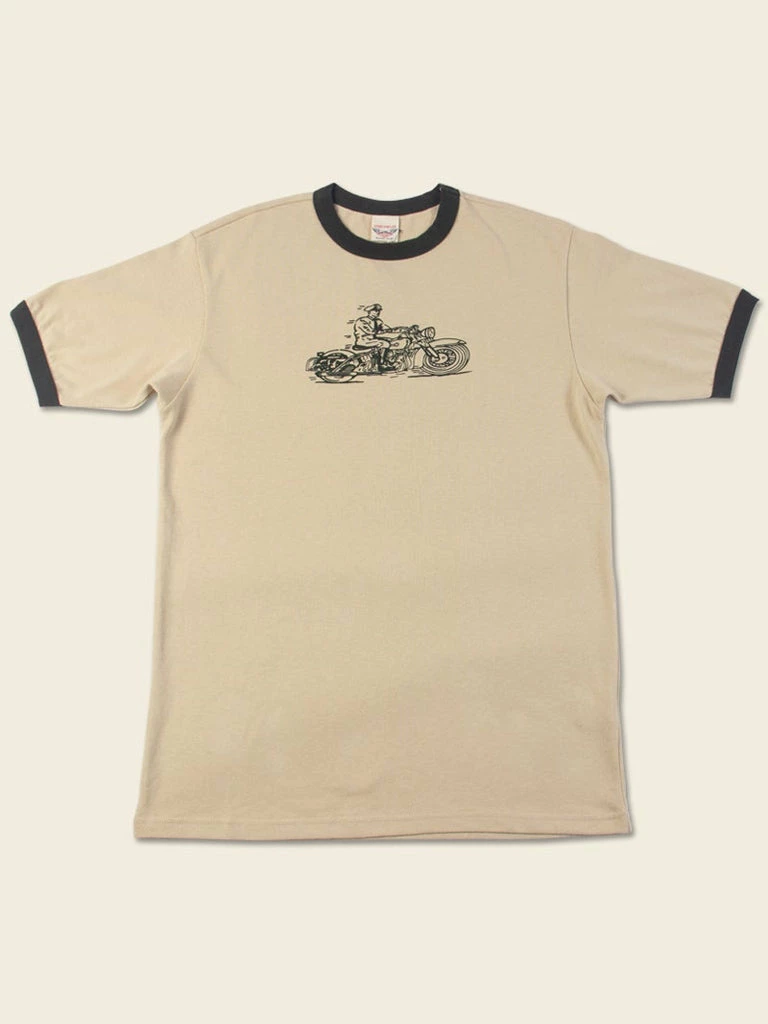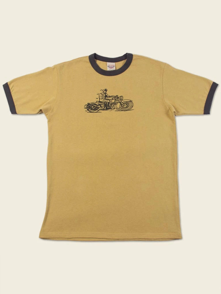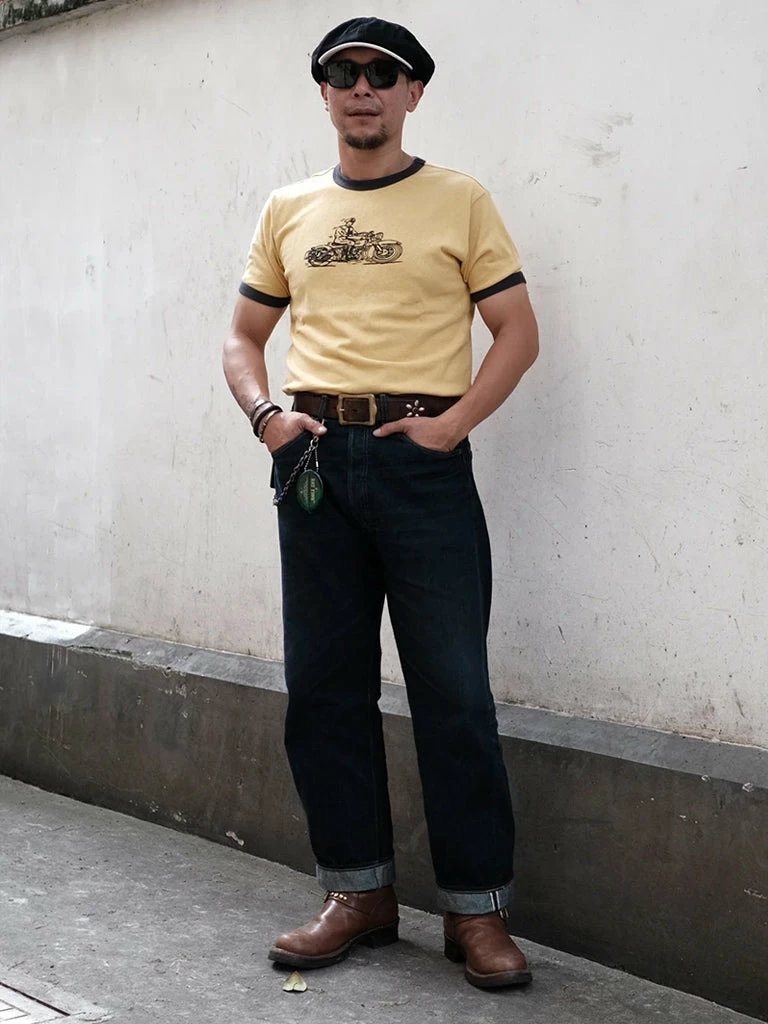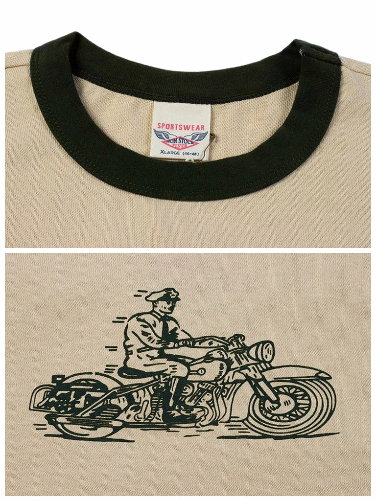 This is a motorcycle-style print t-shirt. It is made of heavyweight 9.3 oz linen cotton. It has been garment wash, has good air permeability, and is very comfortable.
