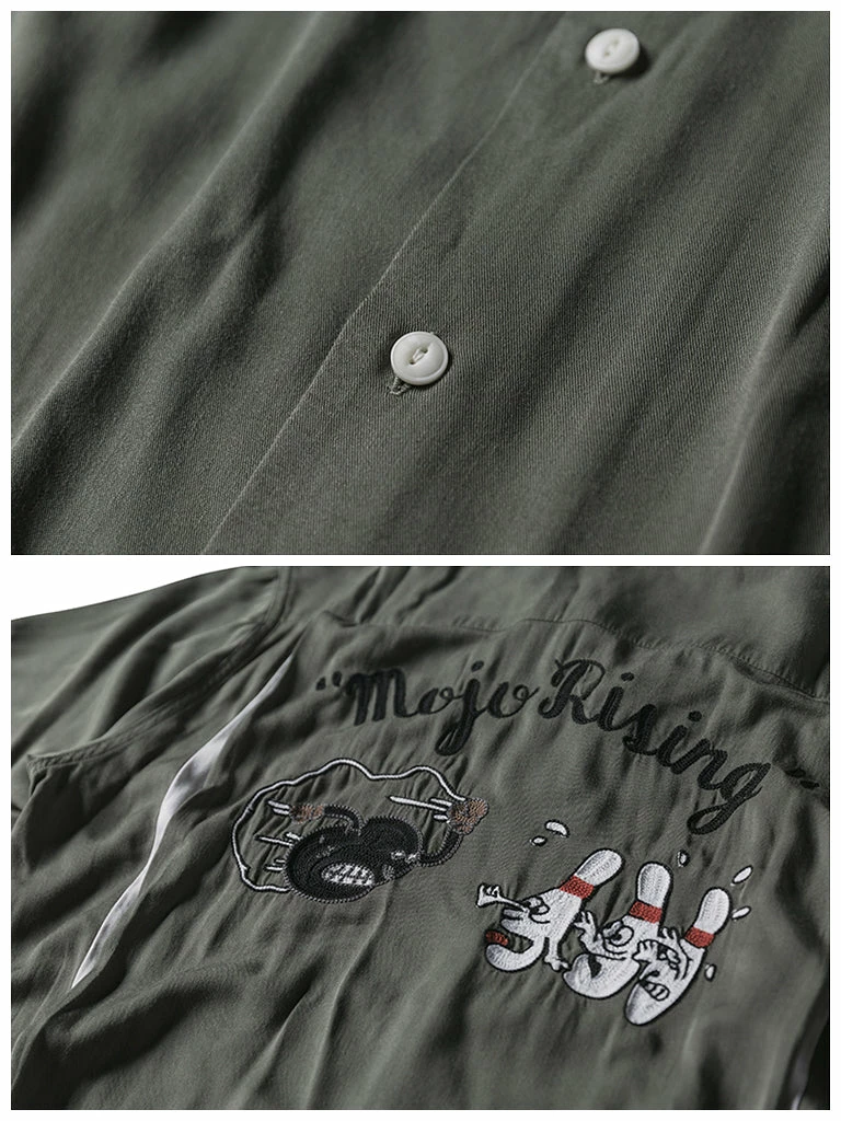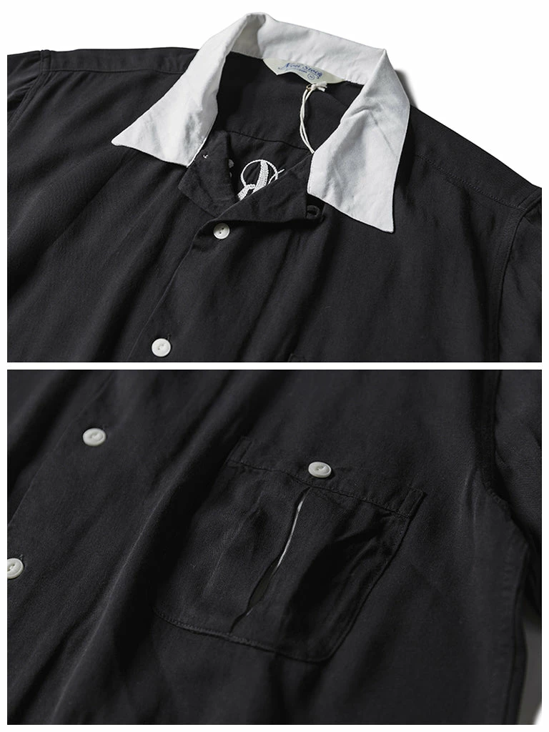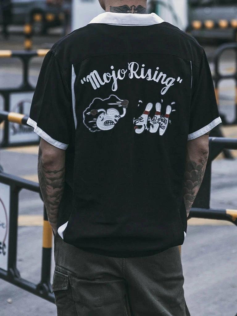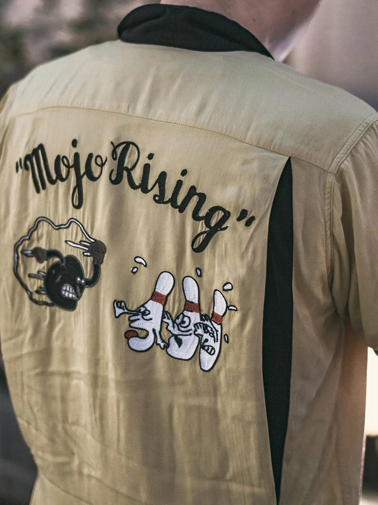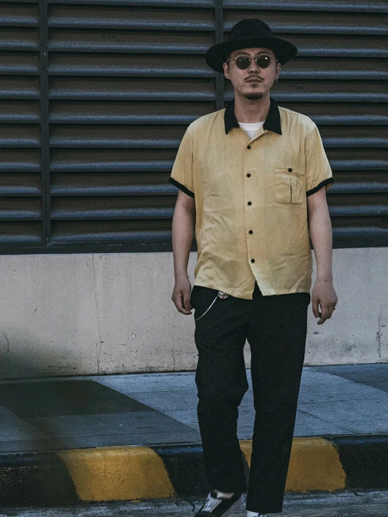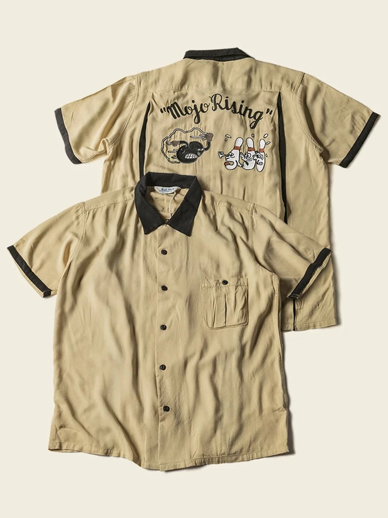 Classic bowling shirts with contrasting necklines and cuffs, sporting ruffles on the back, also feature contrasting colors.
