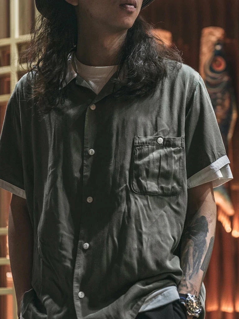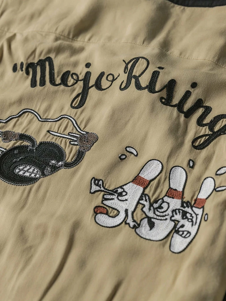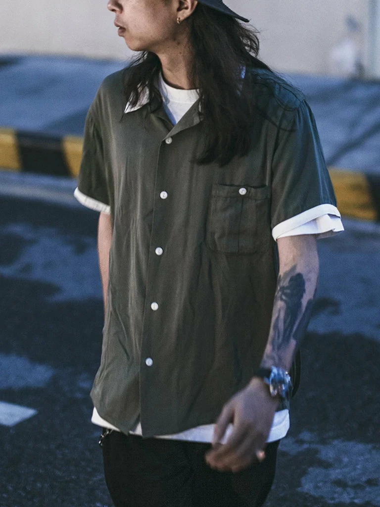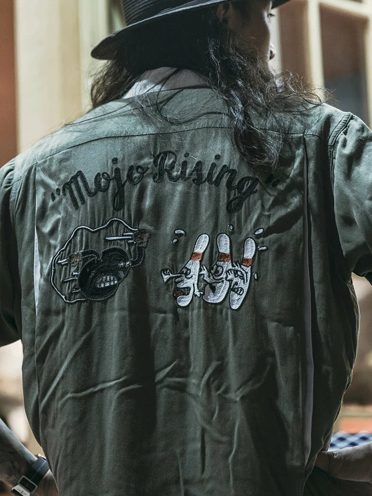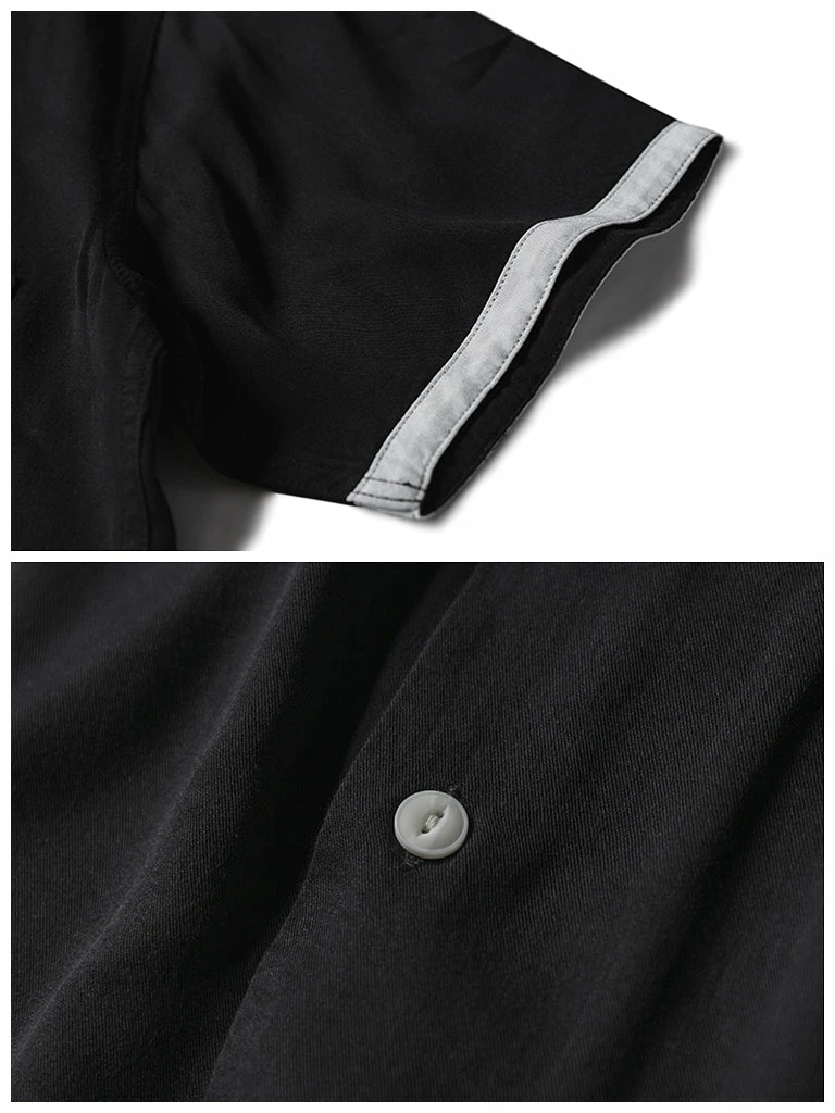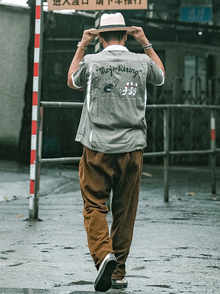 Classic bowling shirts with contrasting necklines and cuffs, sporting ruffles on the back, also feature contrasting colors.