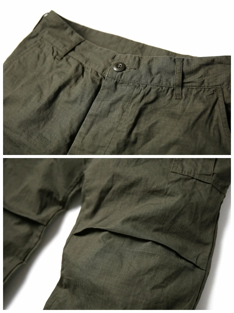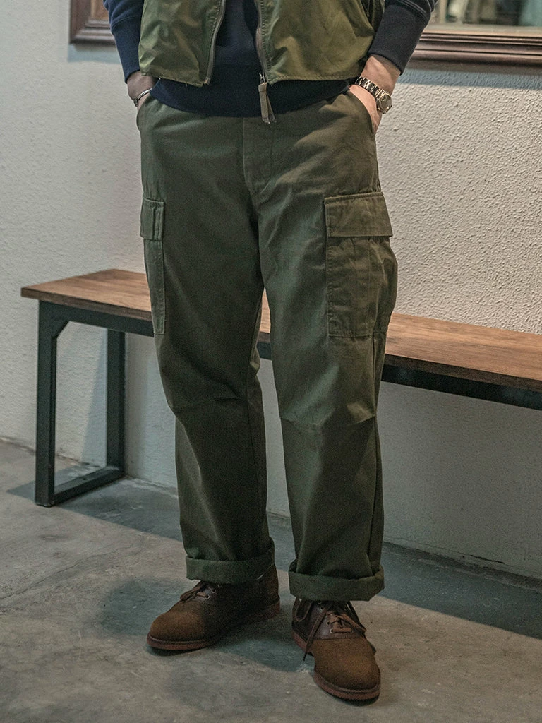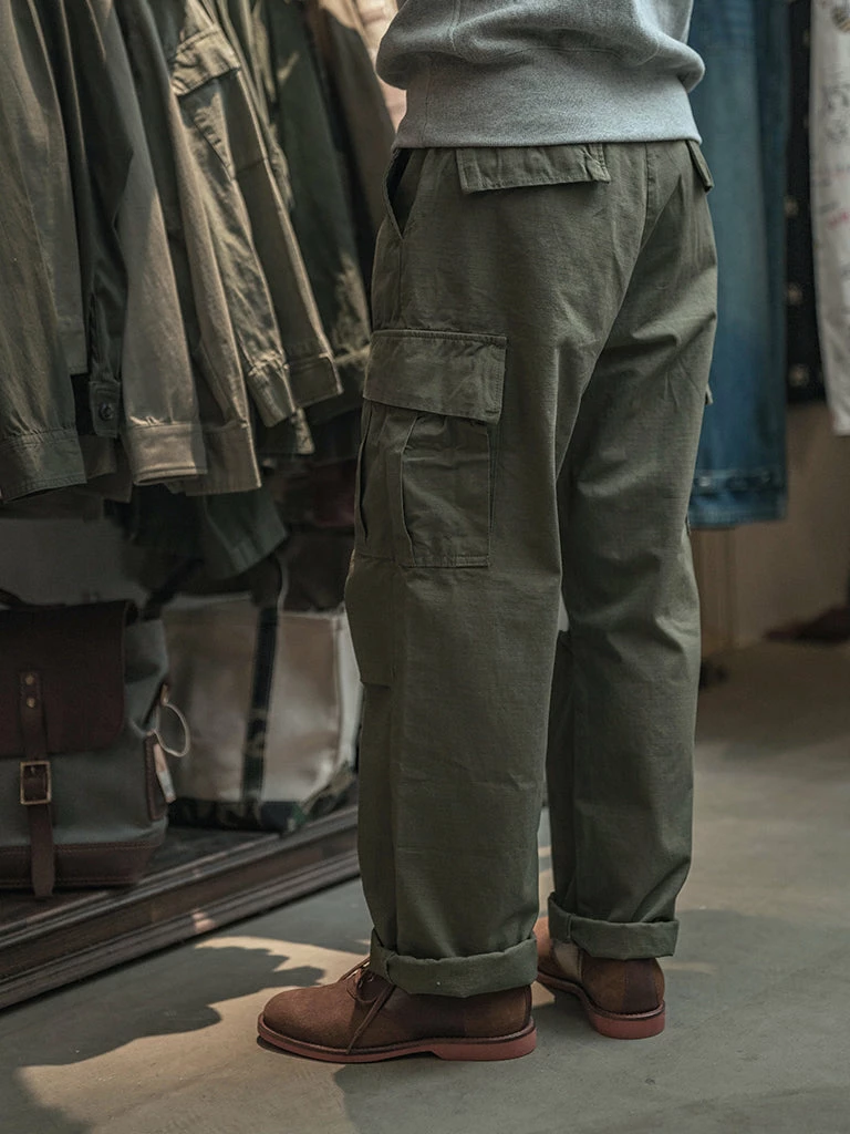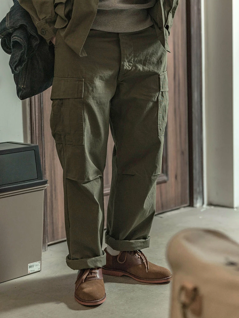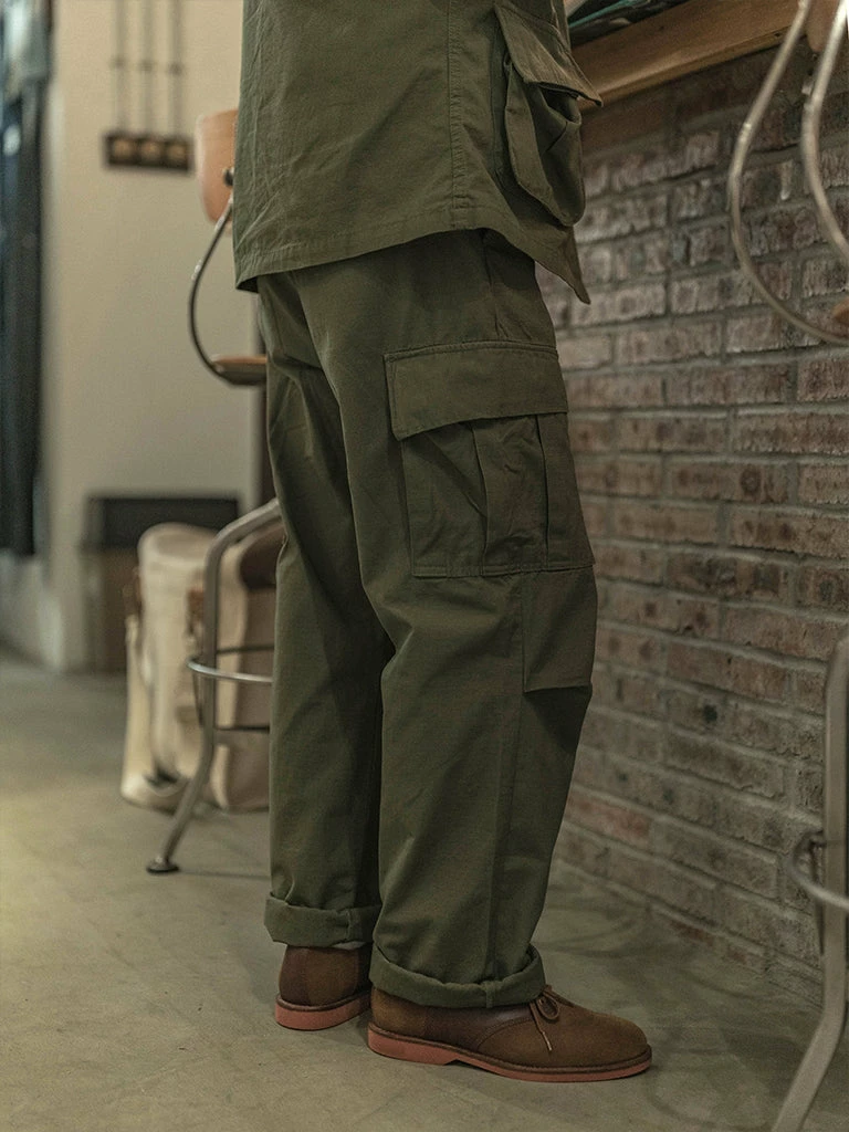 Based on the 1969 5th Tropical Combat Pants, the epaulet and adjustable waistband were removed. The ripstop fabric introduced in 1968 was used. With hidden type pocket buttons, the drawstring was removed inside the pocket and add pleats at the knees. These pants are very close to the original in both color and texture.