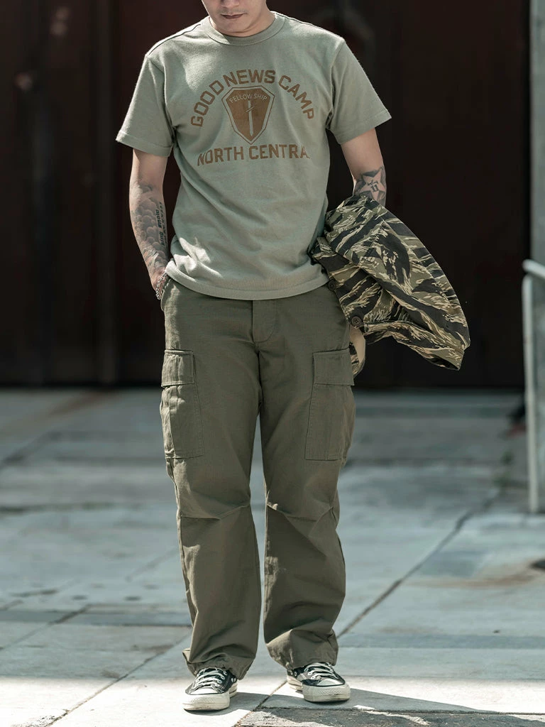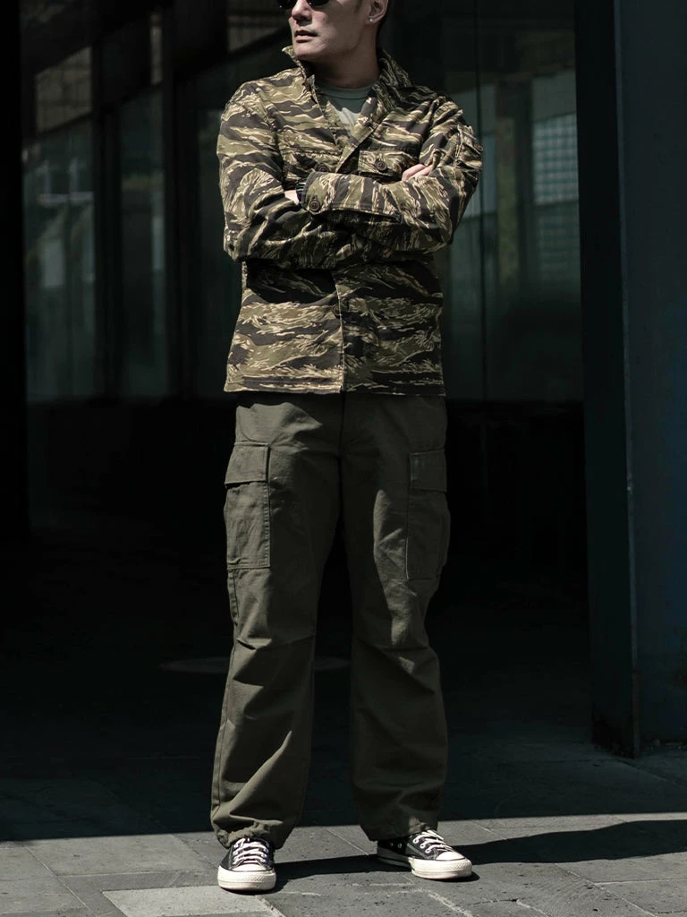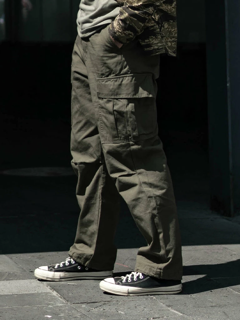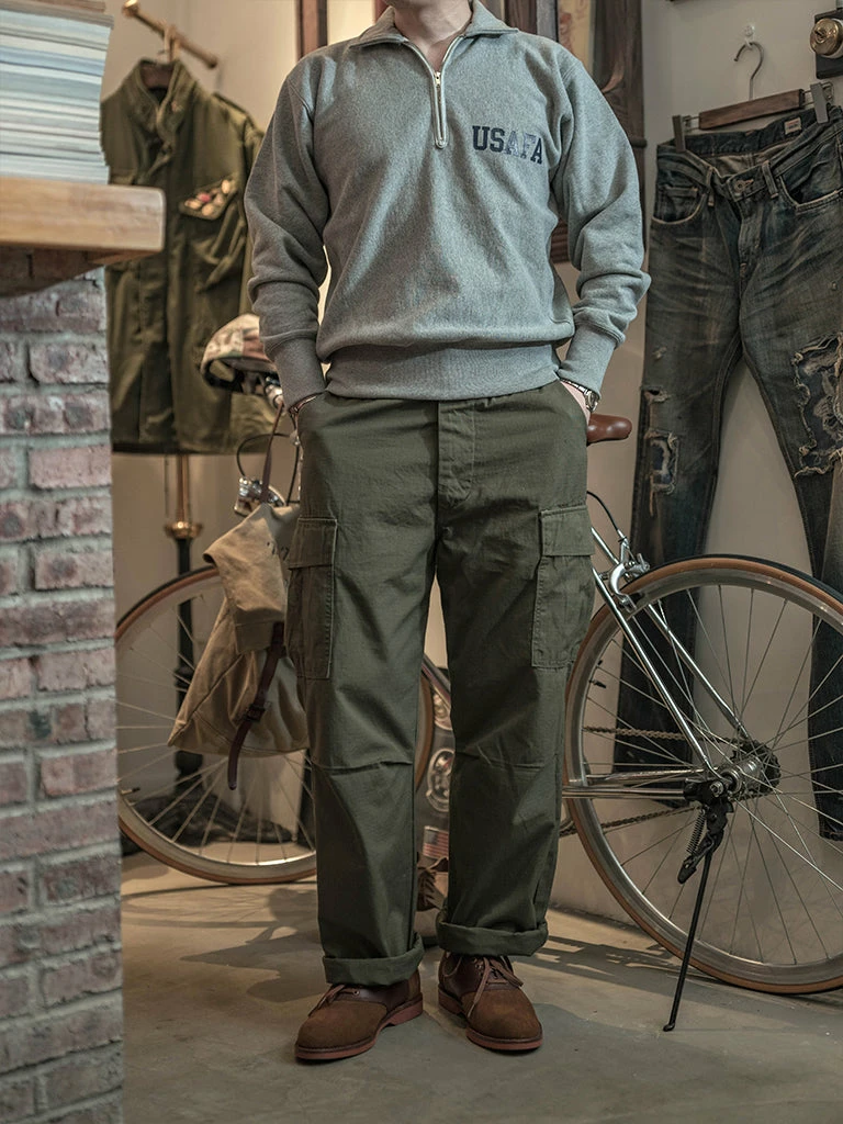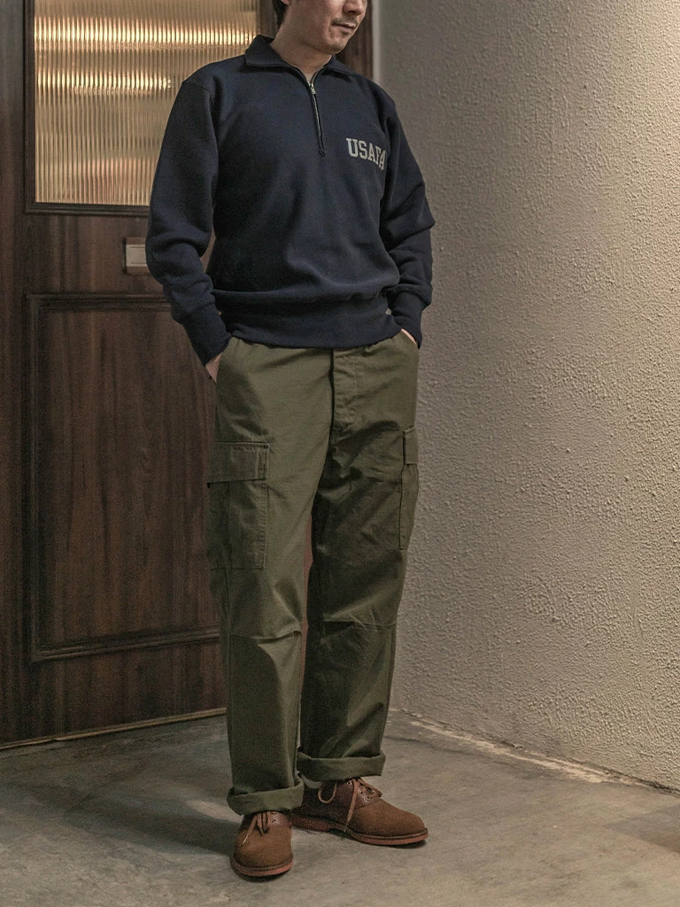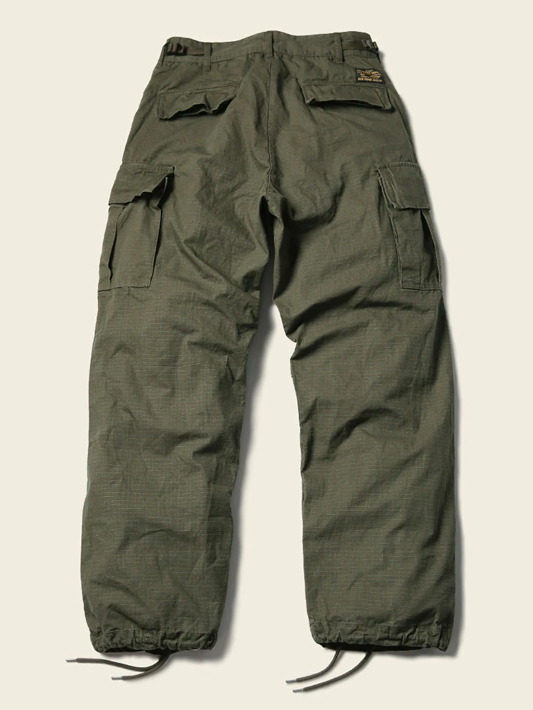 Based on the 1969 5th Tropical Combat Pants, the epaulet and adjustable waistband were removed. The ripstop fabric introduced in 1968 was used. With hidden type pocket buttons, the drawstring was removed inside the pocket and add pleats at the knees. These pants are very close to the original in both color and texture.